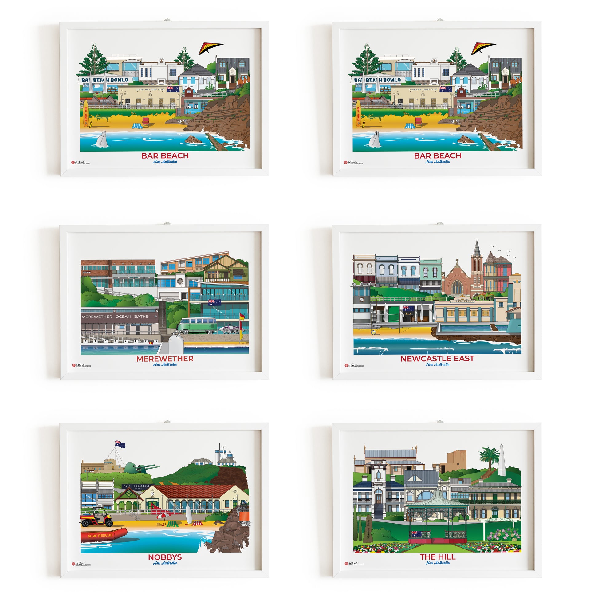 The set includes: MEREWETHER, DIXON PARK, BAR BEACH, THE HILL, NEWCASTLE EAST & NOBBYS.