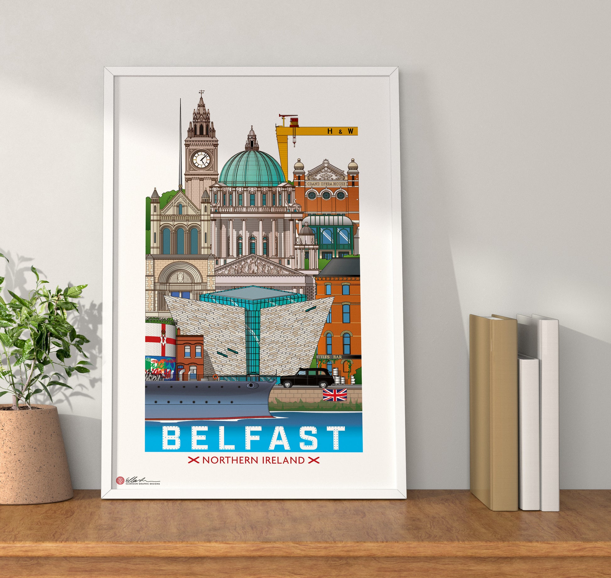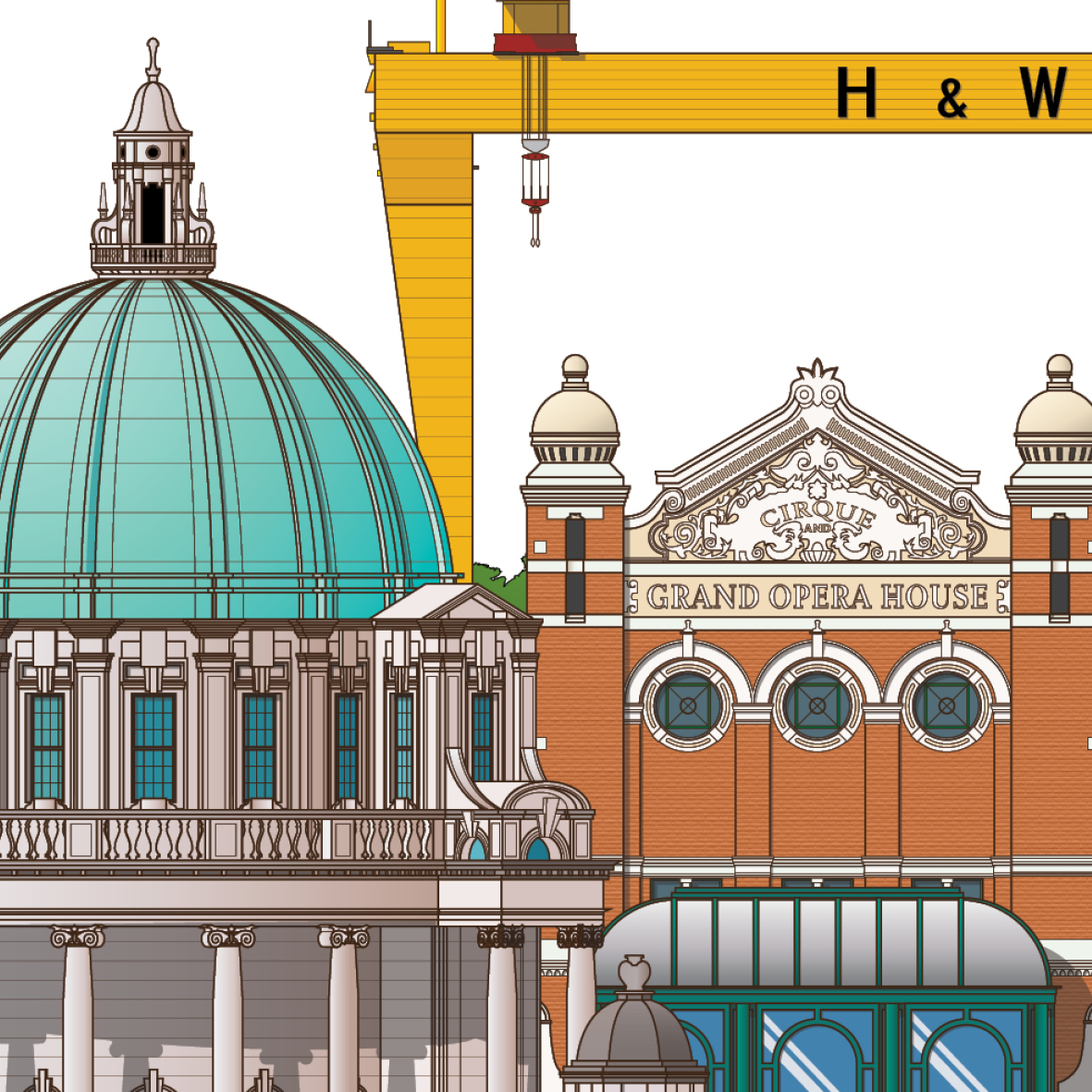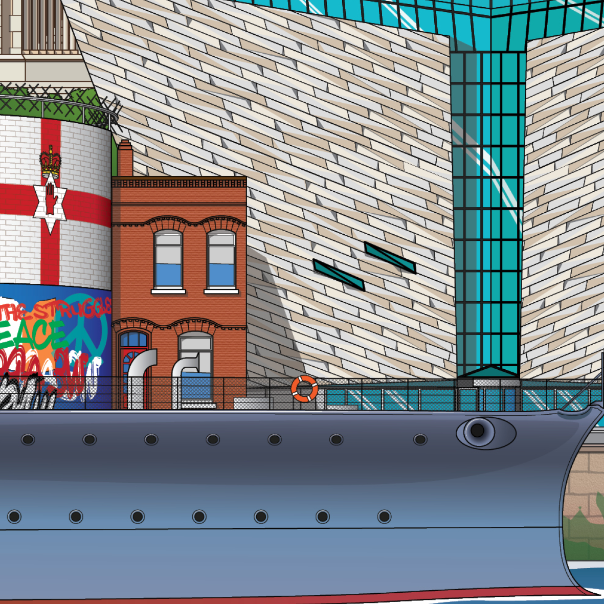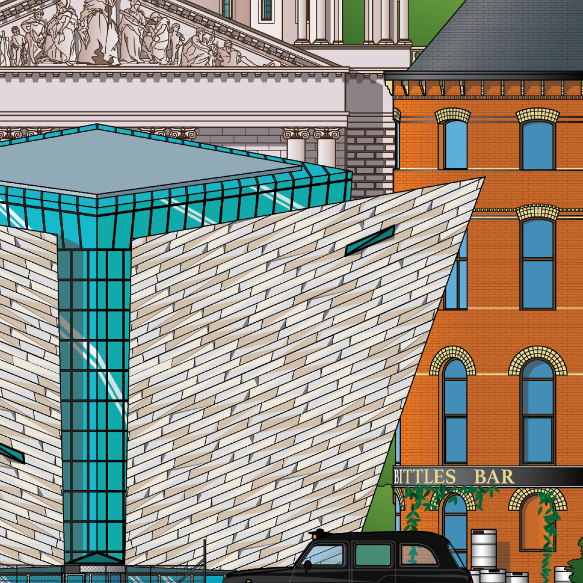 Albert Memorial Clock, Belfast City Hall, Goliath shipbuilding gantry crane, Belfast Cathedral, (Cathedral Church of St Anne), Grand Opera House, Peace Wall, Pandora St House, Titanic Belfast, Bittles Bar, Black Cab Taxi, HMS Caroline.