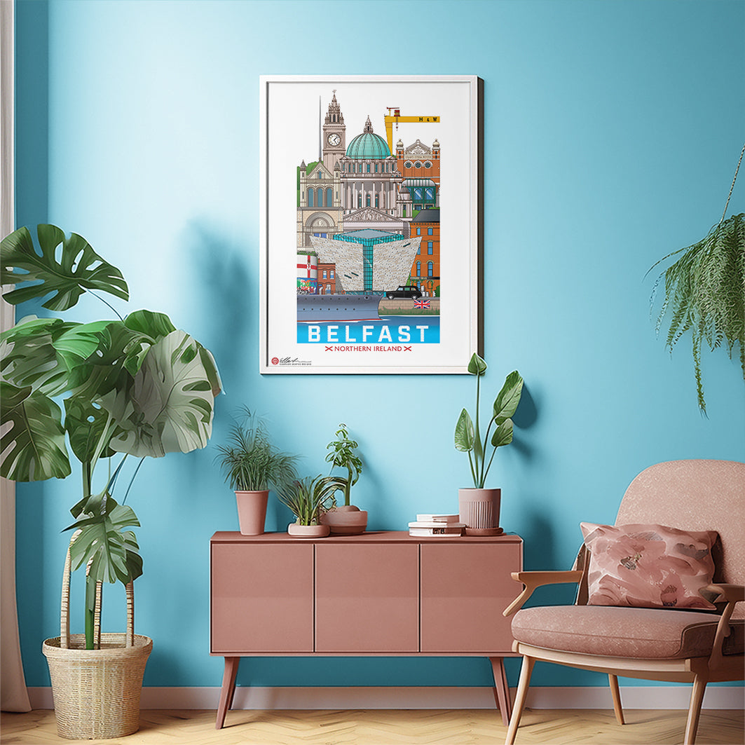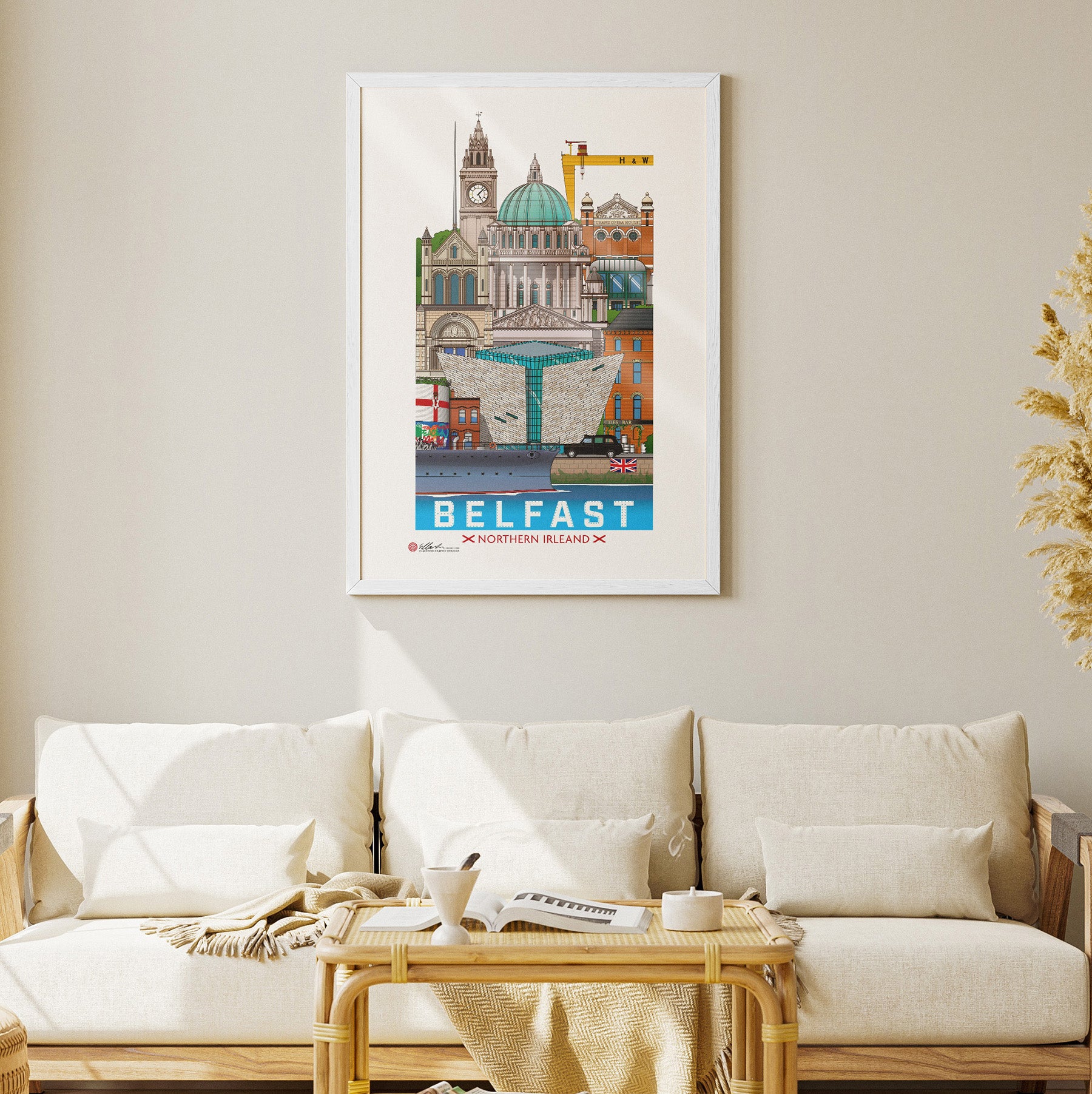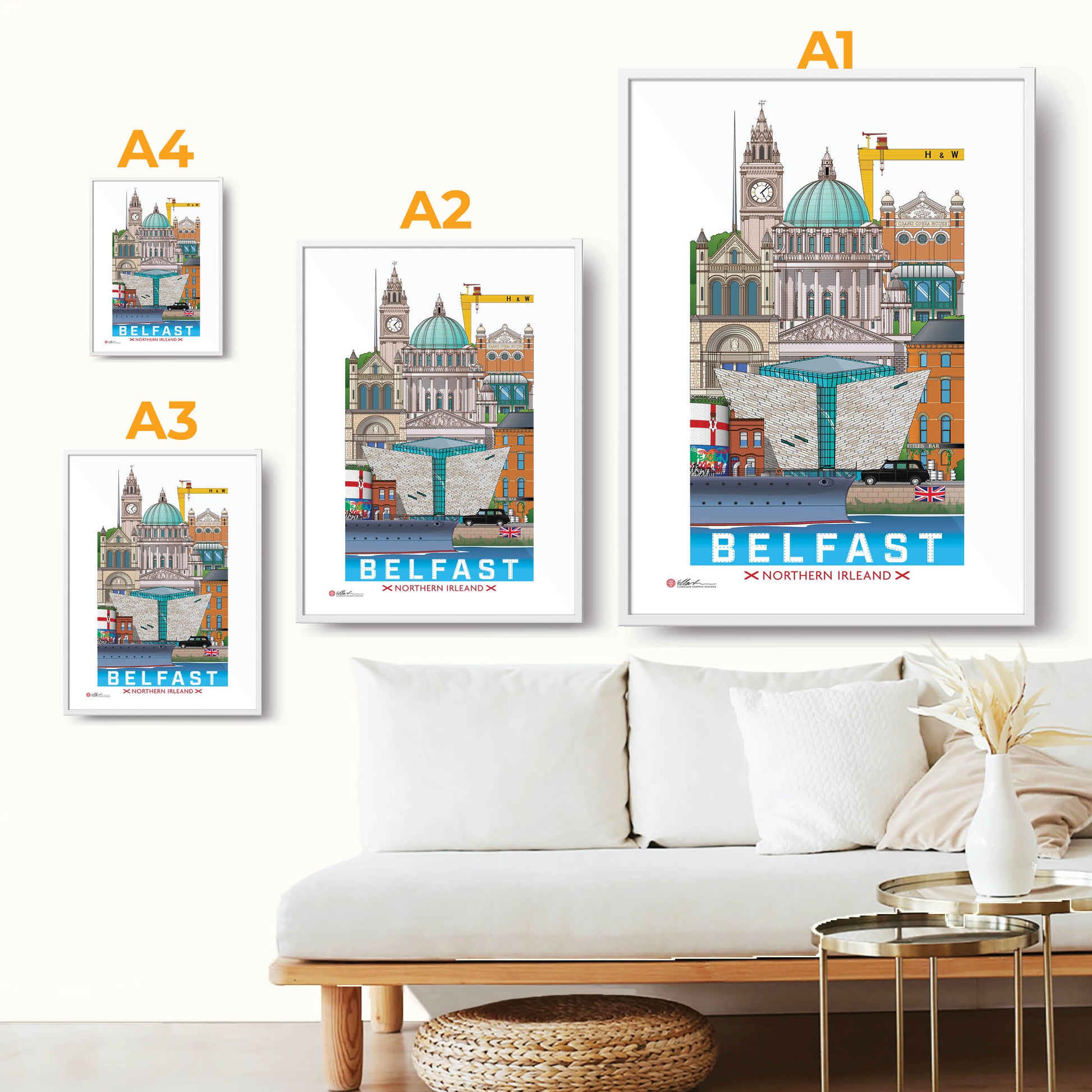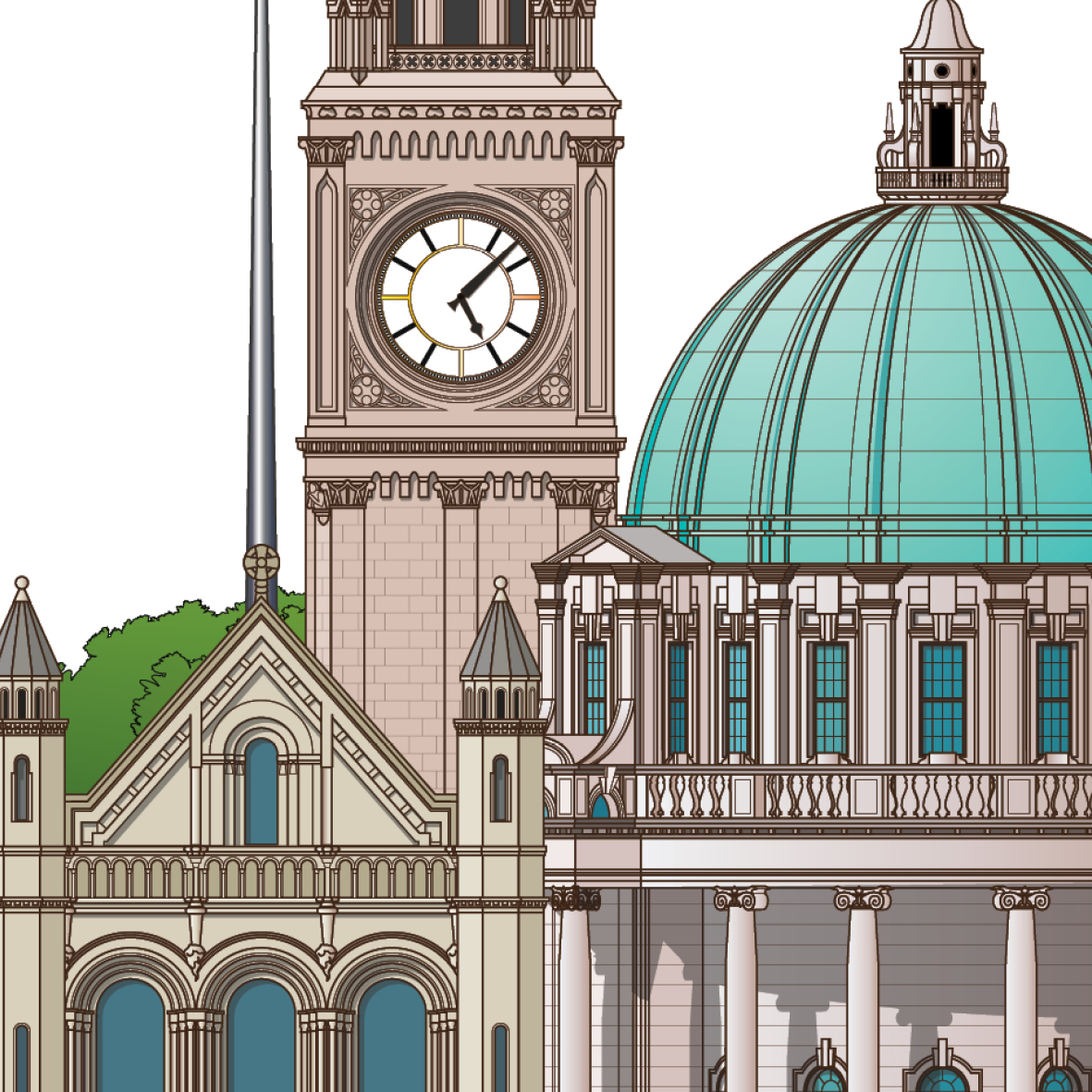 Albert Memorial Clock, Belfast City Hall, Goliath shipbuilding gantry crane, Belfast Cathedral, (Cathedral Church of St Anne), Grand Opera House, Peace Wall, Pandora St House, Titanic Belfast, Bittles Bar, Black Cab Taxi, HMS Caroline.