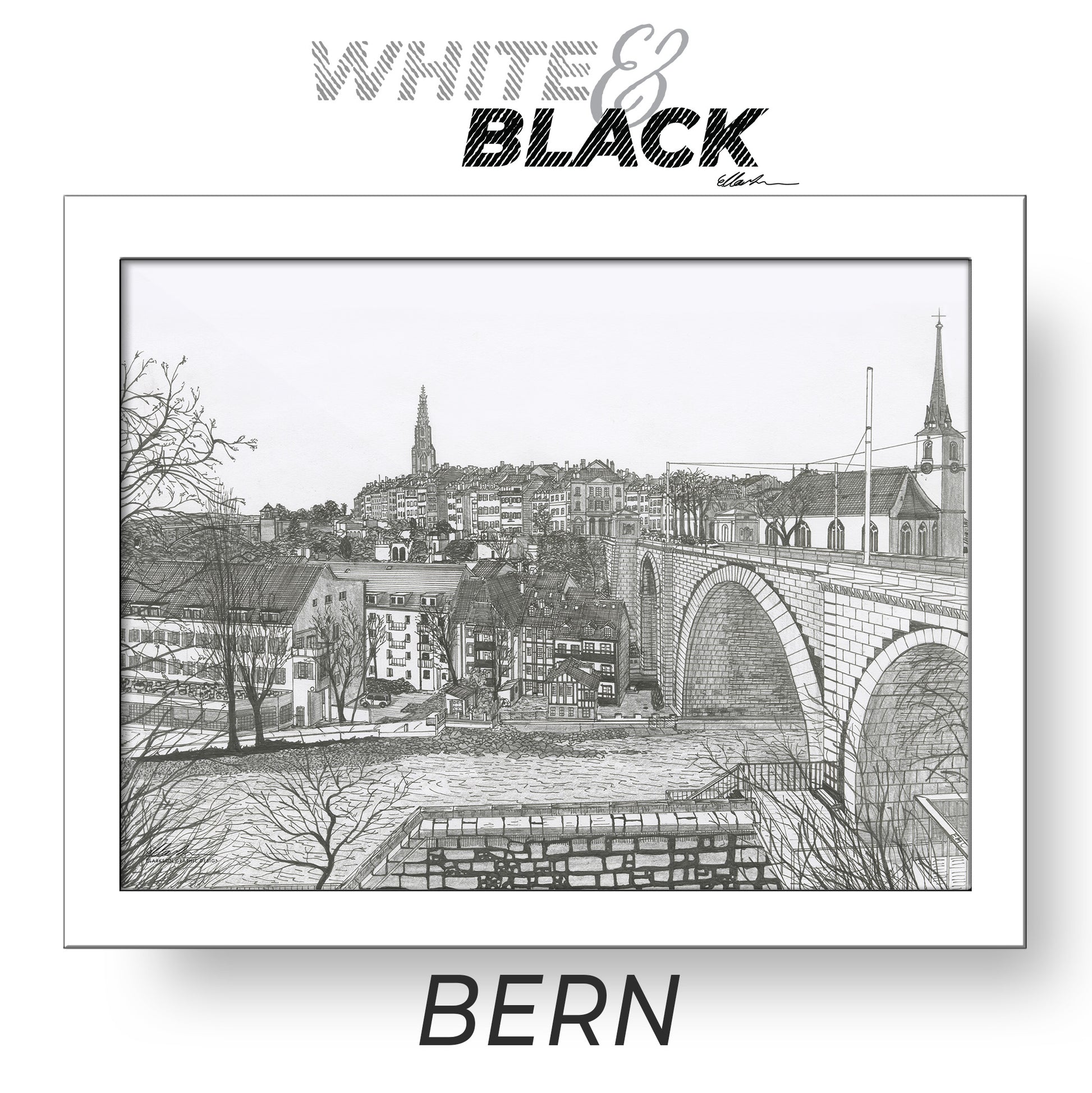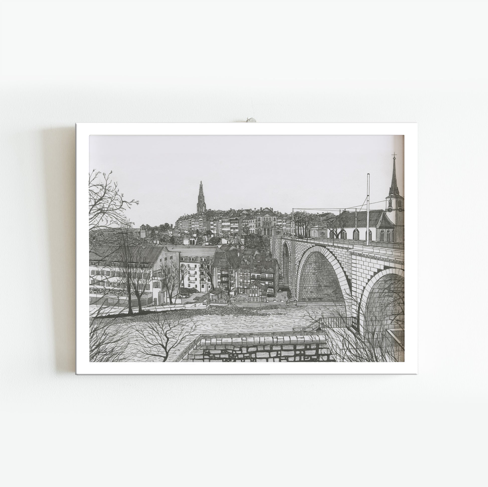 Bern, the capital of Switzerland, boasts a well-preserved, elevated medieval old town overlooking the River Aare. This illustration is of the medieval old town from the BärenPark