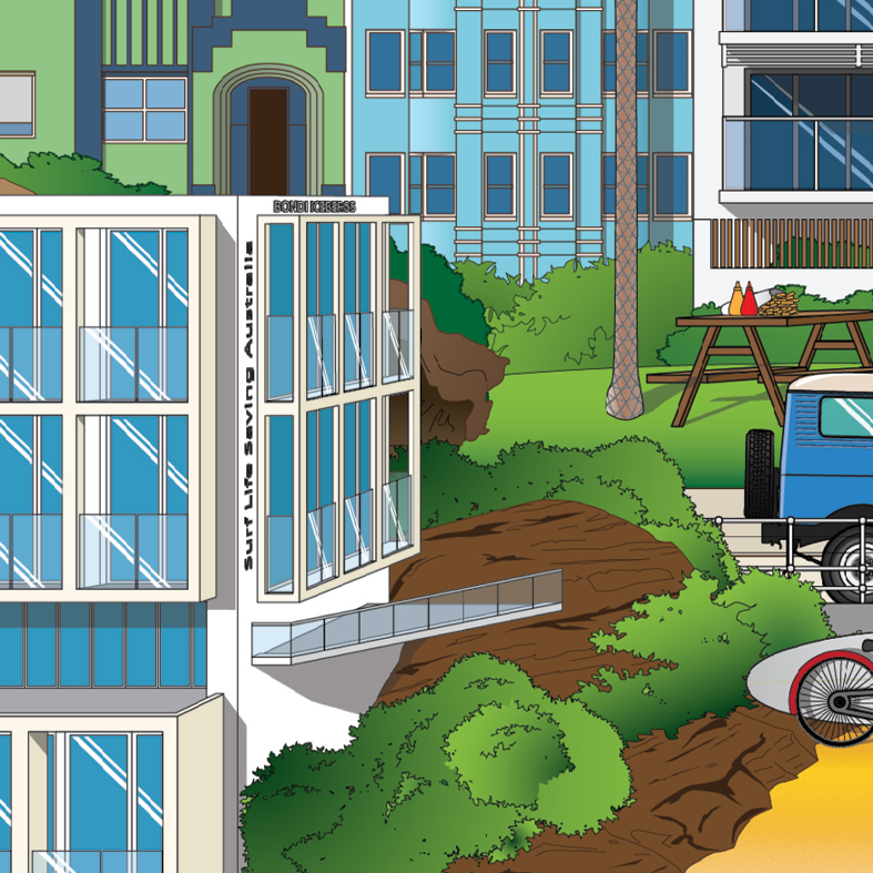 - Iconic Bondi Landmarks – I have included many of Bondi's most recognizable landmarks, including the Life Guard Tower, Bondi Icebergs, and Pavilion.
