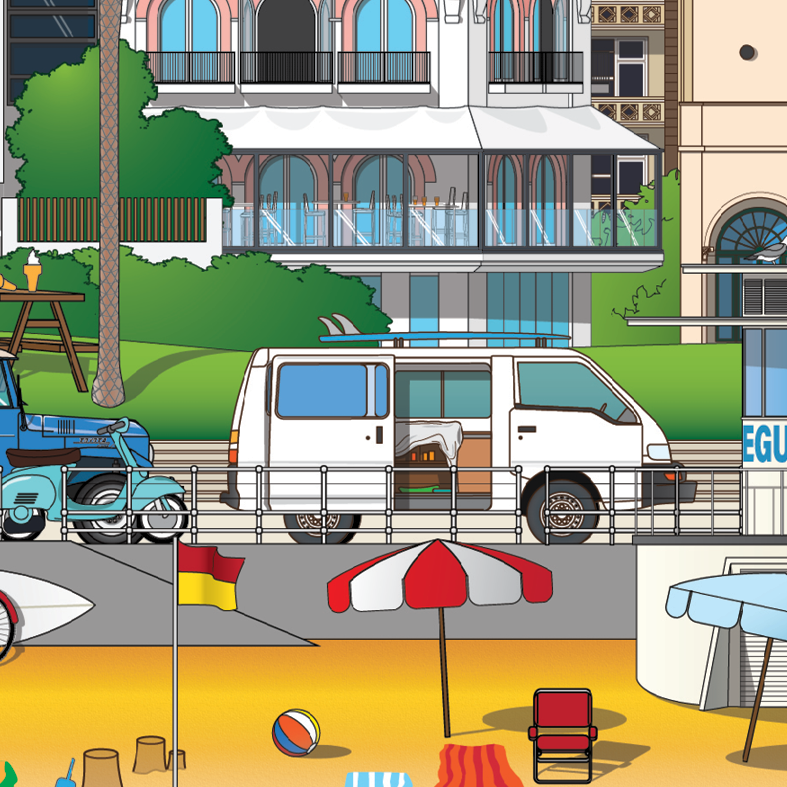 The Bondi Icebergs, Campbell Parade Houses, Hotel Ravesis, The Bondi Hotel, Bondi Pavilion, Toyota Land Cruiser, Mitsubishi Express, VW Combi Van, Bondi Beach and Lifeguard Tower.