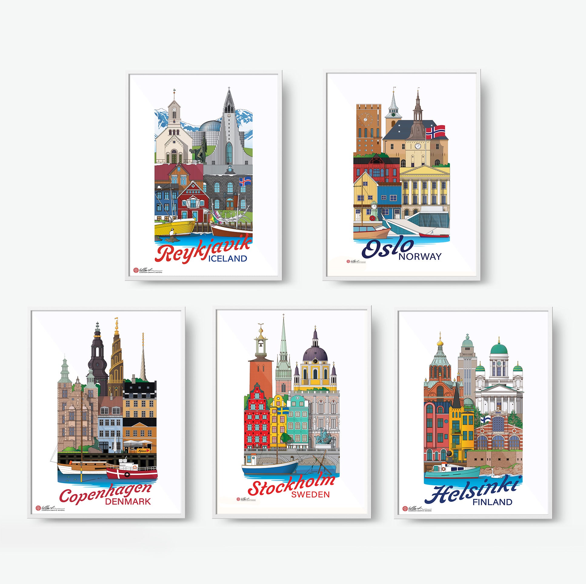 The complete collection of 5 Scandinavian capitals: Copenhagen, Helsinki, Stockholm, Oslo, and Reykjavik in one collection.