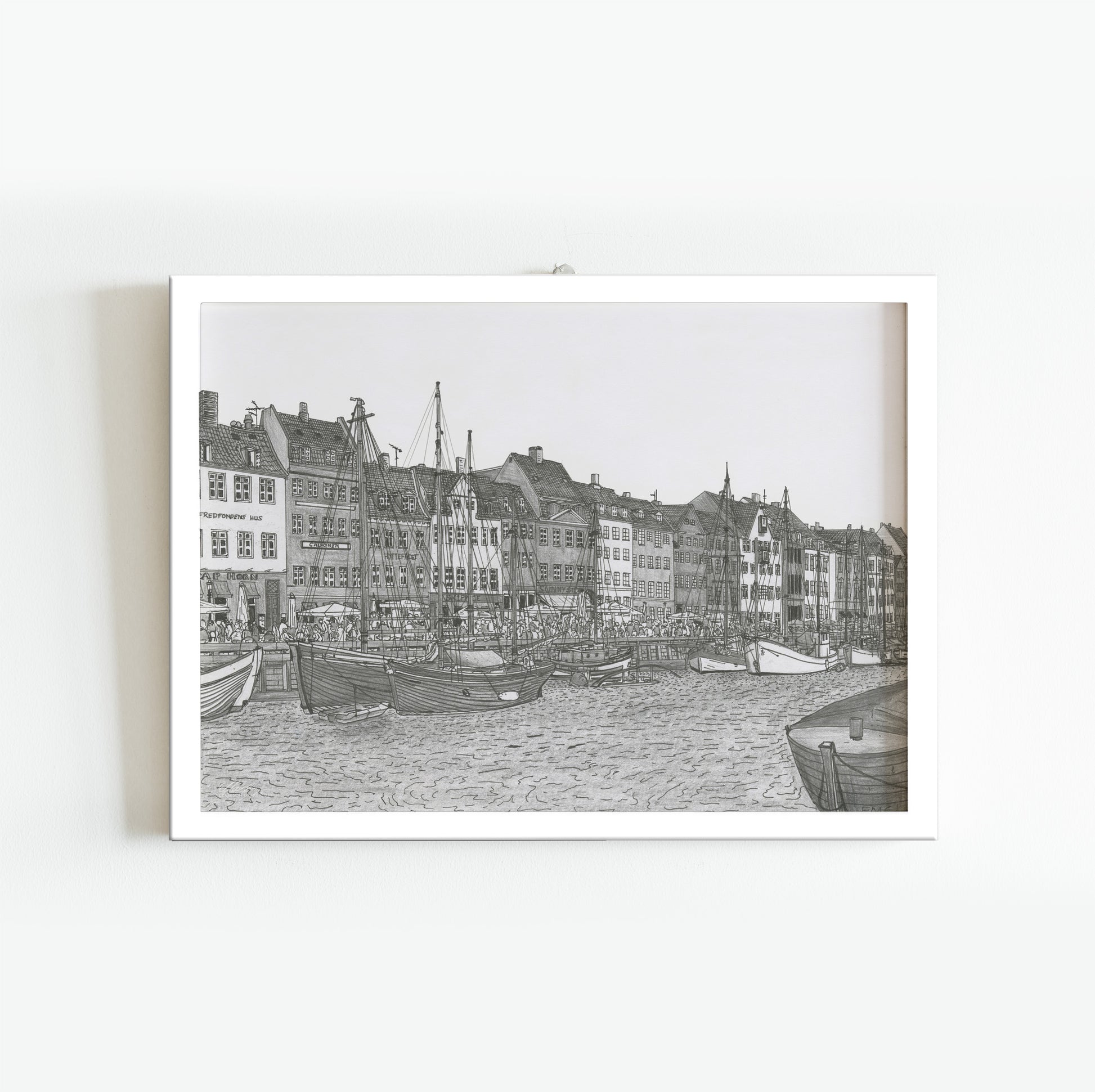 This scene is of the Nyhavn Canal from the Memorial Anchor, displaying the beautiful waterfront and its fleet of anchored ships.