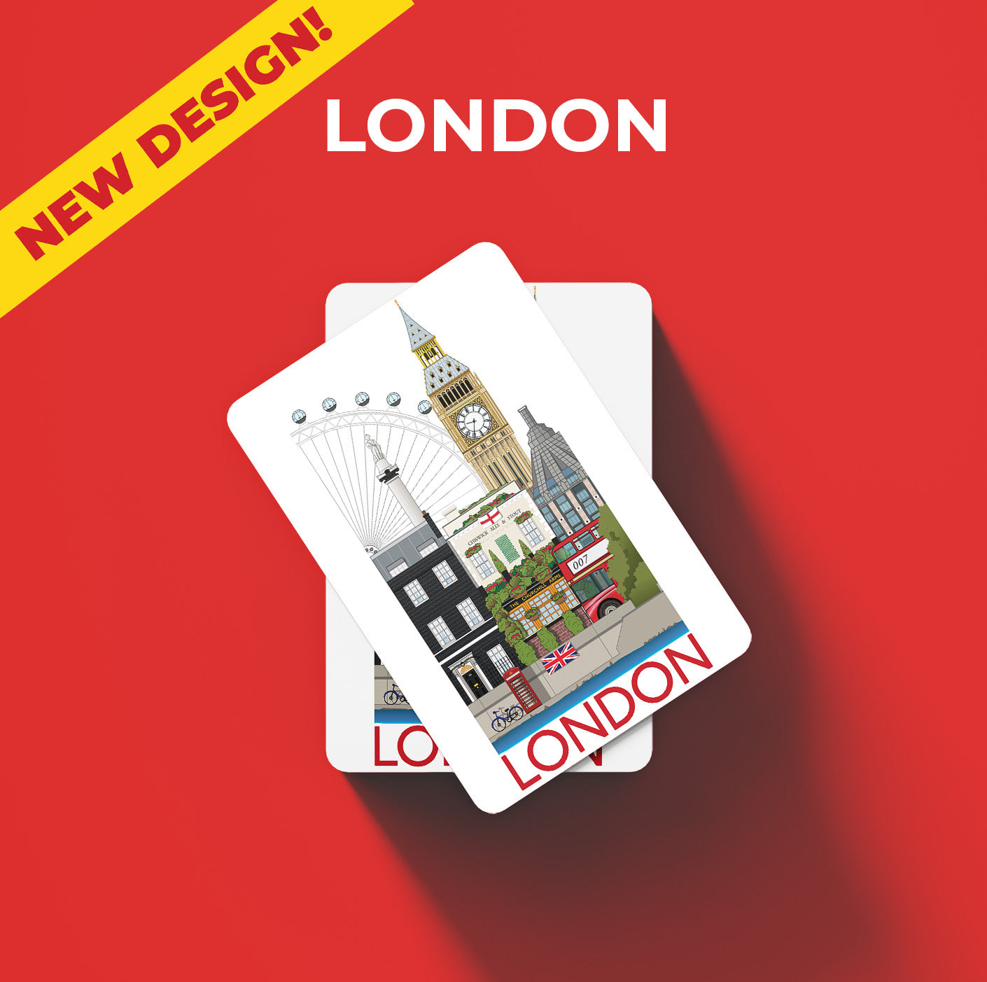 A full deck of playing cards decorated with the London (B) design. Perfect as a novelty gift or memento of your adventures in one of the most amazing cities on earth.