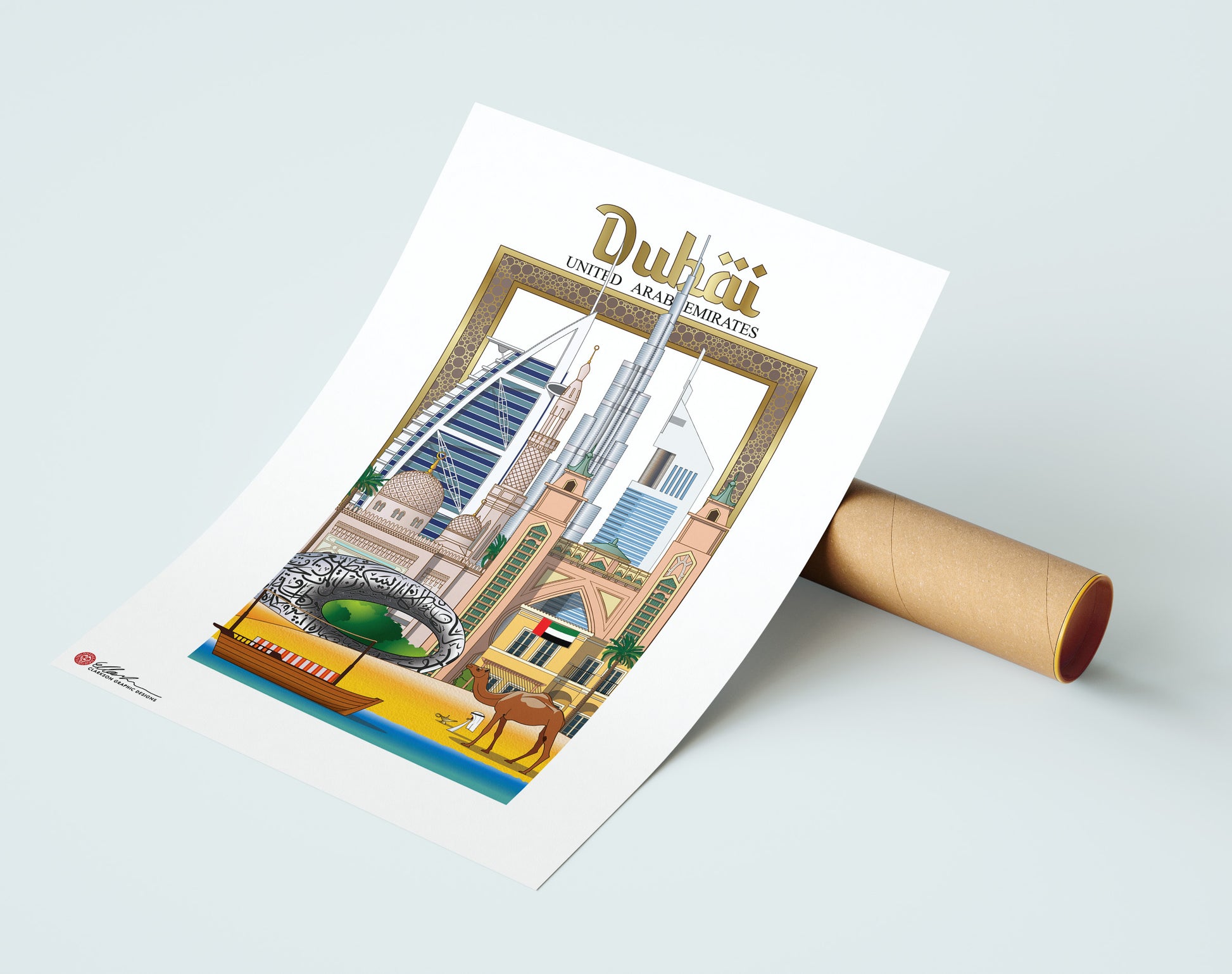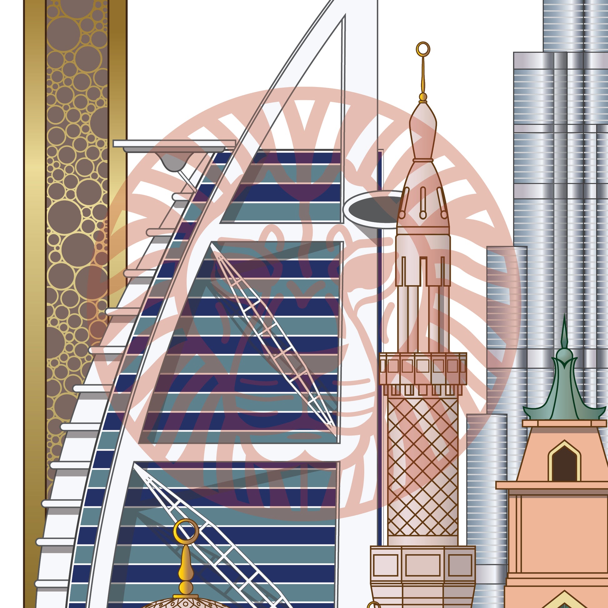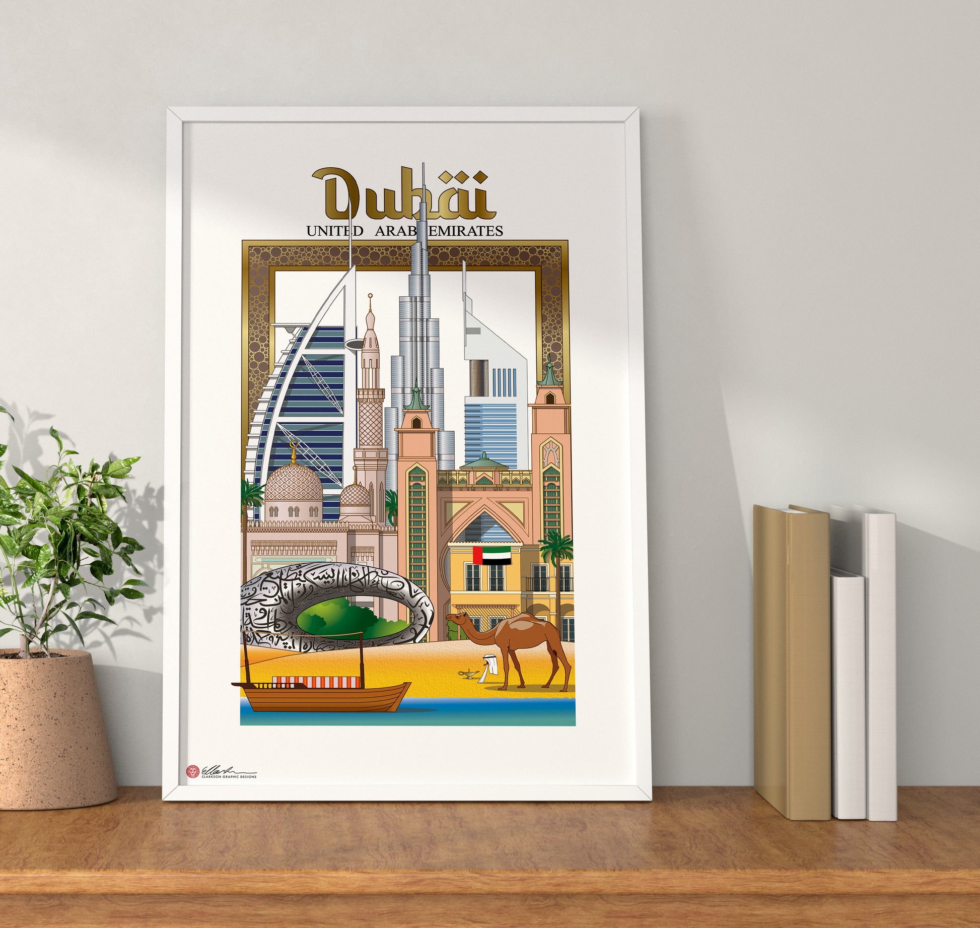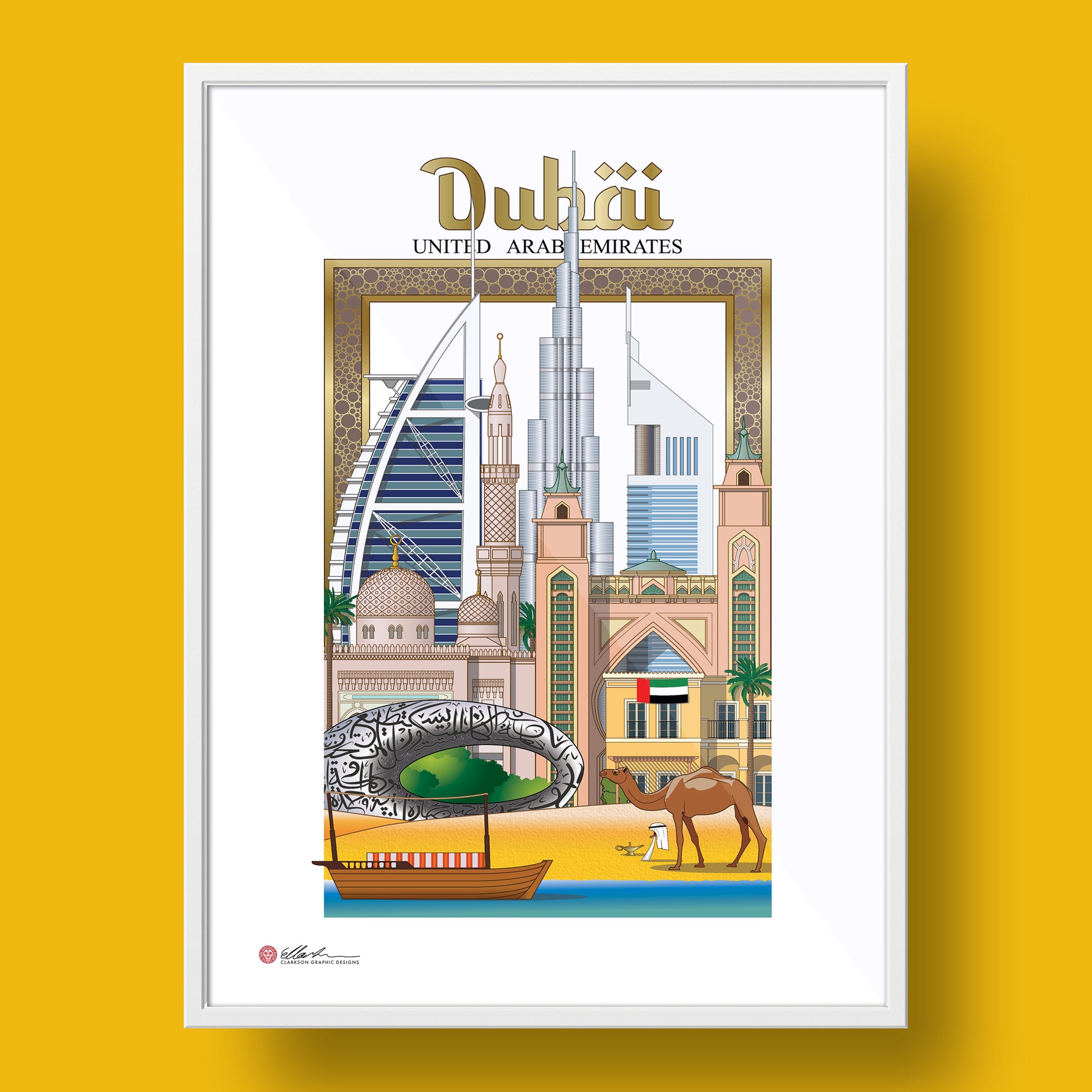 The Dubai Frame, Burj Al-Arab, Burj Khalifa, Emirates Tower, Jumeirah Mosque, Atlantis, The Palm Dubai, Museum of the Future, Villa, Arabian boat, Camel, The Persian Gulf.
