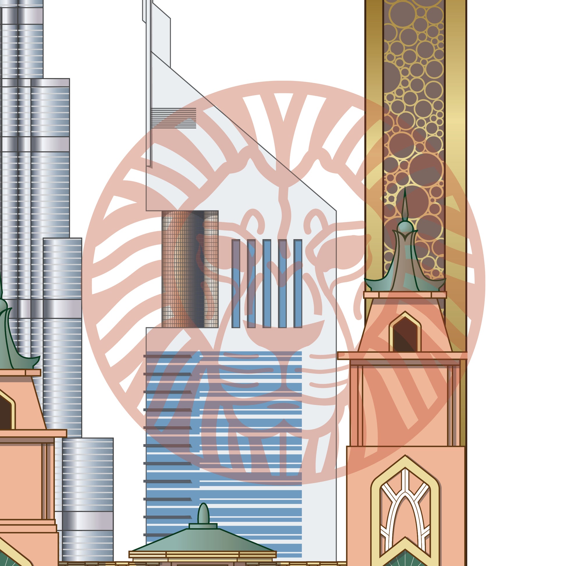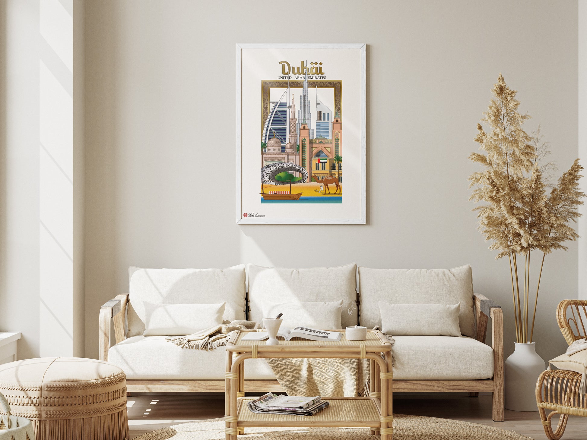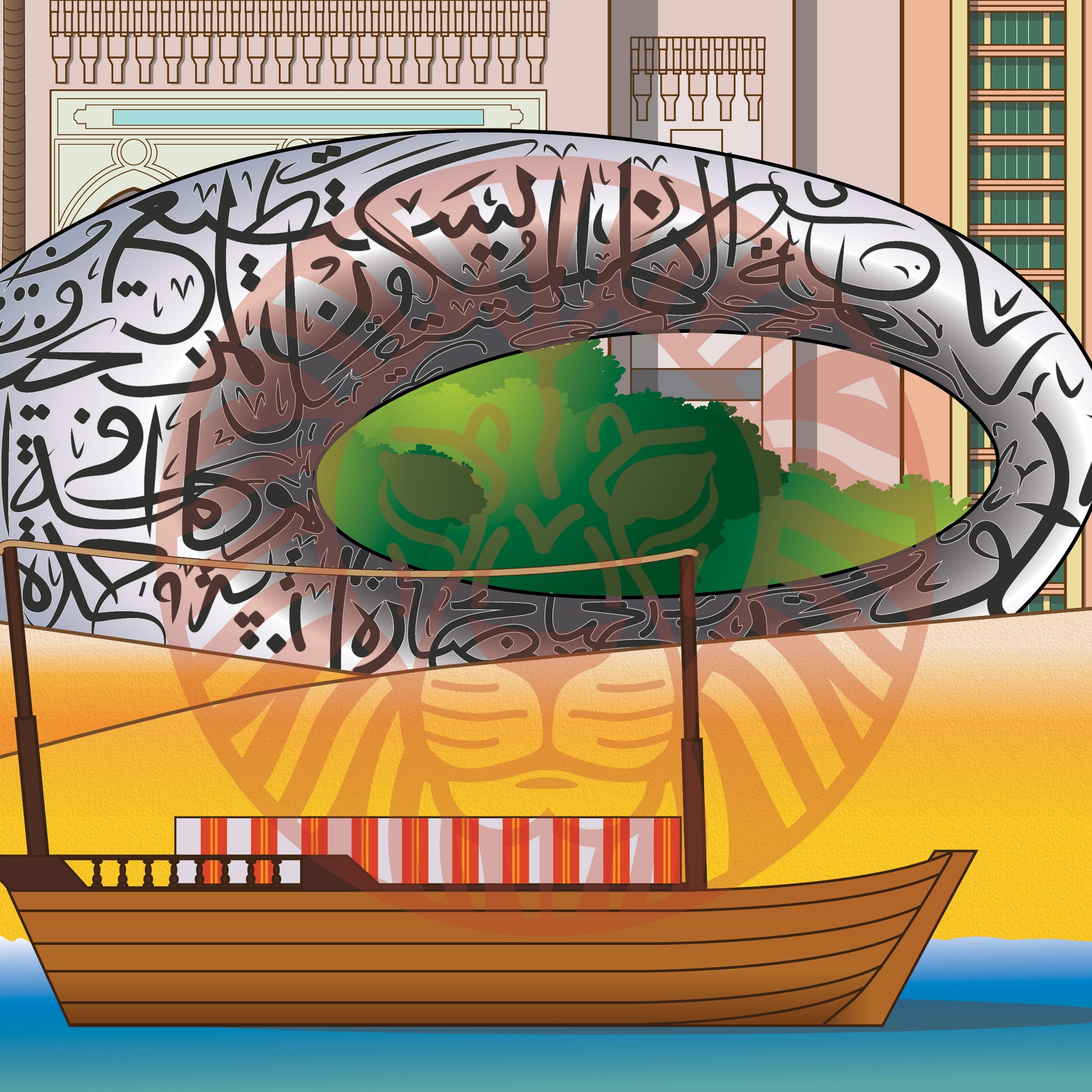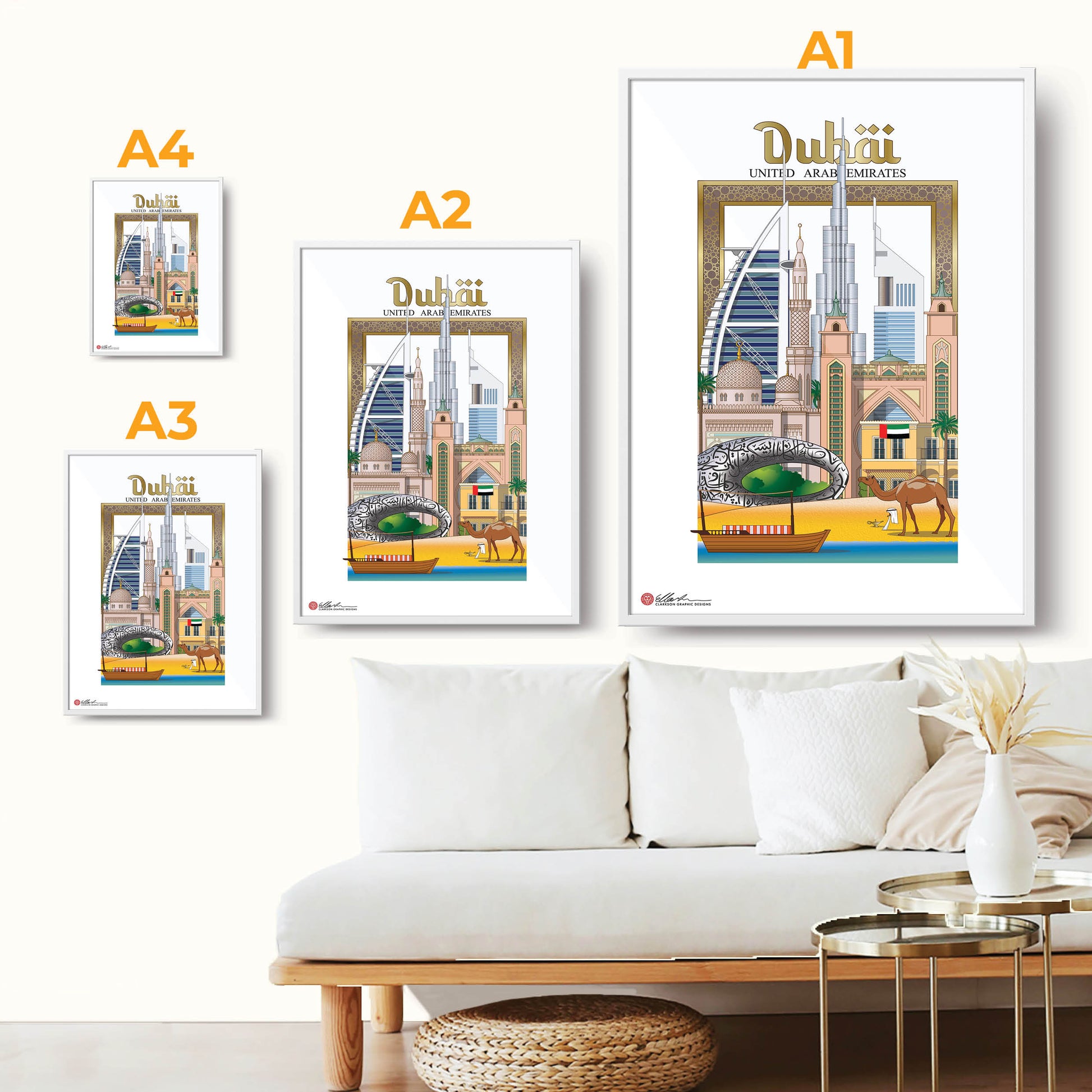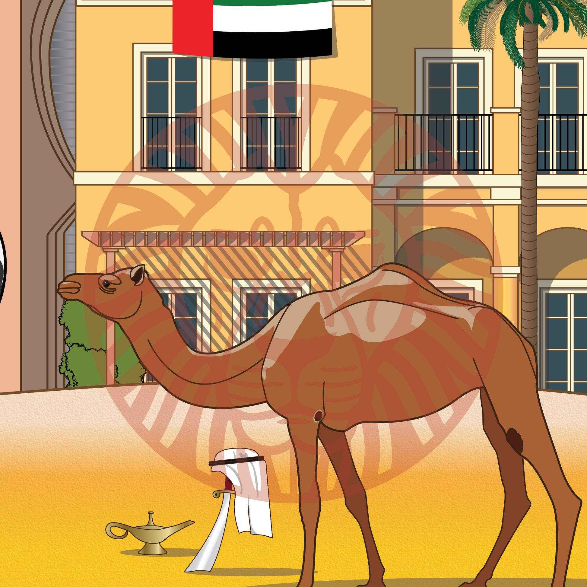 The Dubai Frame, Burj Al-Arab, Burj Khalifa, Emirates Tower, Jumeirah Mosque, Atlantis, The Palm Dubai, Museum of the Future, Villa, Arabian boat, Camel, The Persian Gulf.