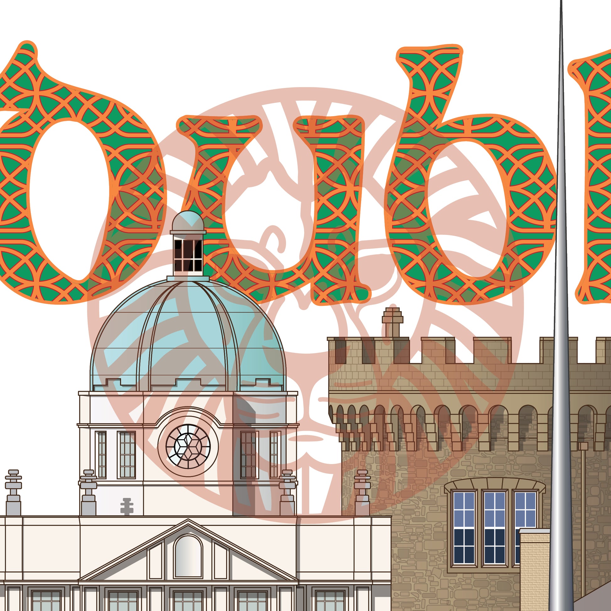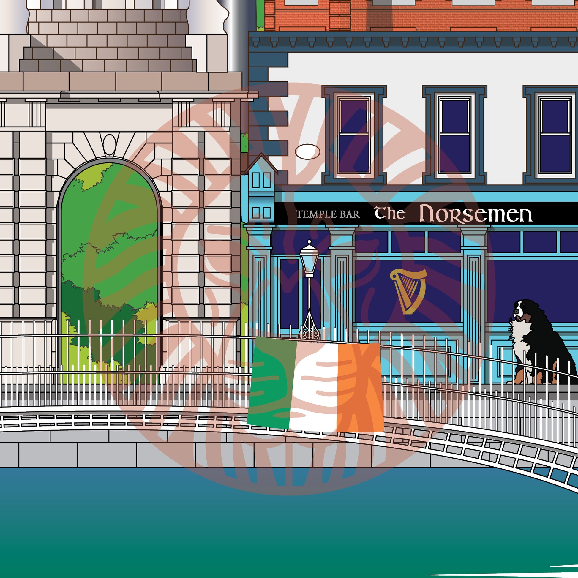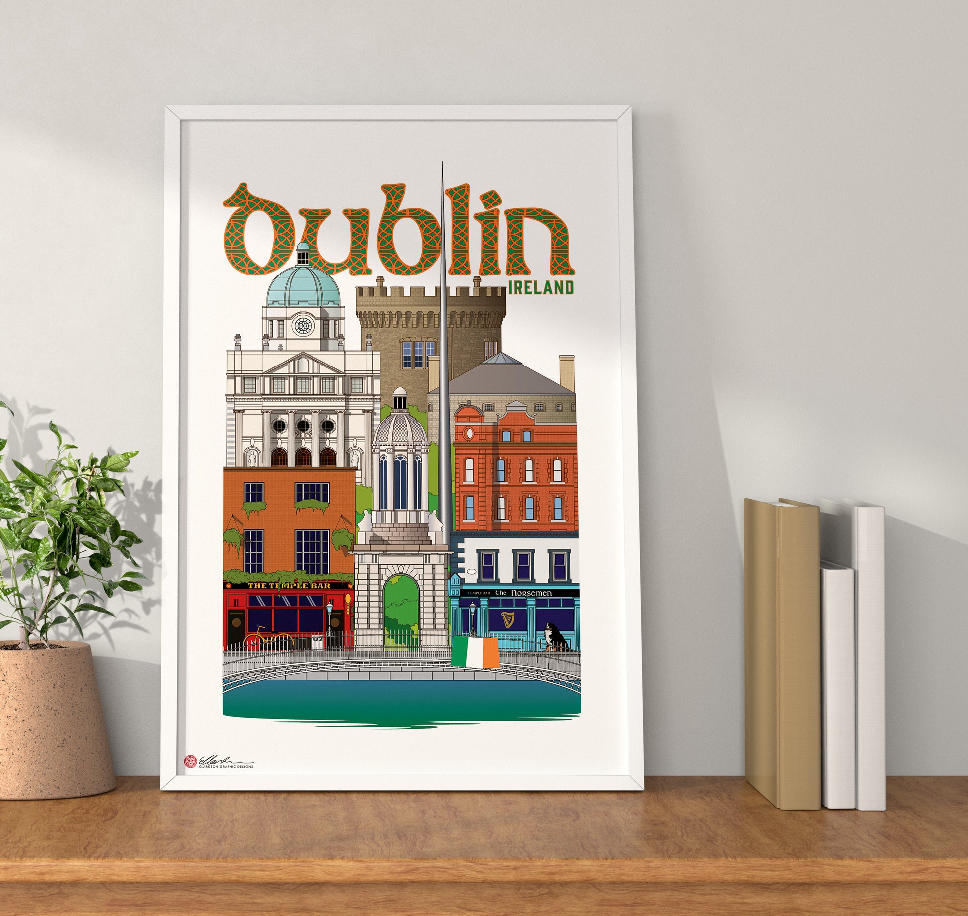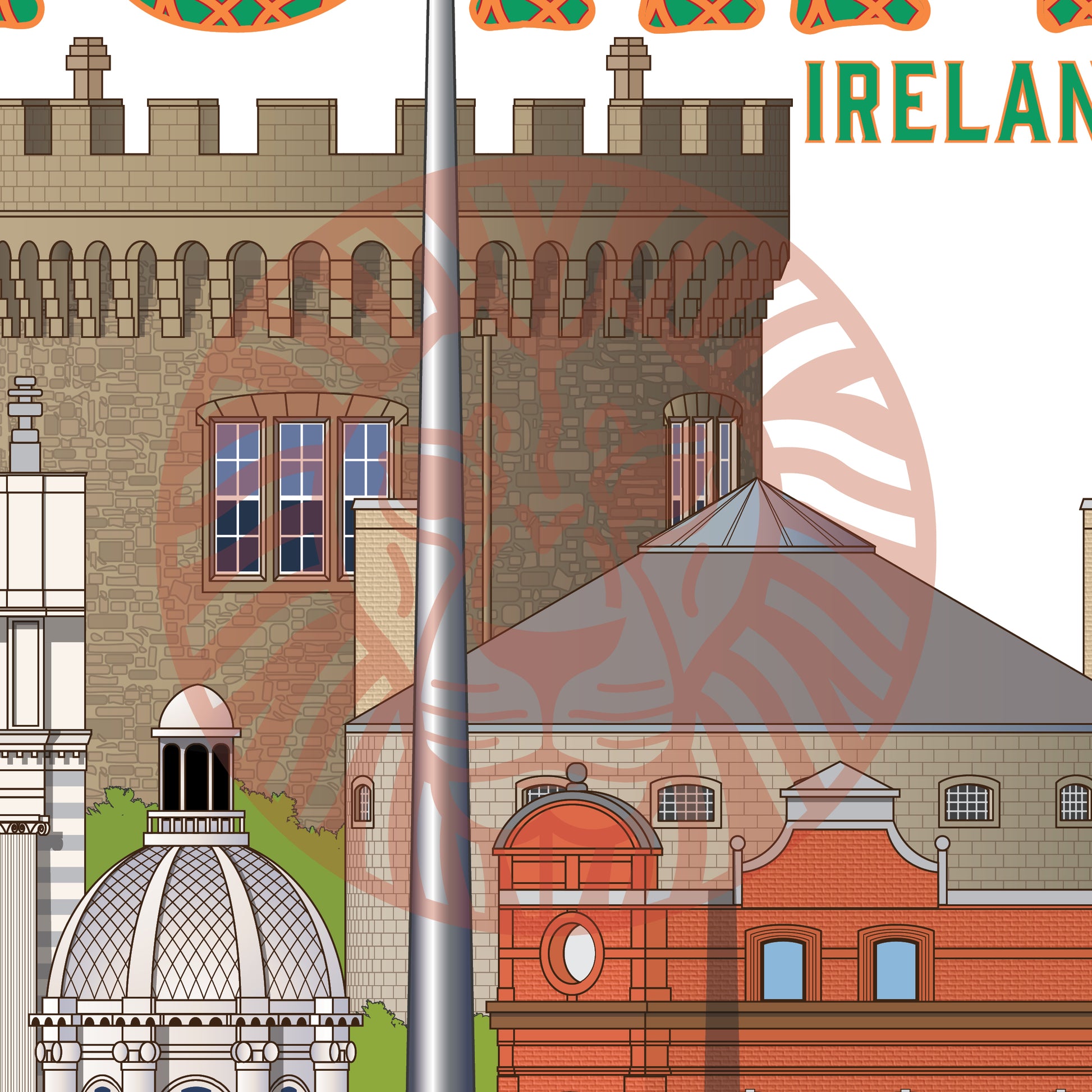 Department of the Taoiseach, Dublin Castle, Kilmainham Gaol, The Temple Bar, the Campanile of Trinity College, The Spire, The Norsemen Bar, 'Misneach' (President of Ireland Michael D. Higgins's Dog), Ha'penny Bridge, the River Liffey.