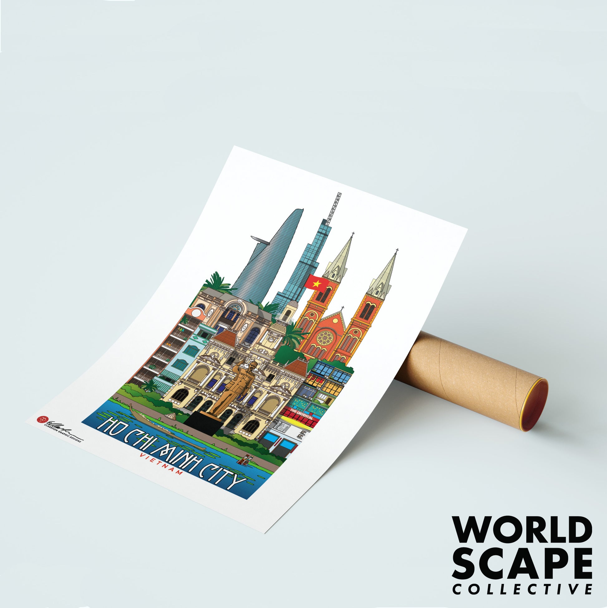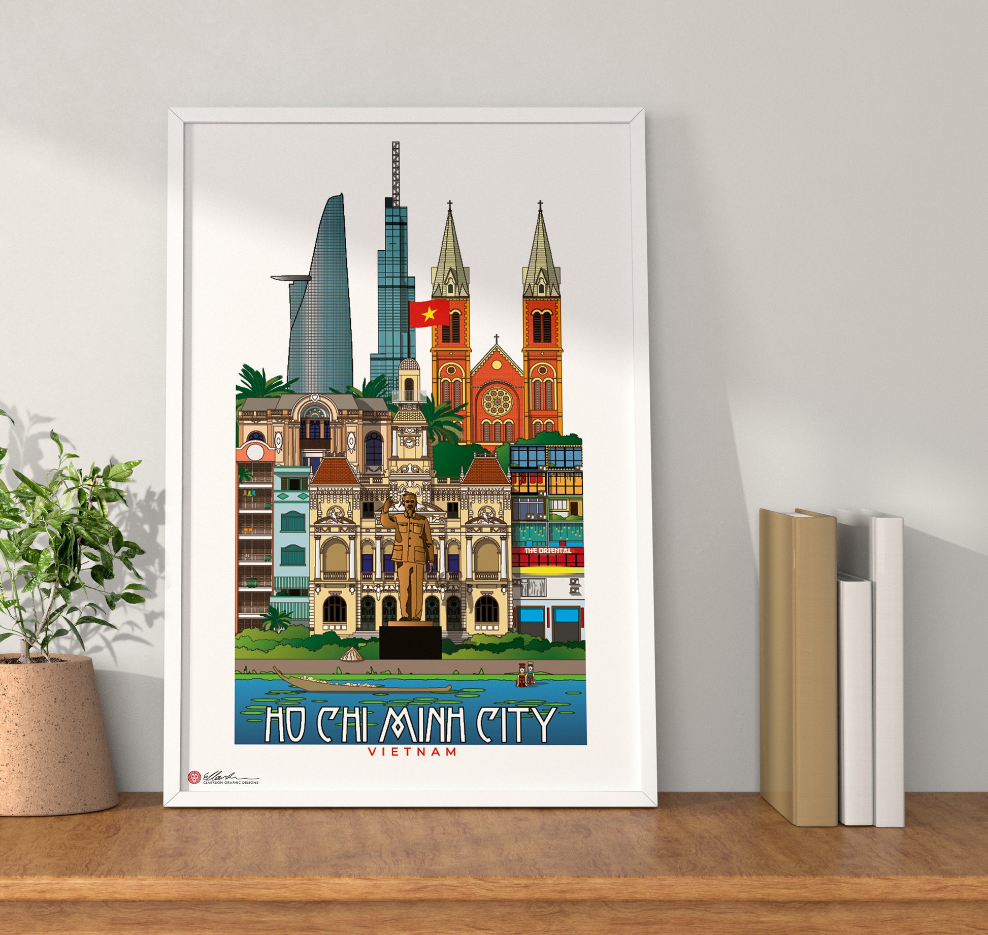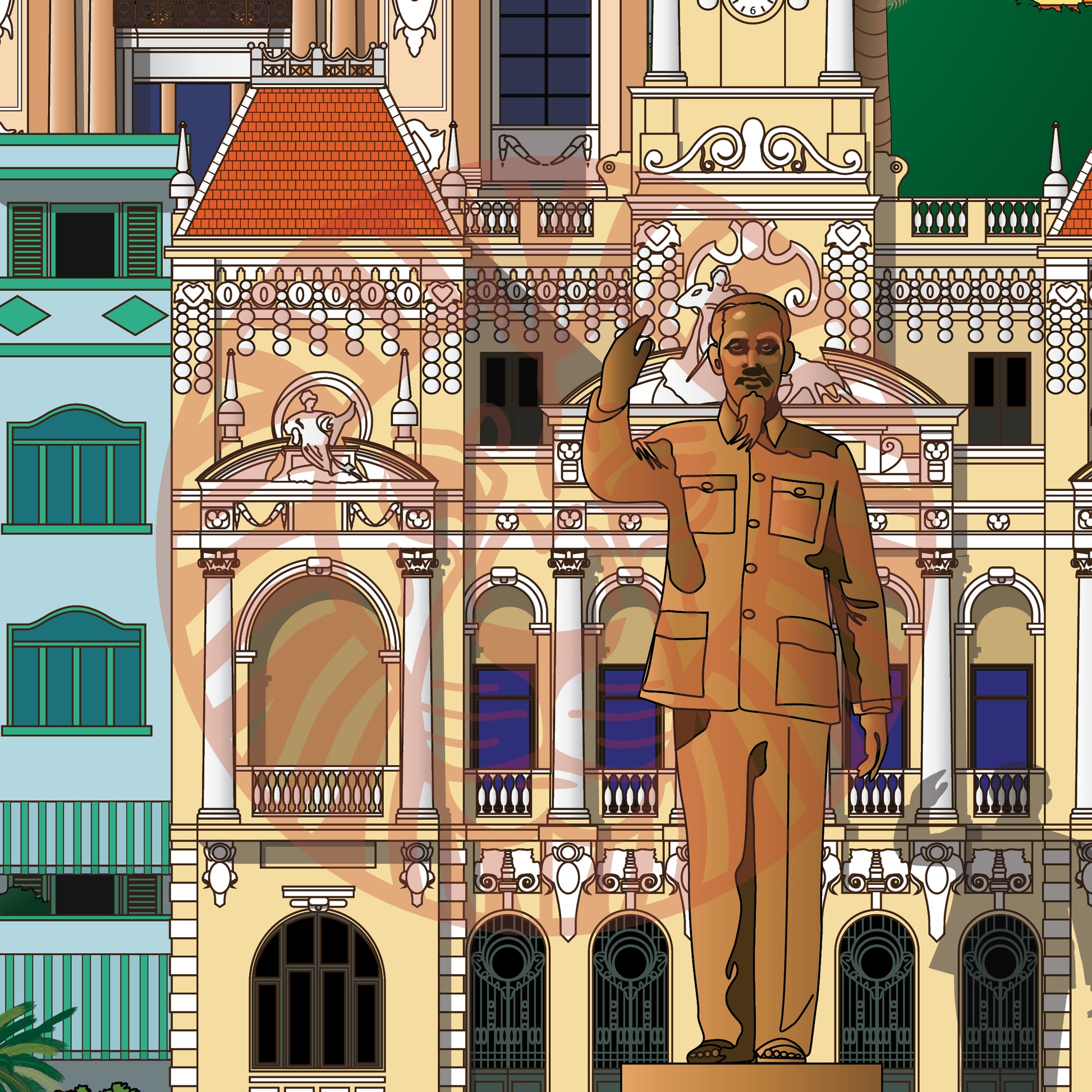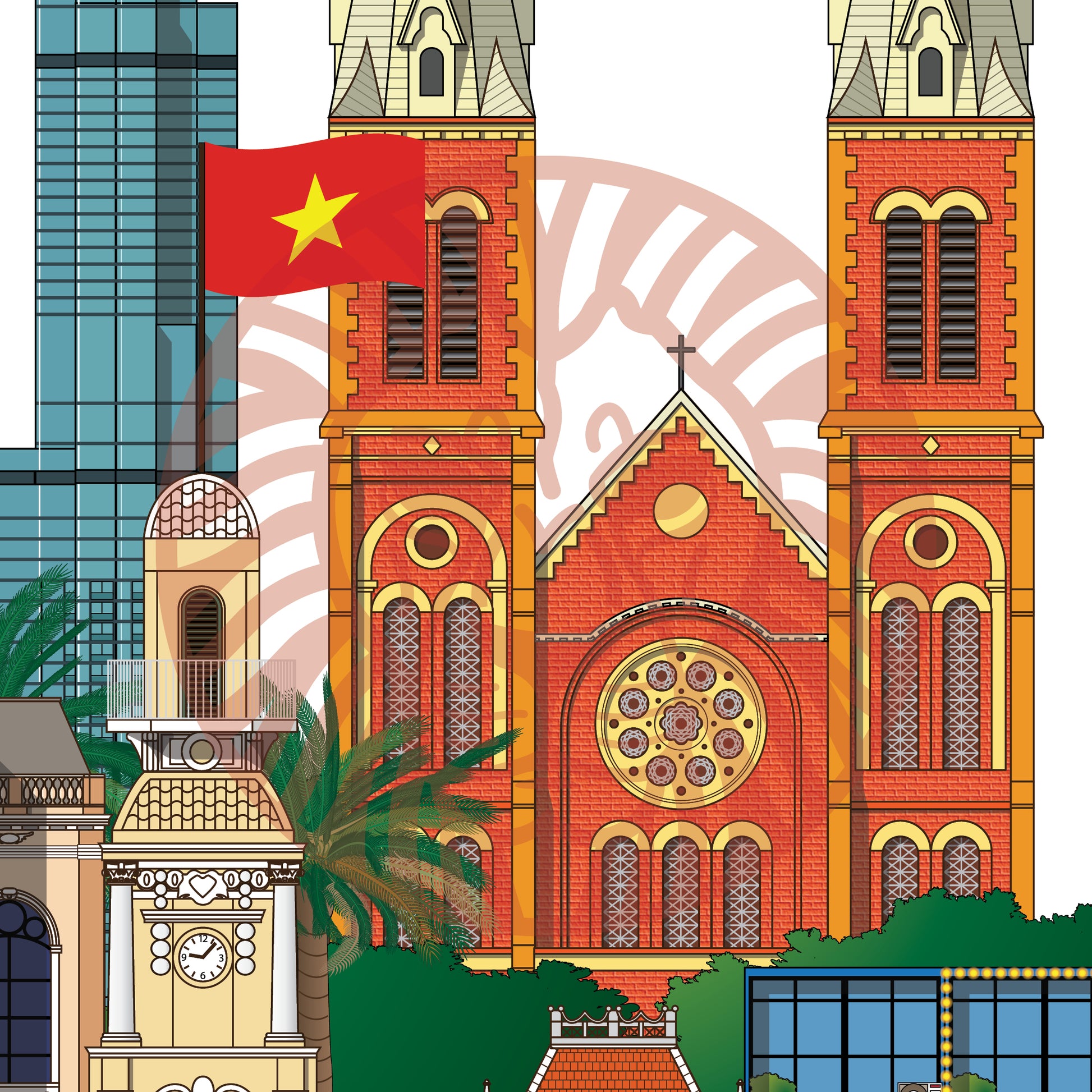 Bitexco Financial Tower, Landmark 81, Notre Dame Cathedral of Saigon, Ho Chi Minh City Opera House, Apartments, Ho Chi Minh City Hall, Ho Chi Minh City Statue, Traditional Vietnamese Boat, Water Puppets, Saigon River.