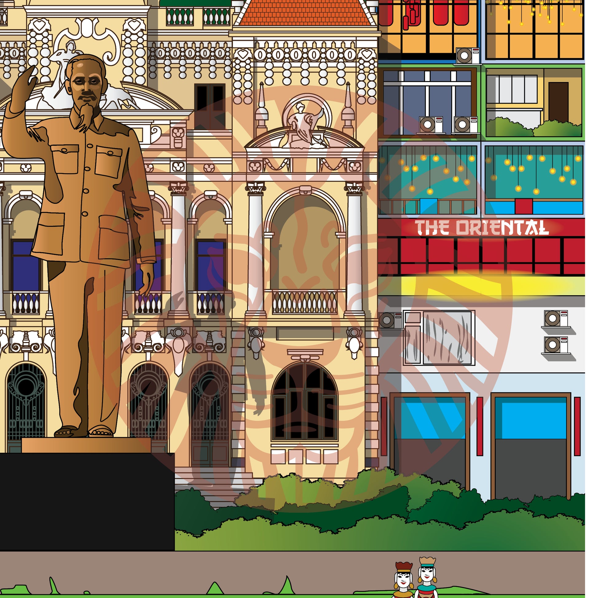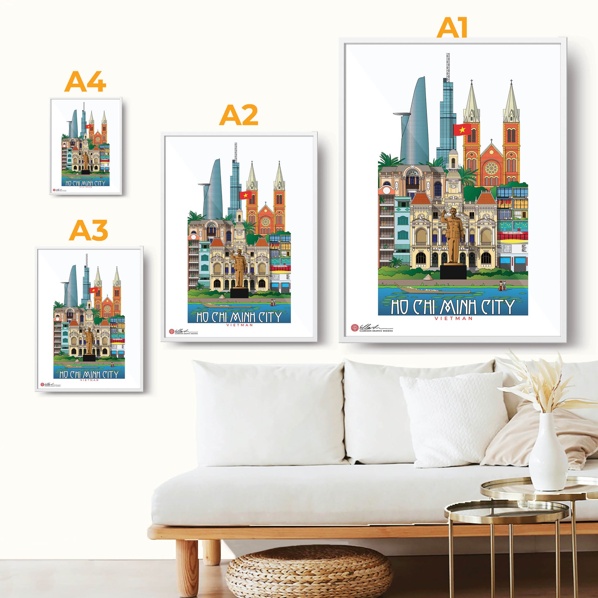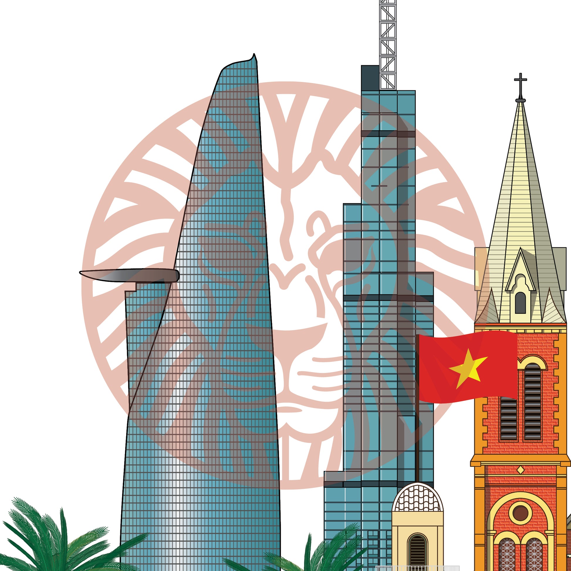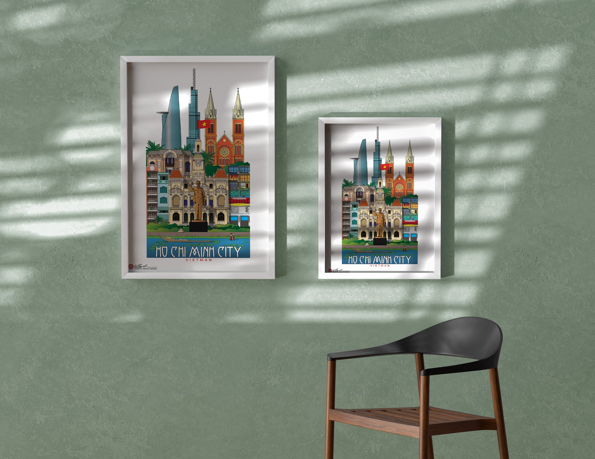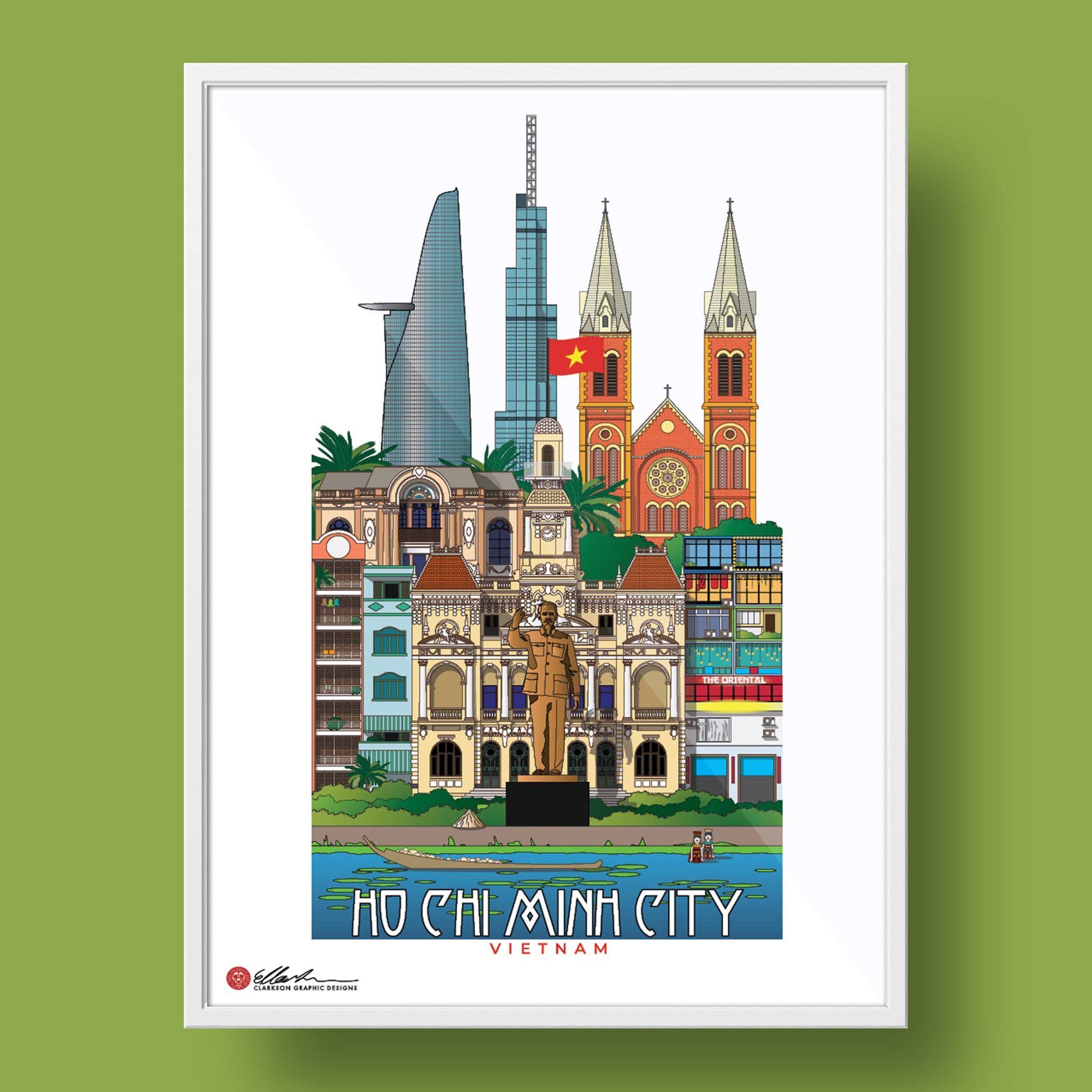 Bitexco Financial Tower, Landmark 81, Notre Dame Cathedral of Saigon, Ho Chi Minh City Opera House, Apartments, Ho Chi Minh City Hall, Ho Chi Minh City Statue, Traditional Vietnamese Boat, Water Puppets, Saigon River.
