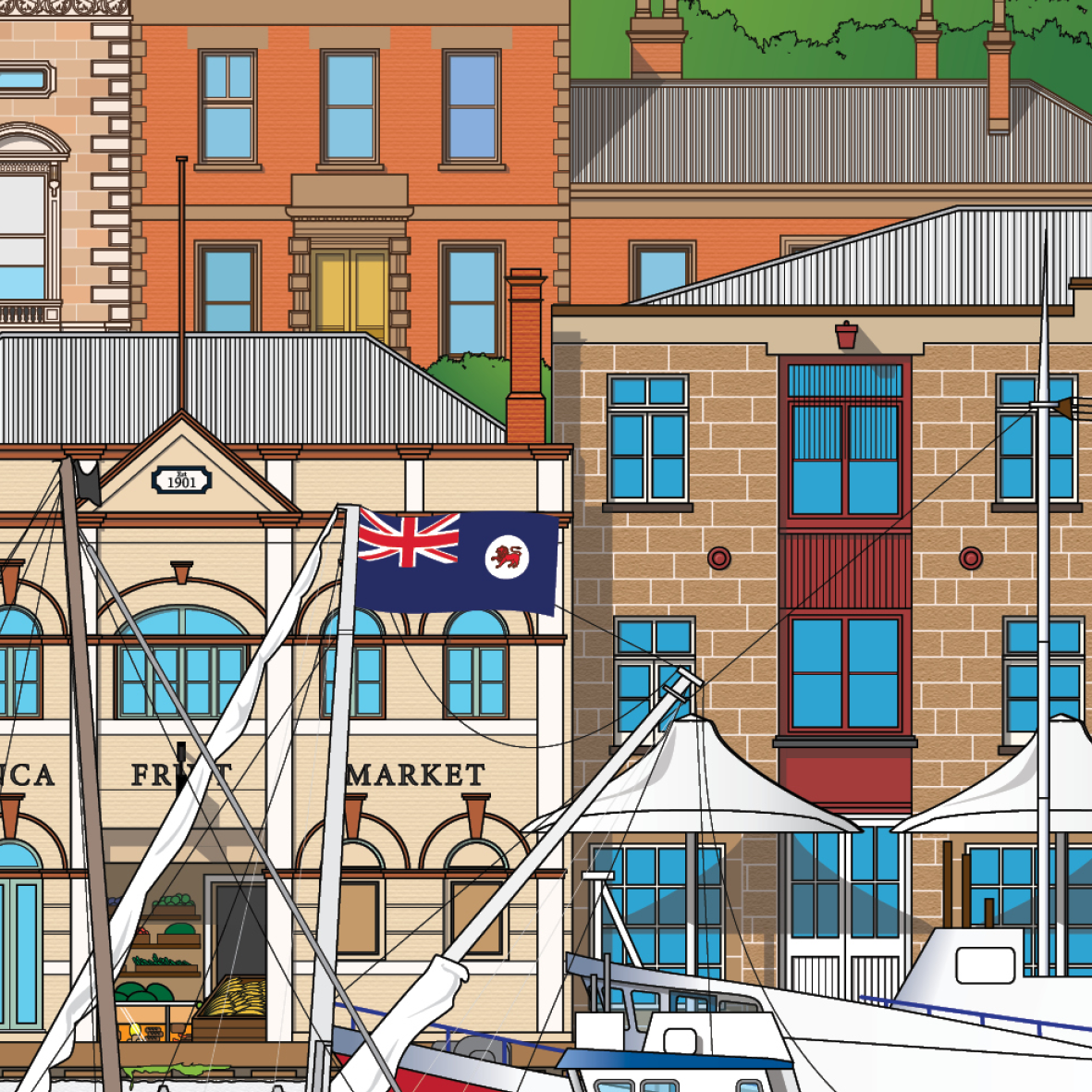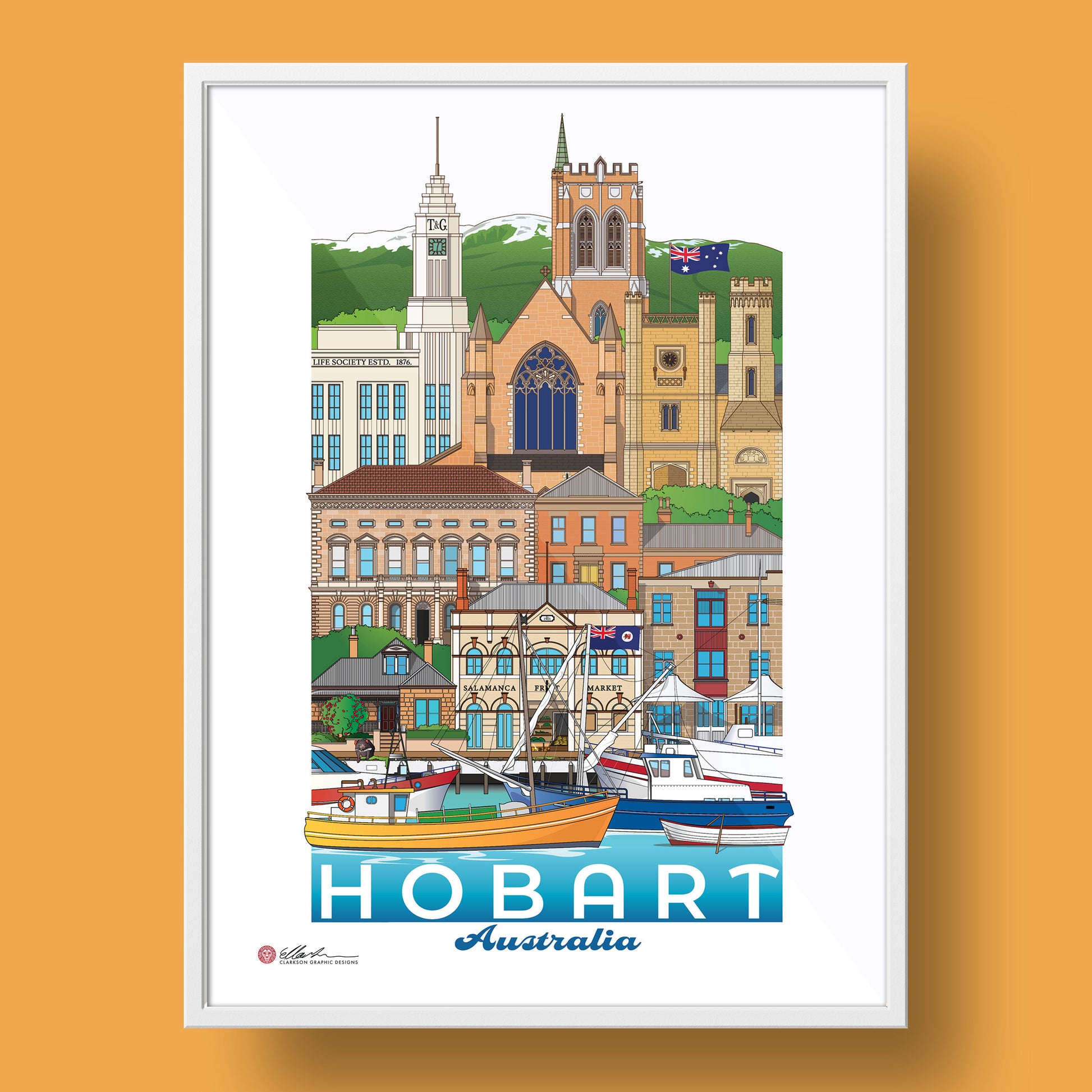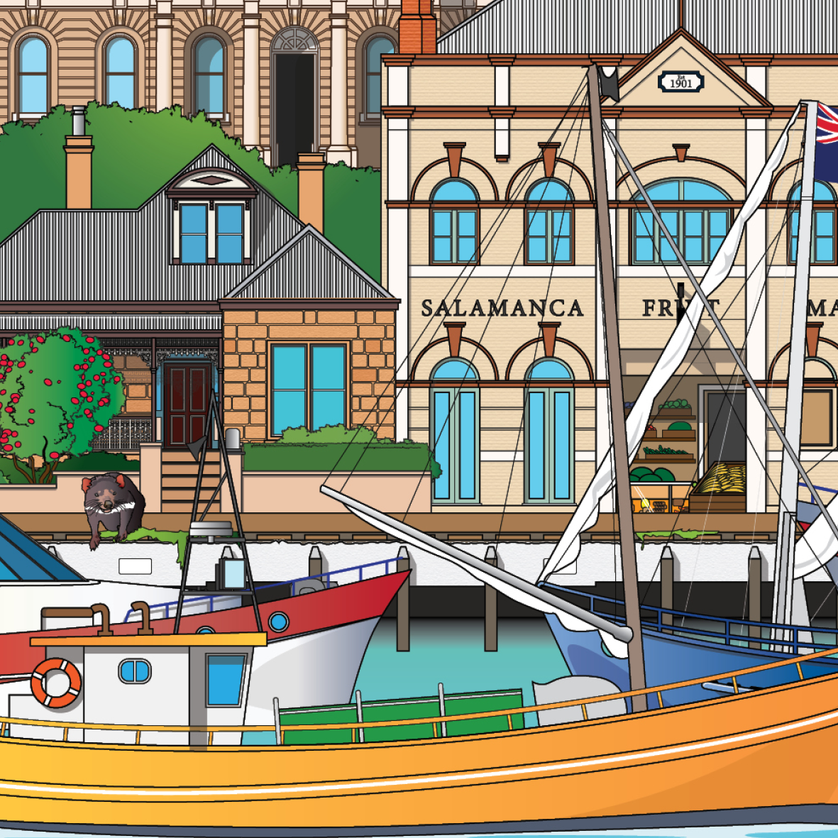 T & G Mutual Building, St David's Cathedral, Government House, Town Hall, The Convict Penitentiary, Condril House (46 Warwick St), Salamanca Fruit Market, Salamanca Place, Tasmanian Devil, Constitution Dock and Ships.