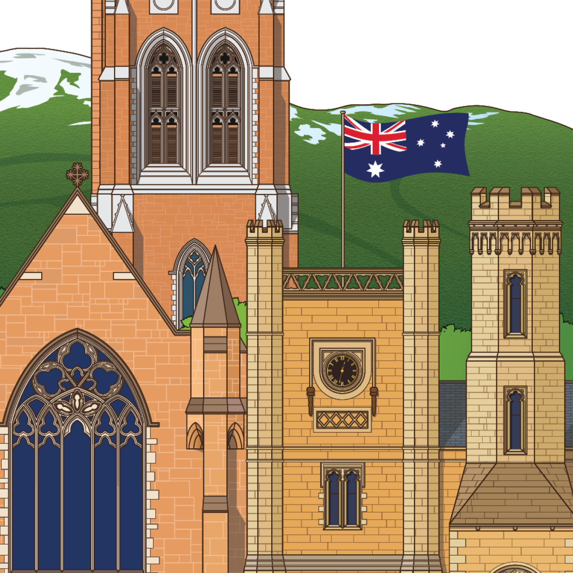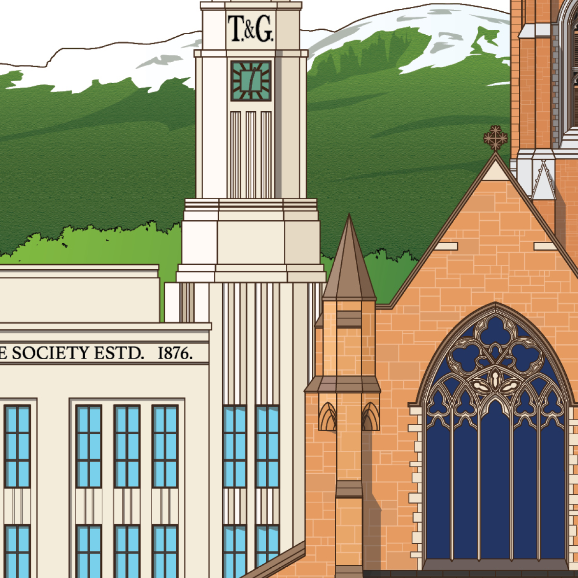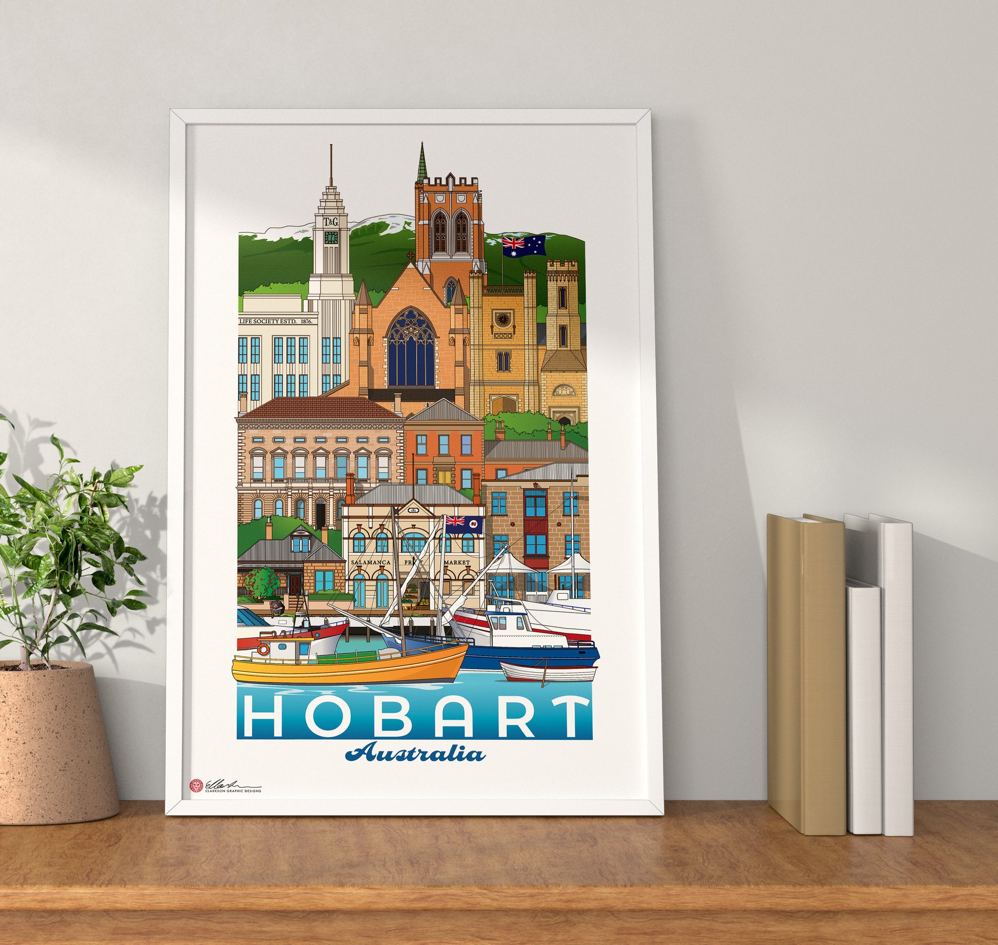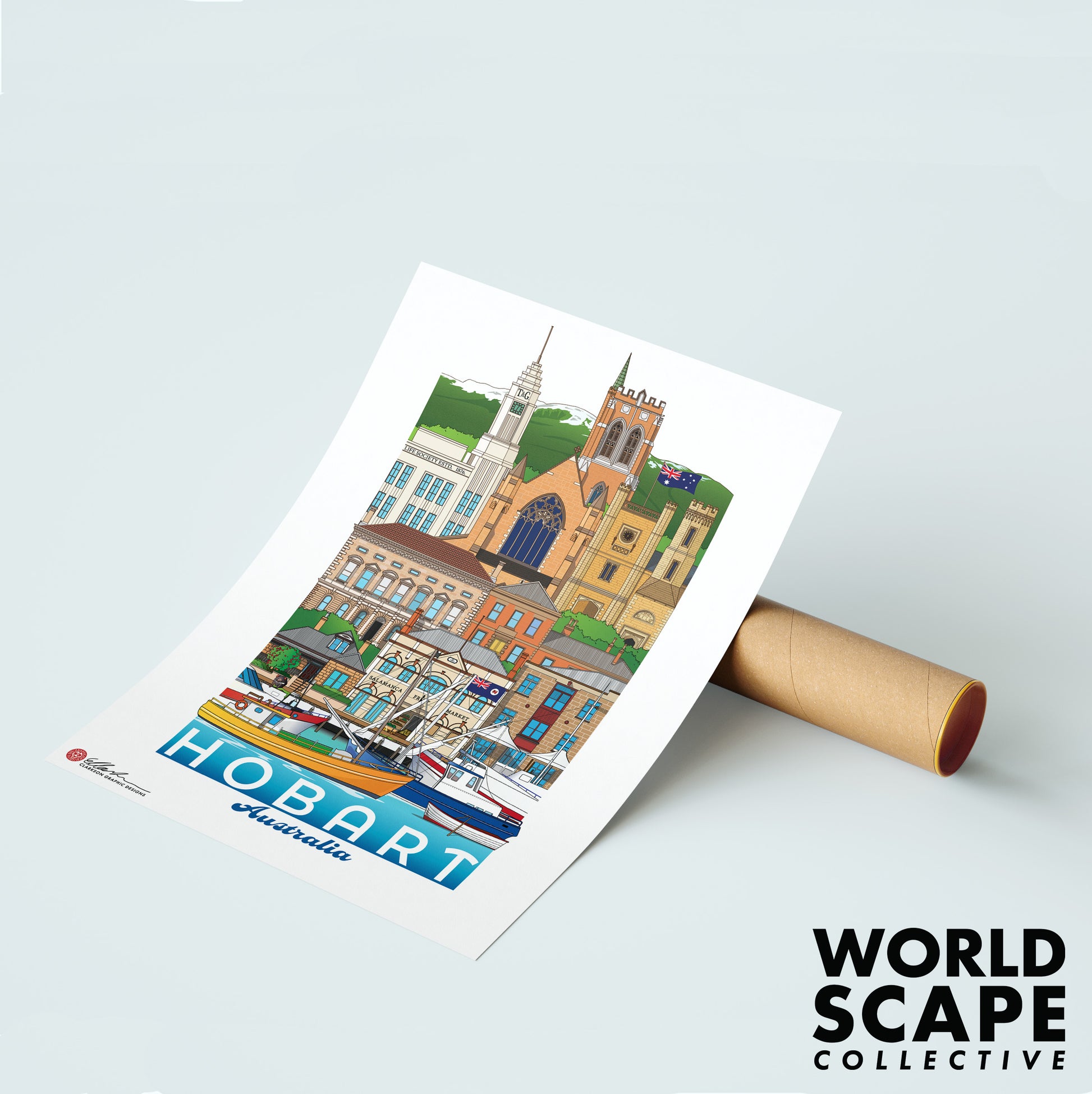T & G Mutual Building, St David's Cathedral, Government House, Town Hall, The Convict Penitentiary, Condril House (46 Warwick St), Salamanca Fruit Market, Salamanca Place, Tasmanian Devil, Constitution Dock and Ships.