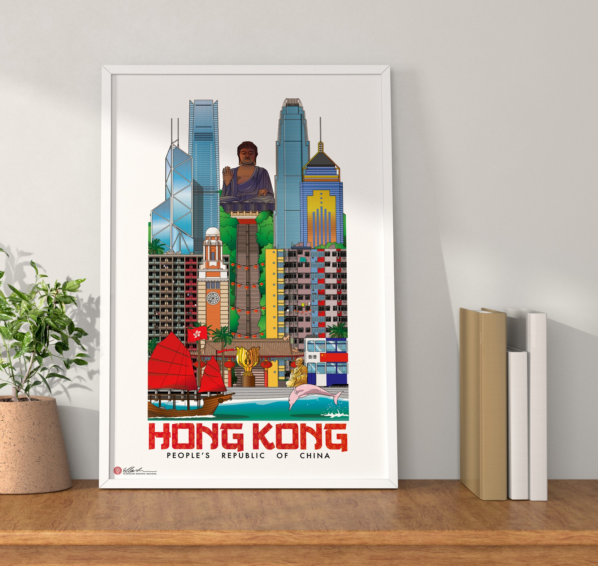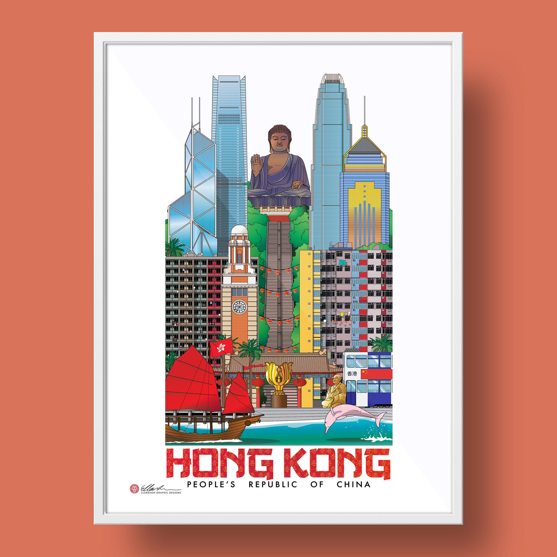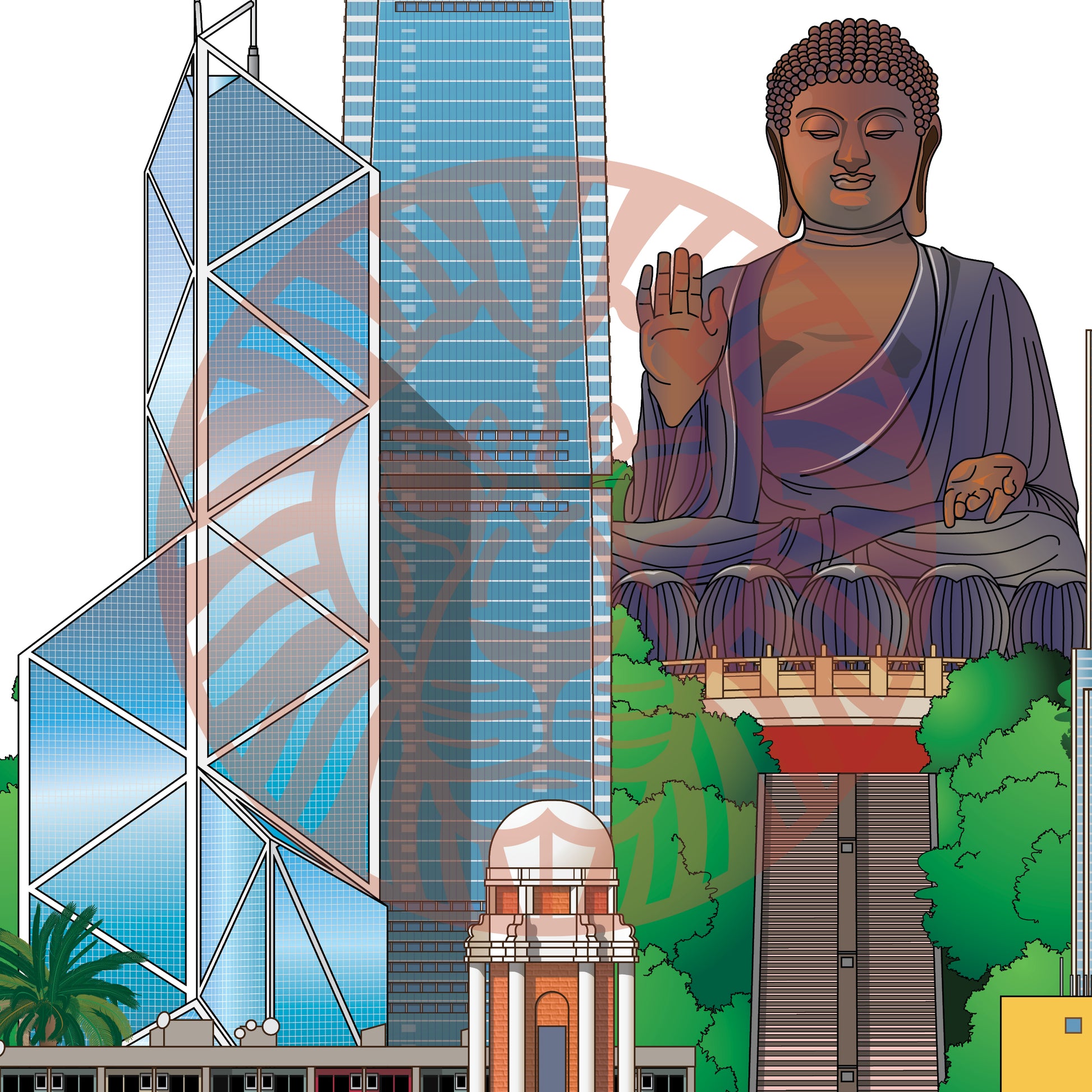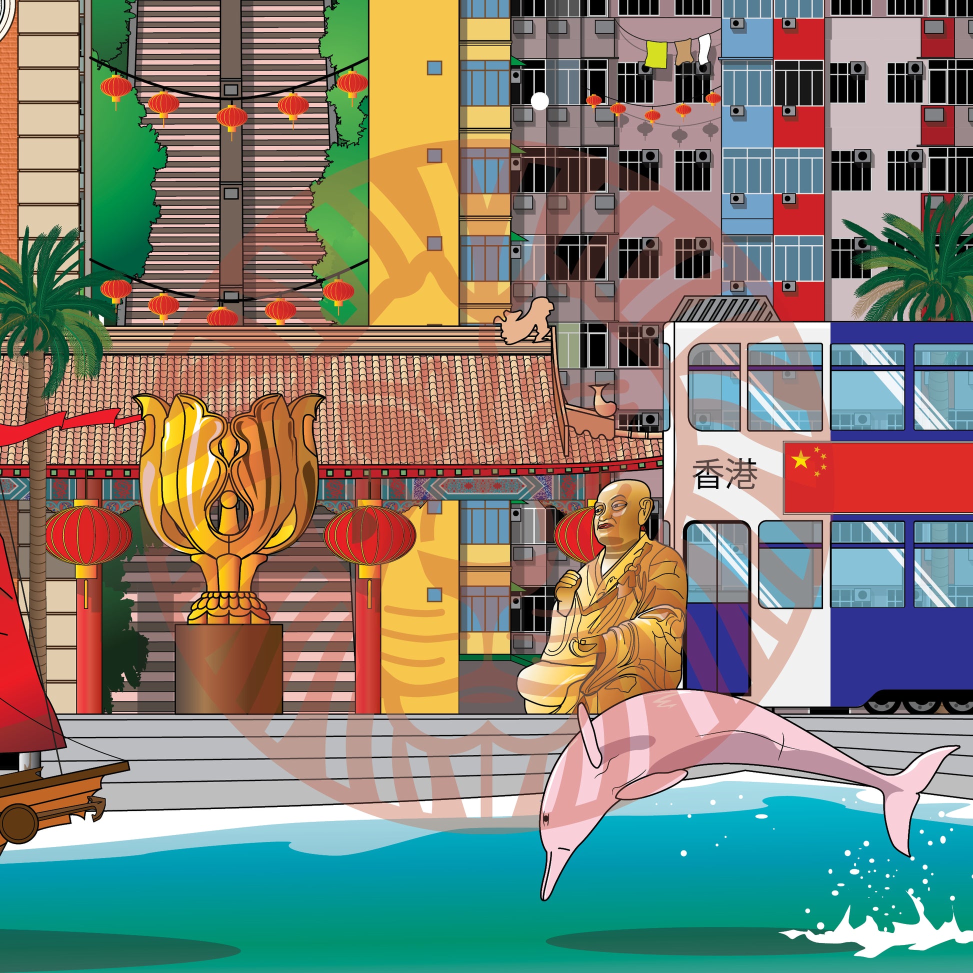 Bank of China Tower, International Commerce Centre (ICC), Tian Tan Buddha, Two International Finance Centre, Central Plaza, Apartment block, Former Kowloon-Canton Railway Clock Tower, Yick Cheong Building (Monster Building), Wong Tai Sin Temple Entrance, Ten Thousand Buddhas Monastery Statue, Double Decker Tram, Chinese 'Junk' Ship, Pink Dolphin.
