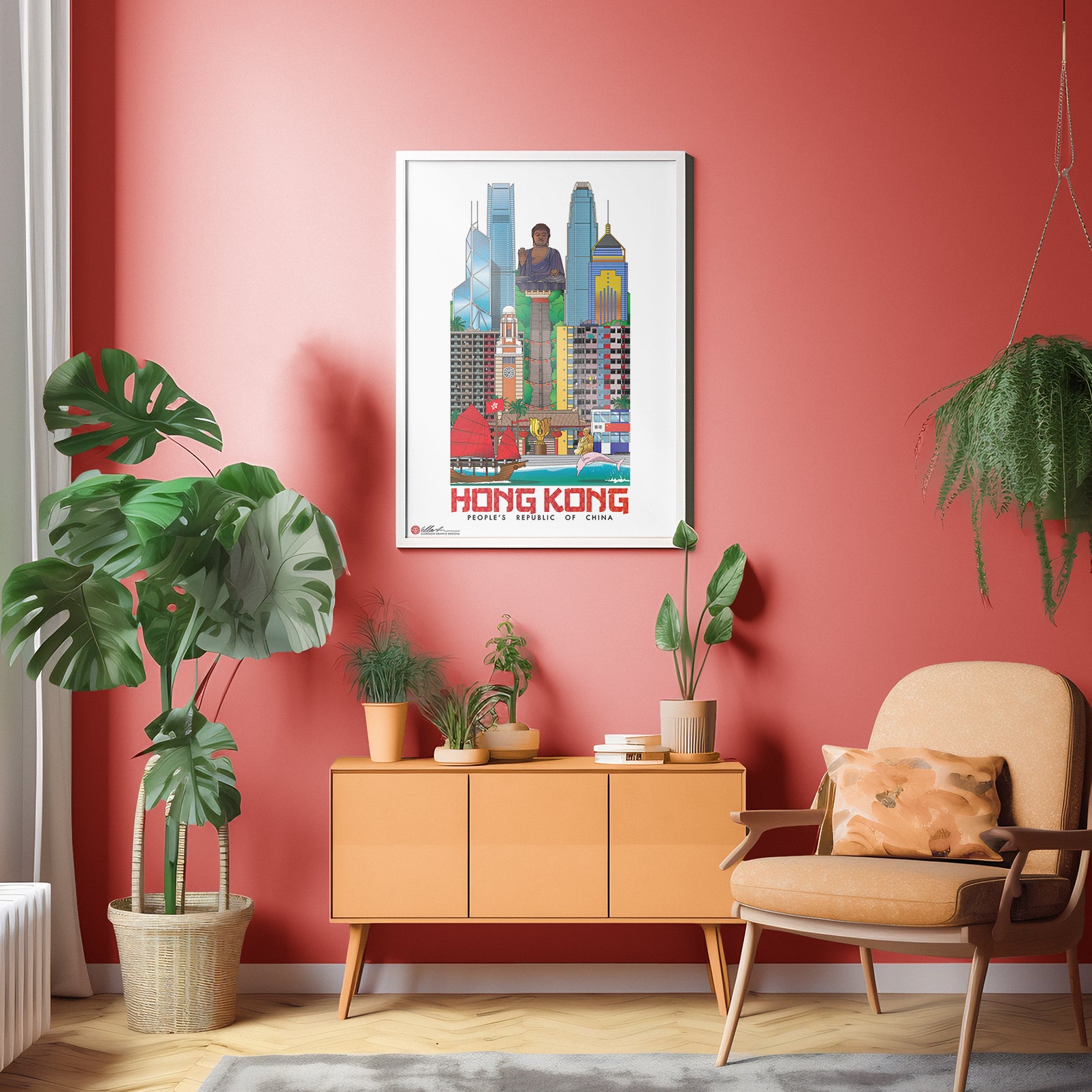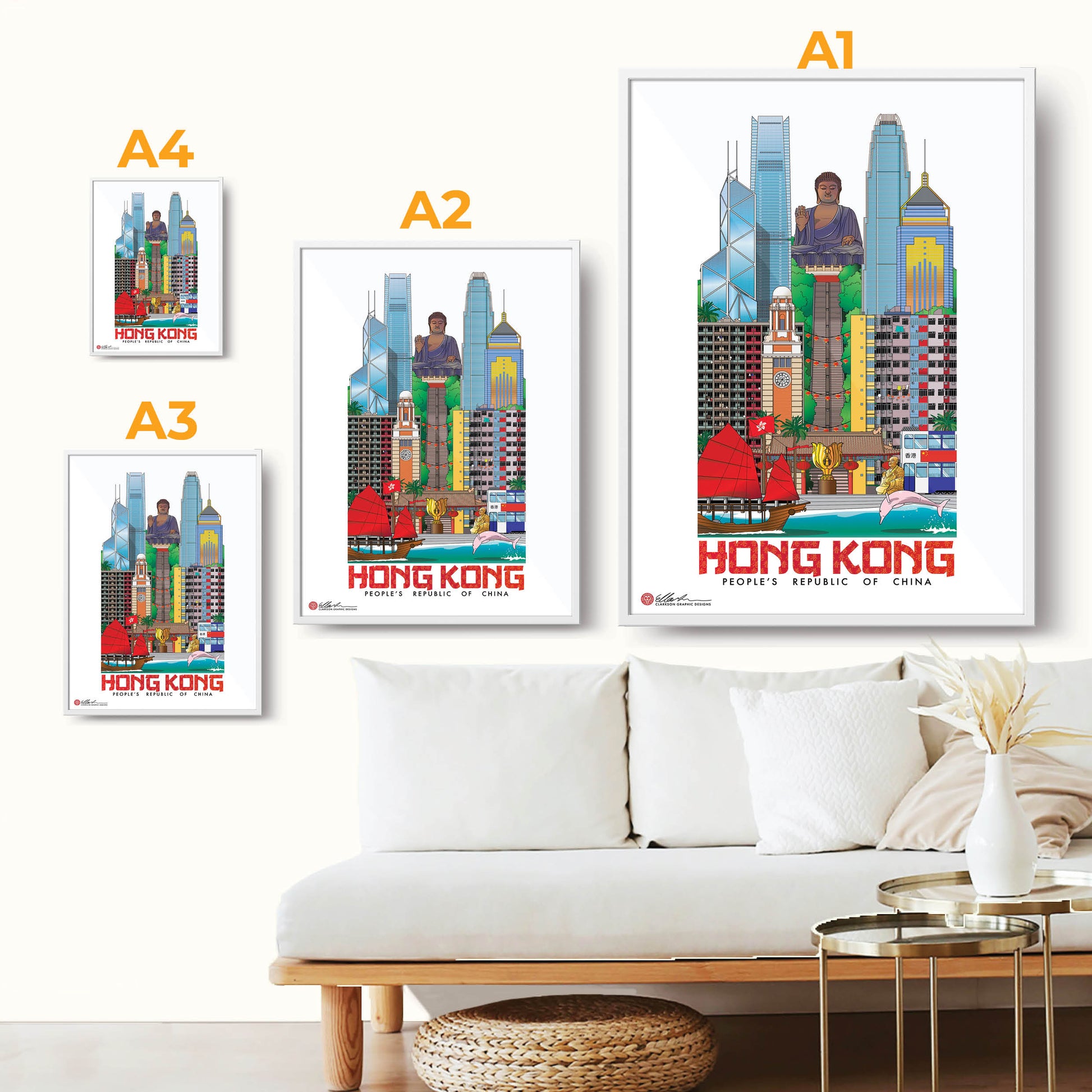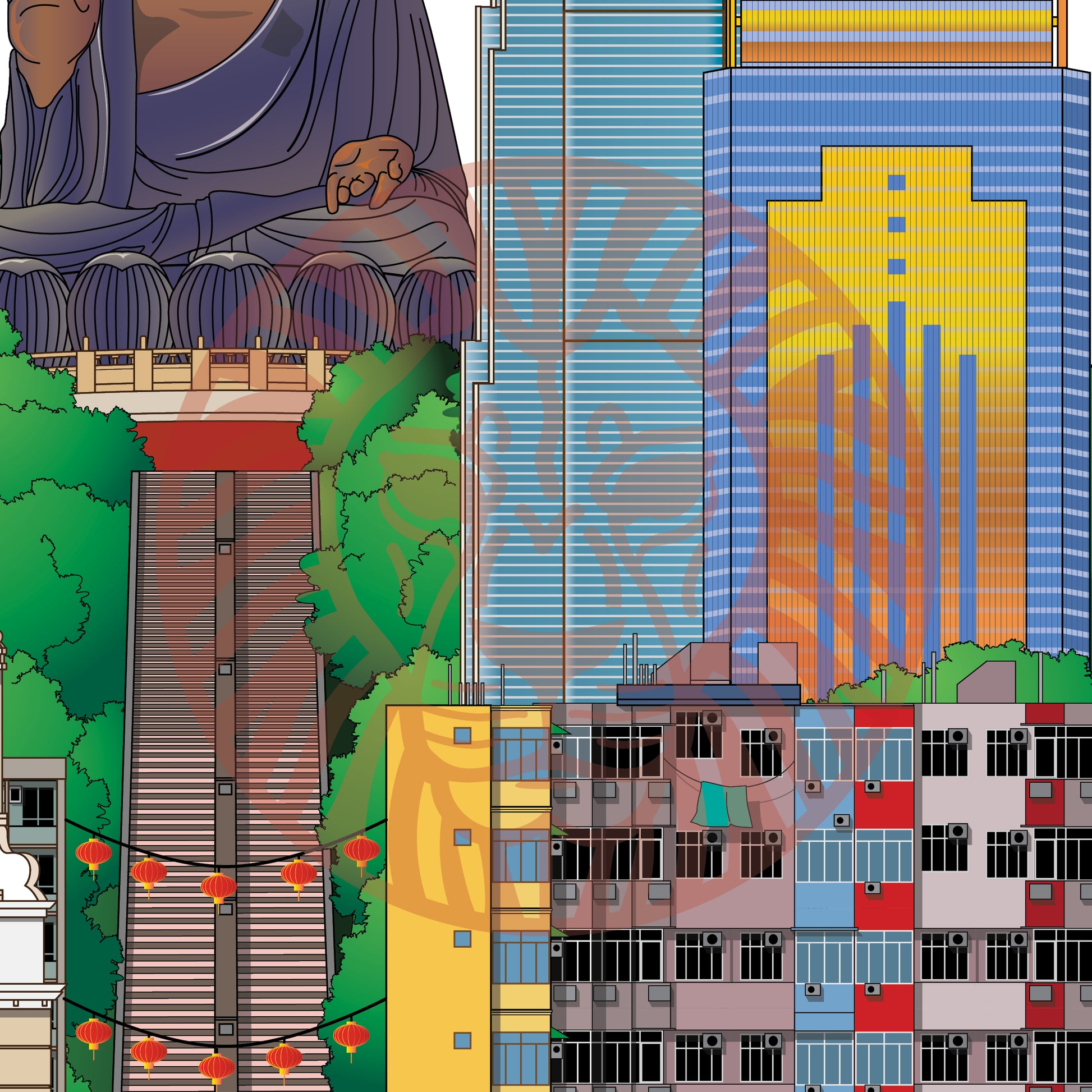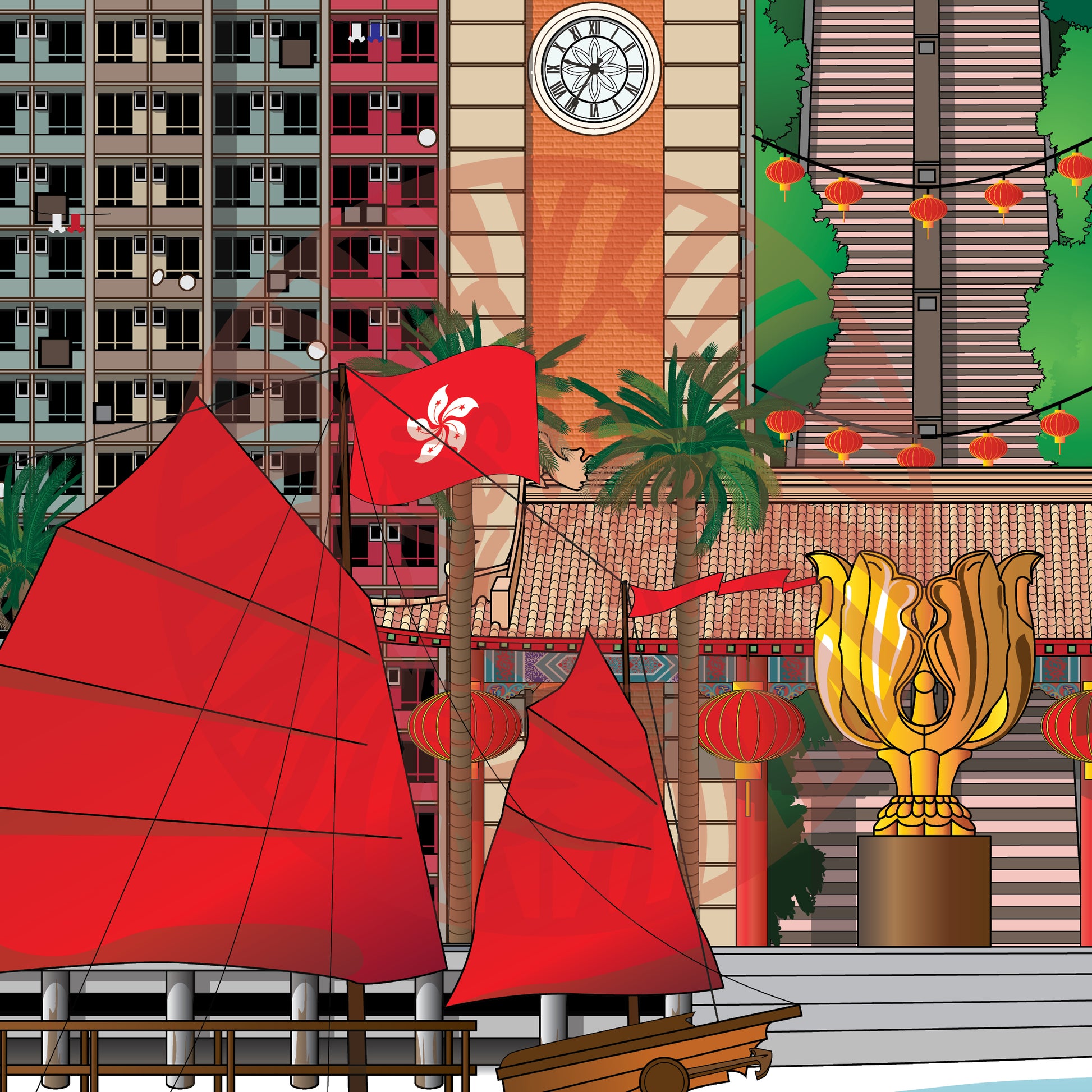Bank of China Tower, International Commerce Centre (ICC), Tian Tan Buddha, Two International Finance Centre, Central Plaza, Apartment block, Former Kowloon-Canton Railway Clock Tower, Yick Cheong Building (Monster Building), Wong Tai Sin Temple Entrance, Ten Thousand Buddhas Monastery Statue, Double Decker Tram, Chinese 'Junk' Ship, Pink Dolphin.