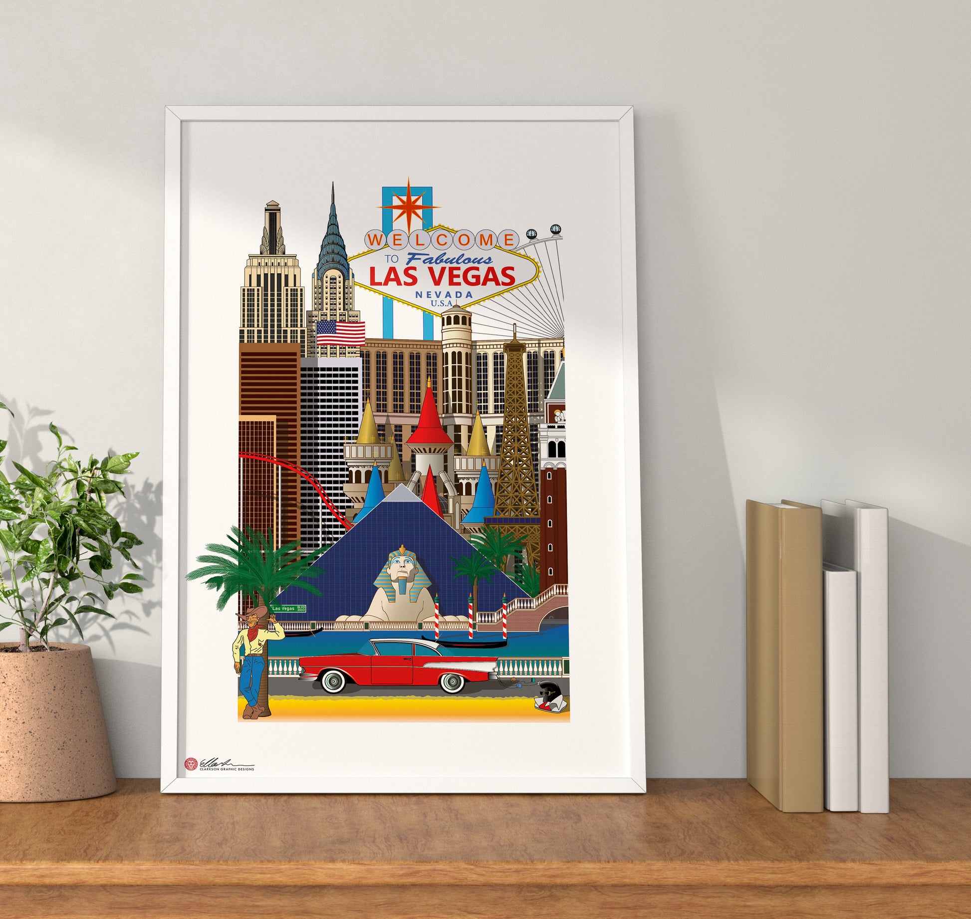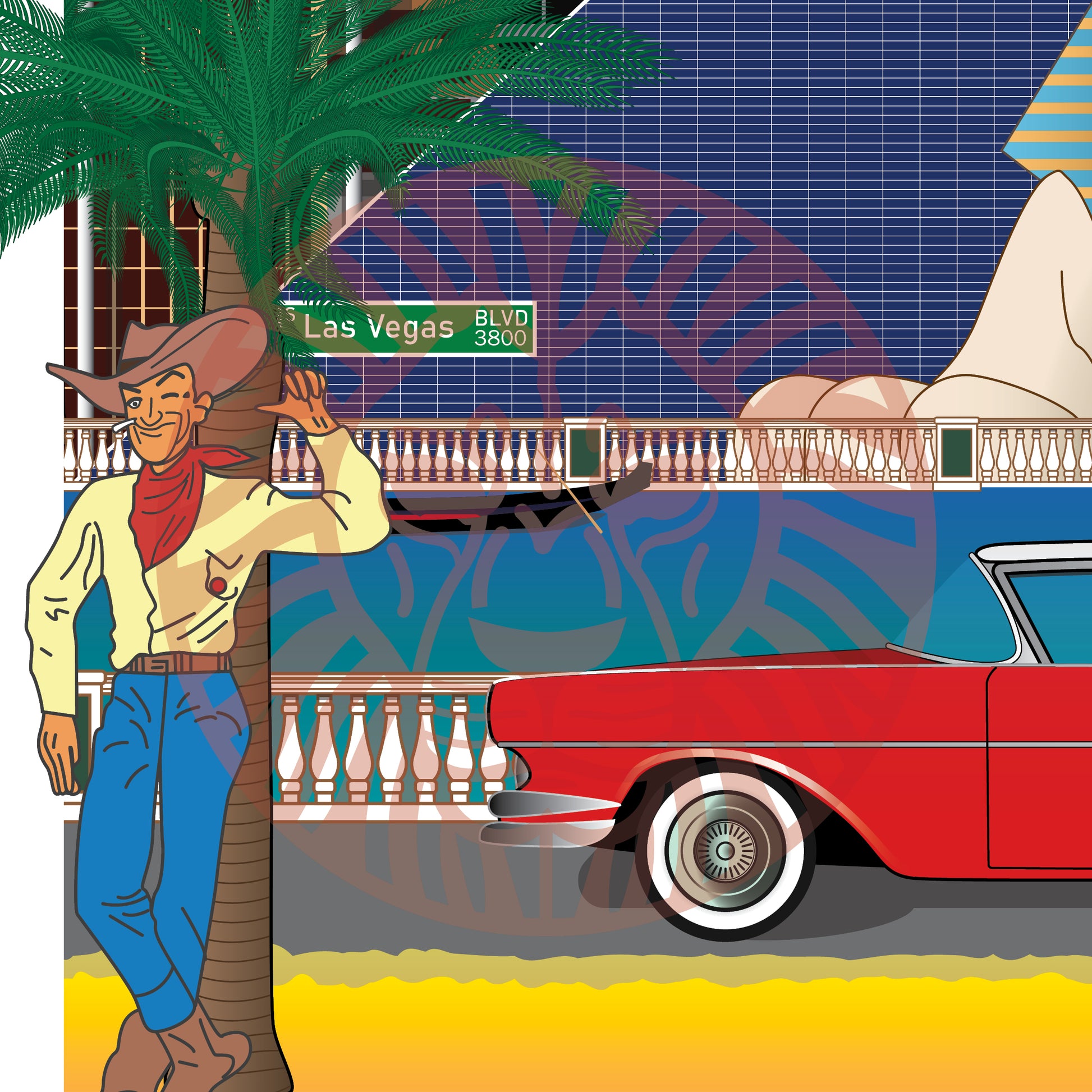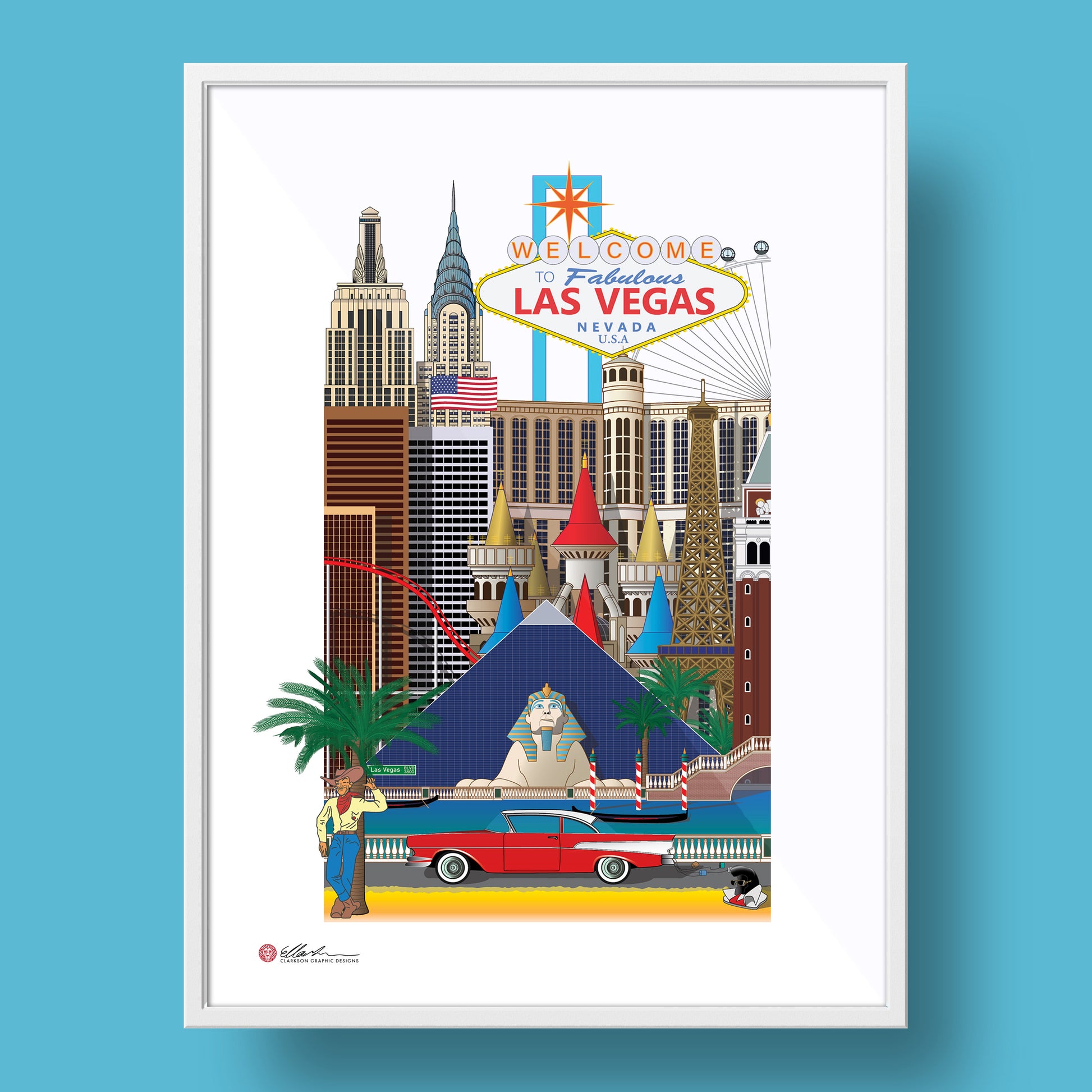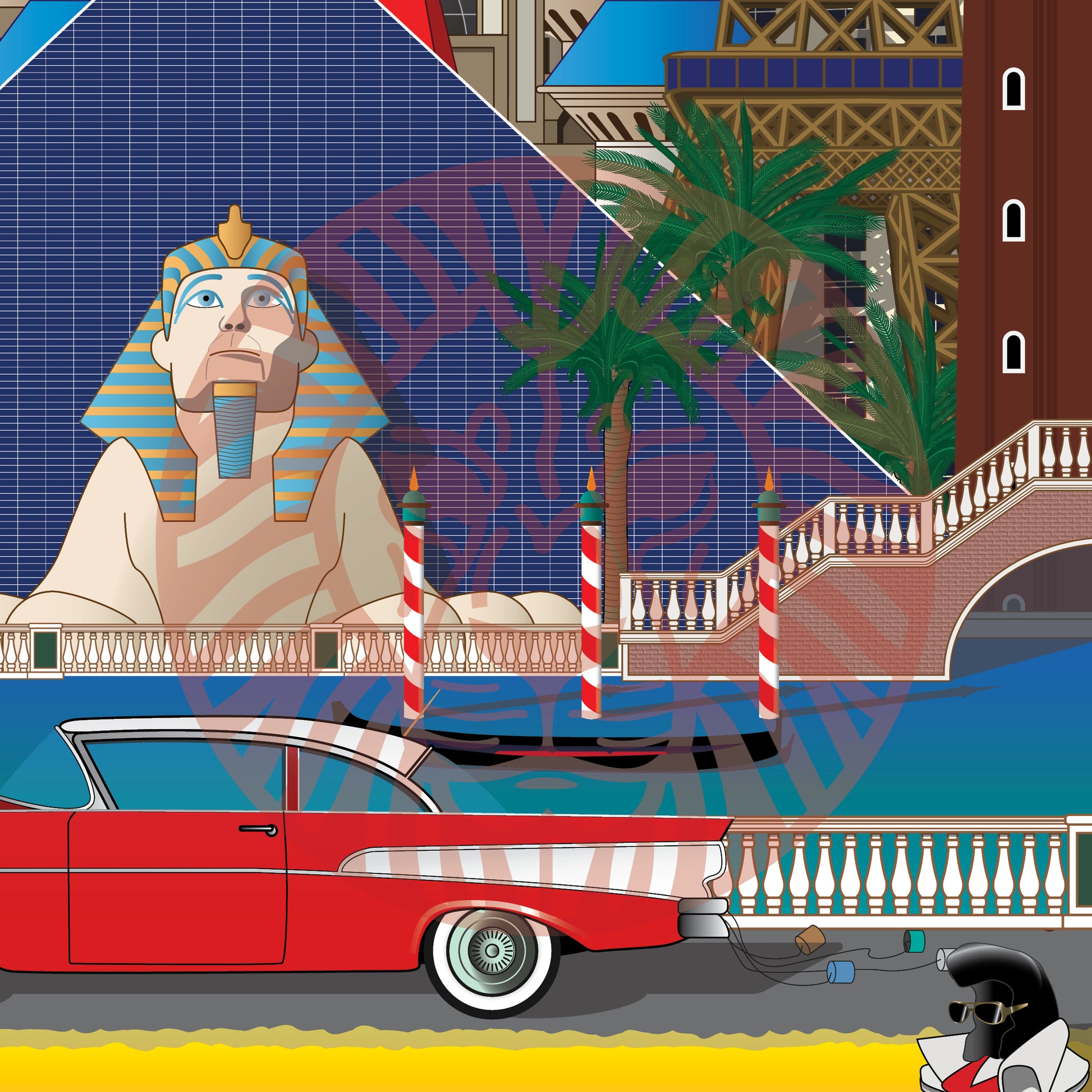 New York-New York Hotel & Casino, Las Vegas Strip Sign, High Roller Ferris Wheel, The Bellagio Hotel & Casino, Excalibur Hotel & Casino, Eiffel Tower Vegas, The Luxor Hotel & Casino, The Venetian Hotel & Casino, Vegas Vic, Vegas Strip, Ford Fairlane, Elvis Costume.