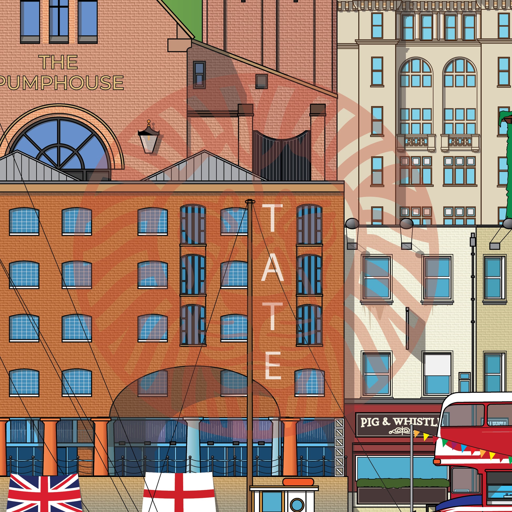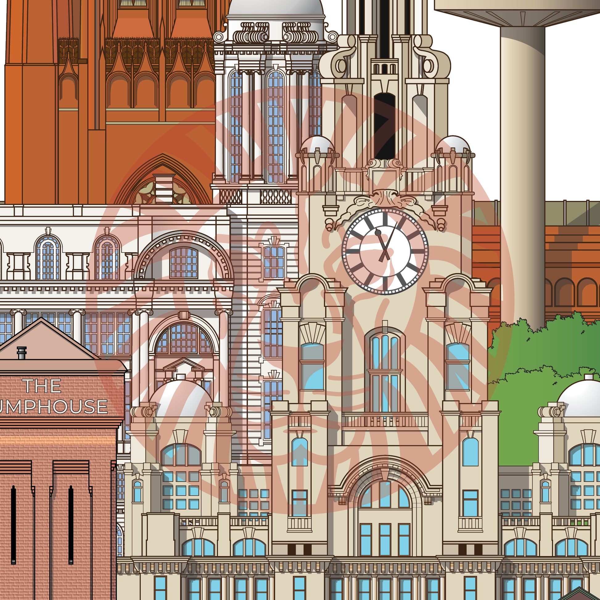 Port of Liverpool Building, Liverpool Cathedral, St John's Beacon, The Pumphouse, The Royal Liver Building, Tate Liverpool, The Pig & Whistle Pub,