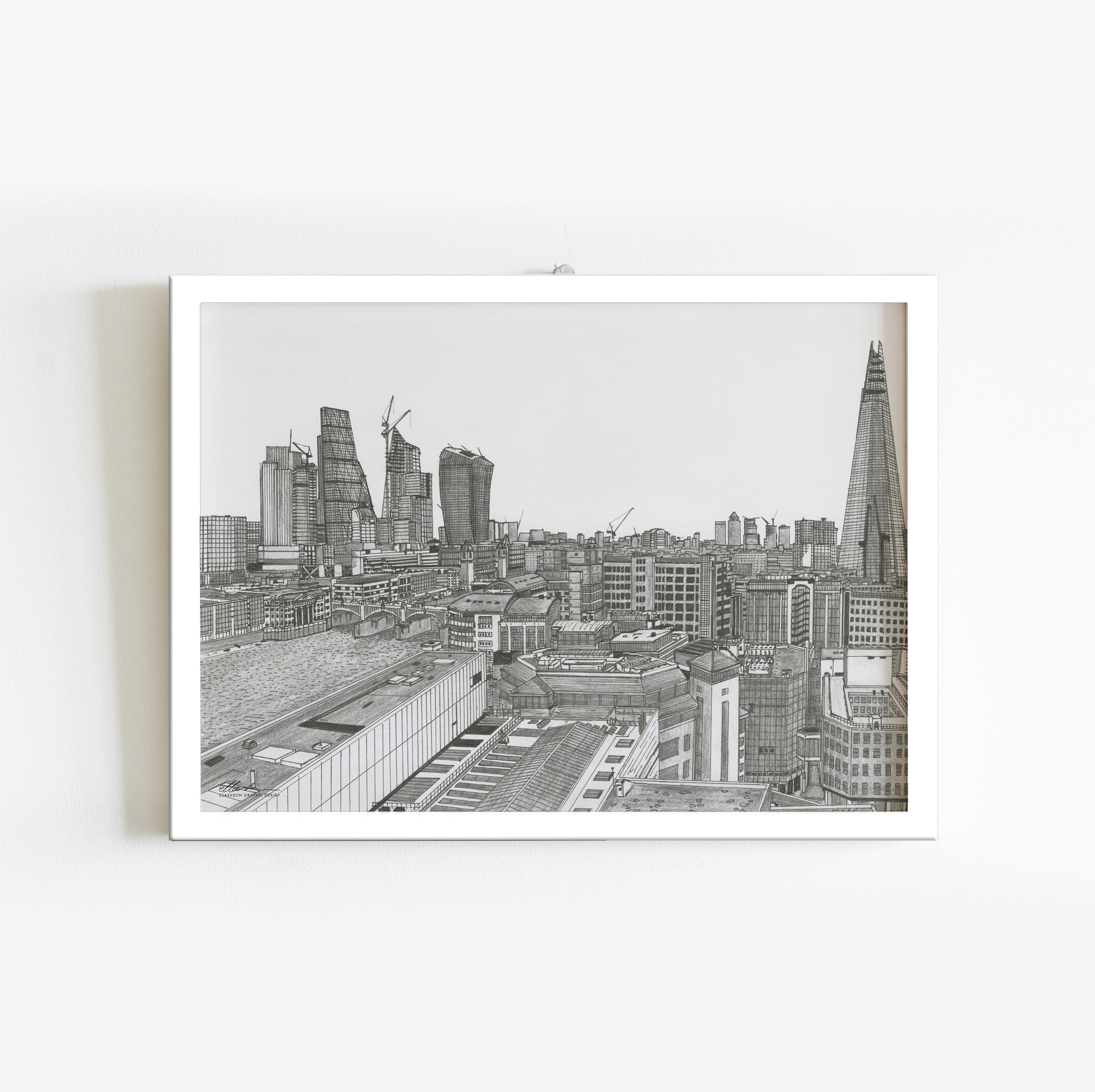 The capital of England and the United Kingdom, London is an ever-changing metropolis with many buildings from its two millennia history. This artwork is from the Tate Modern Gallery, looking across to the City of London and the Shard.