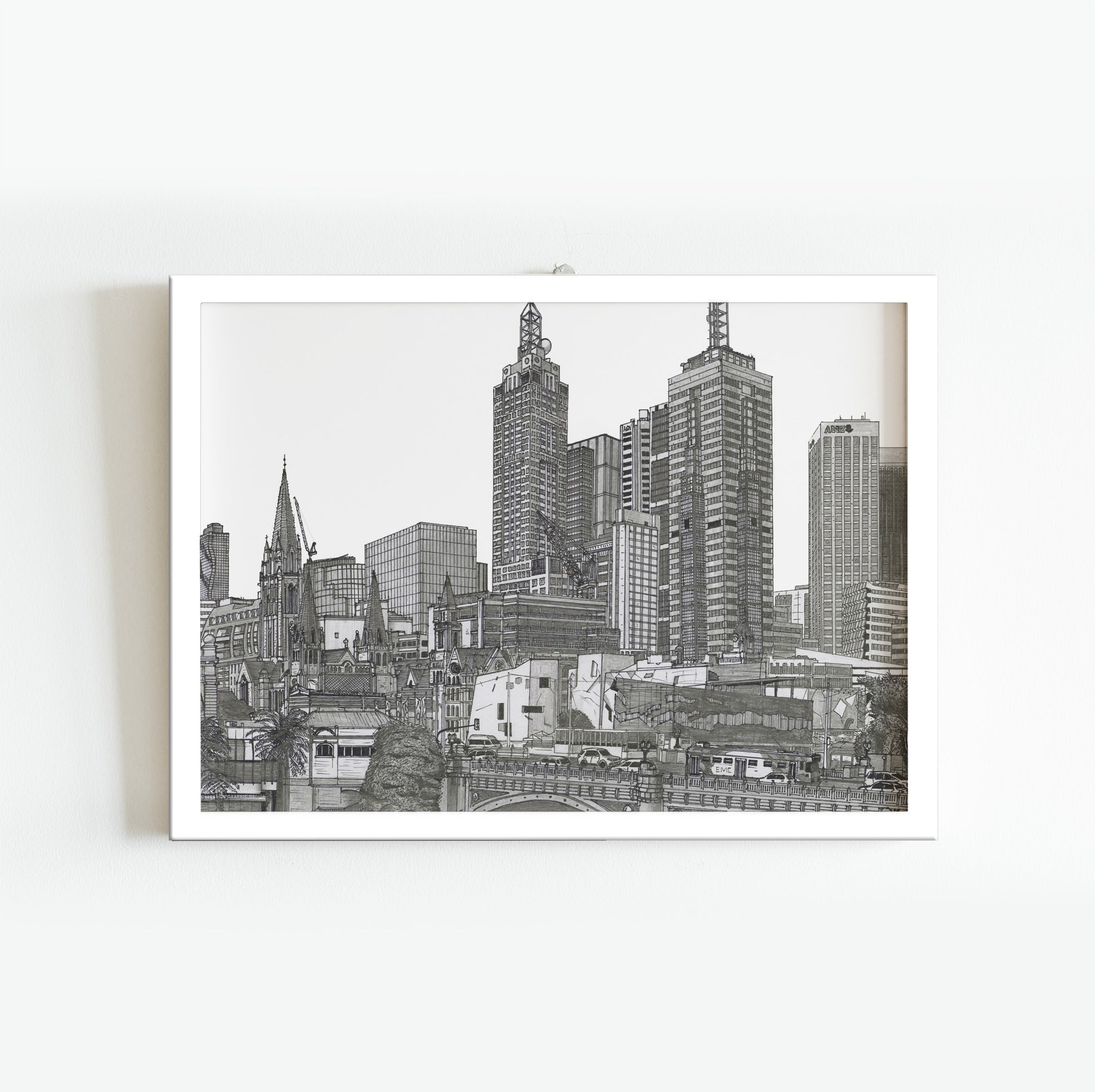 The capital of the state of Victoria and Australia's most populous city, Melbourne is known for its street art, culture, and high standard of living. This artwork is of Federation Square and East End from the Southbank Promenade.