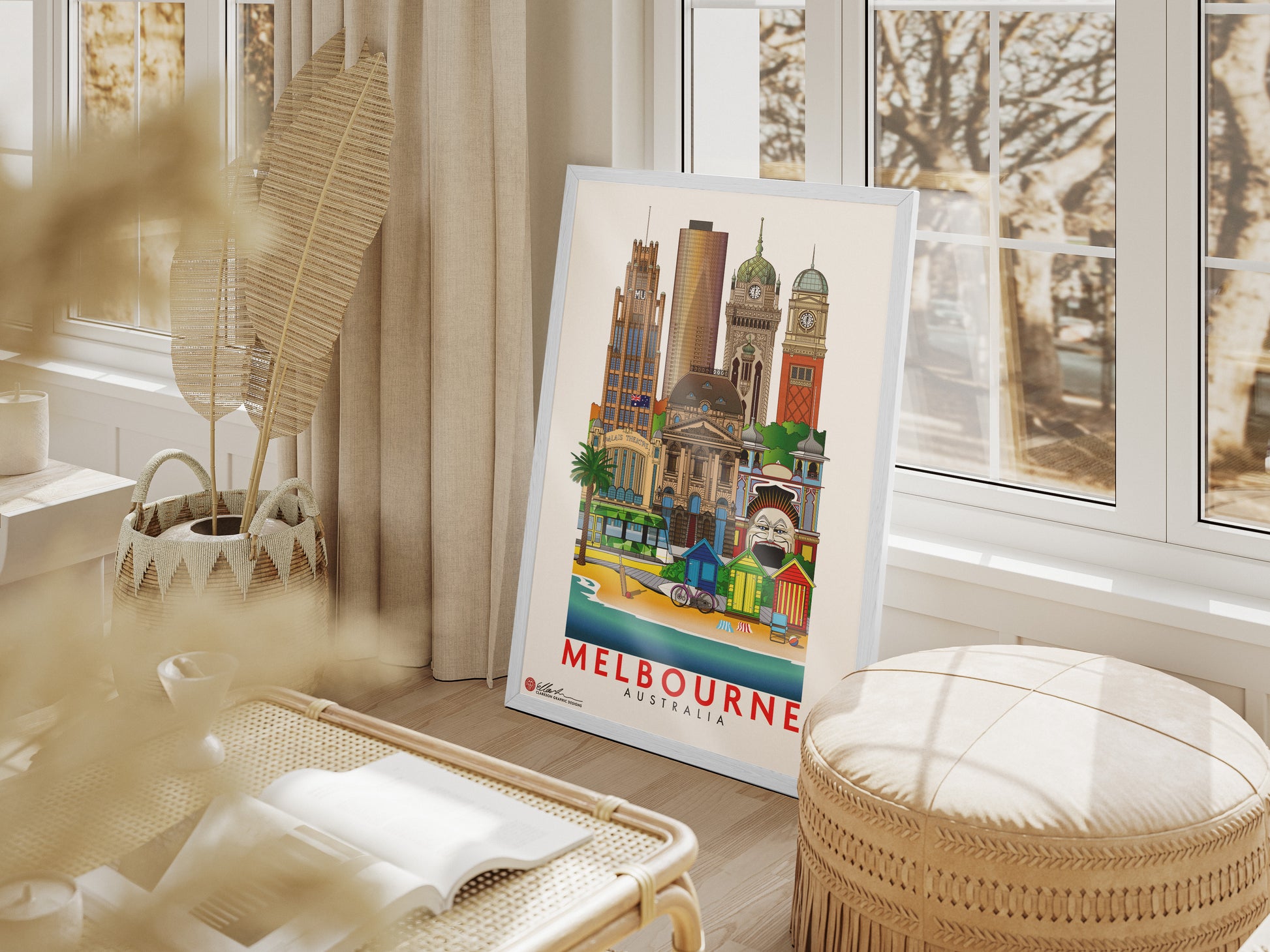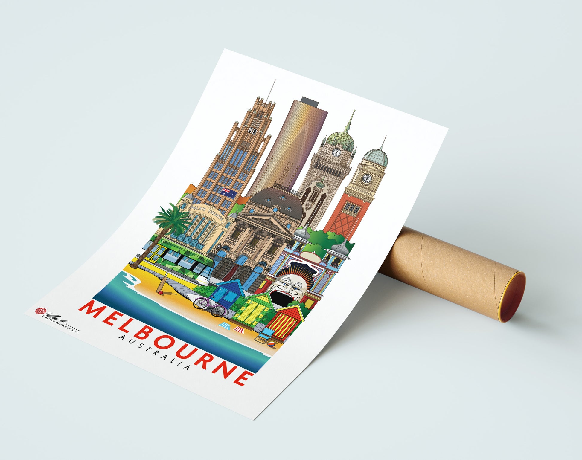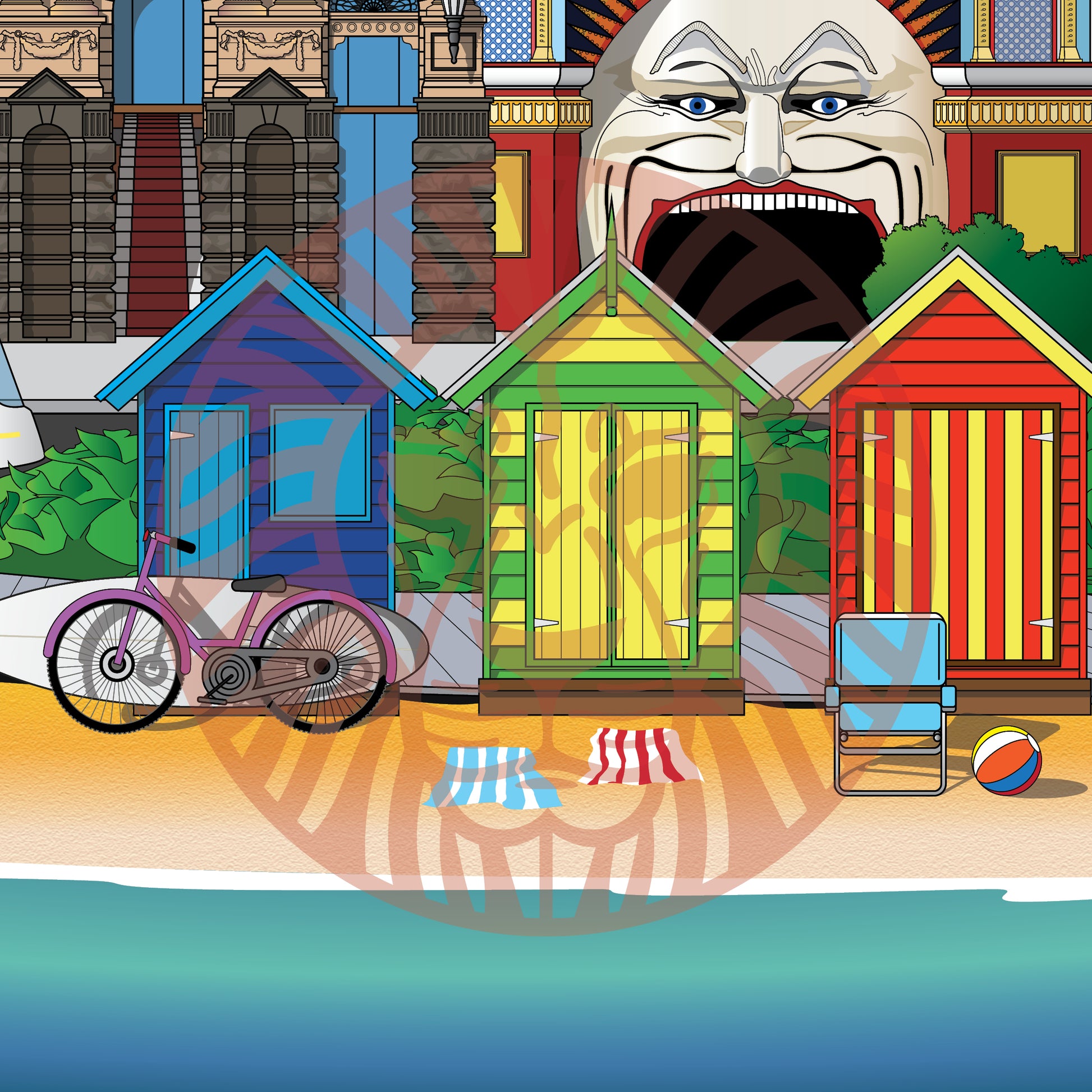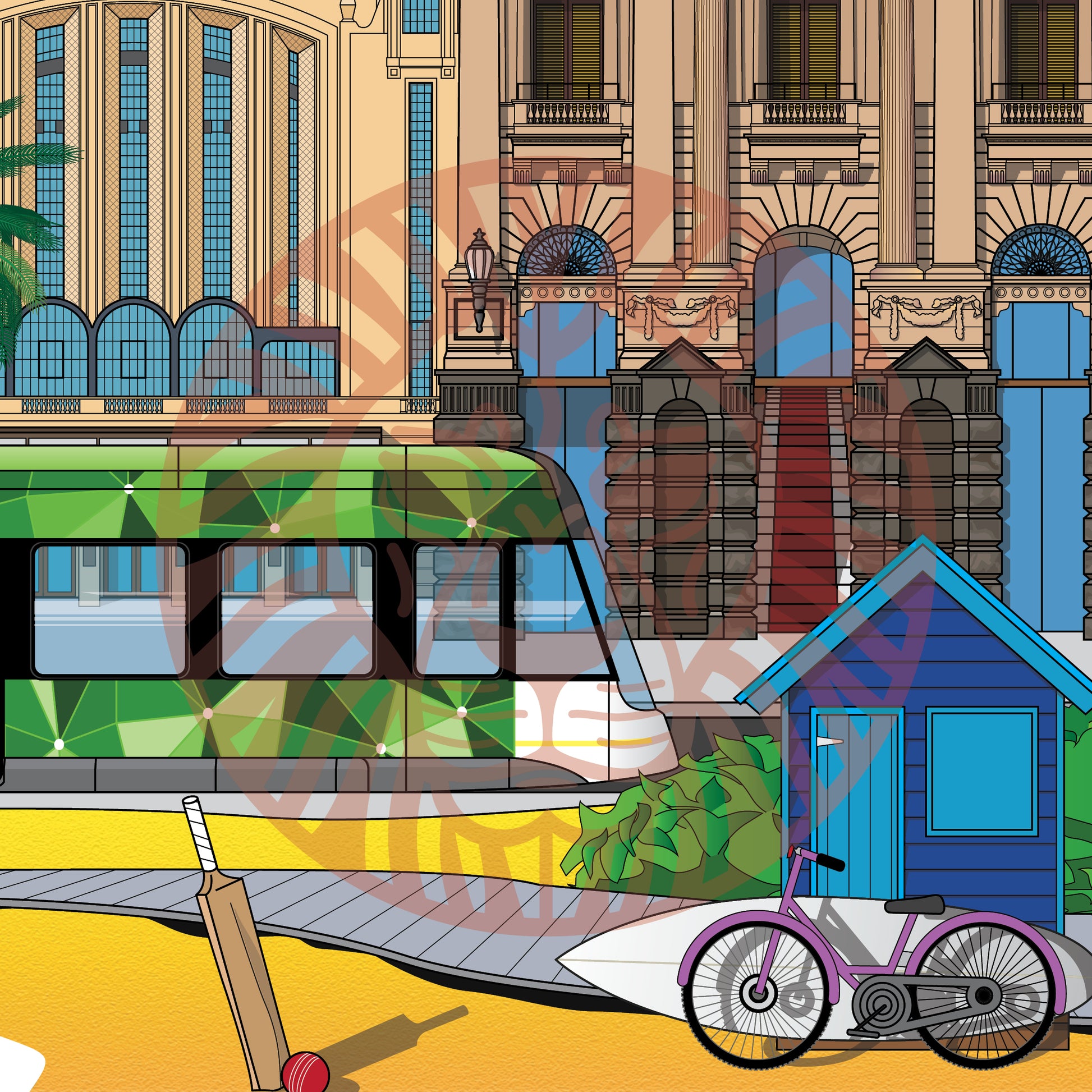 Manchester Unity Building, Prima Pearl Skyscraper, The Forum Clock Tower, Carlo Catani Memorial Clock Tower, Palais Theatre, Town Hall, Luna Park Melbourne, City Tram, Brighton Beach Huts, St Kilda Beach, Cricket Set.