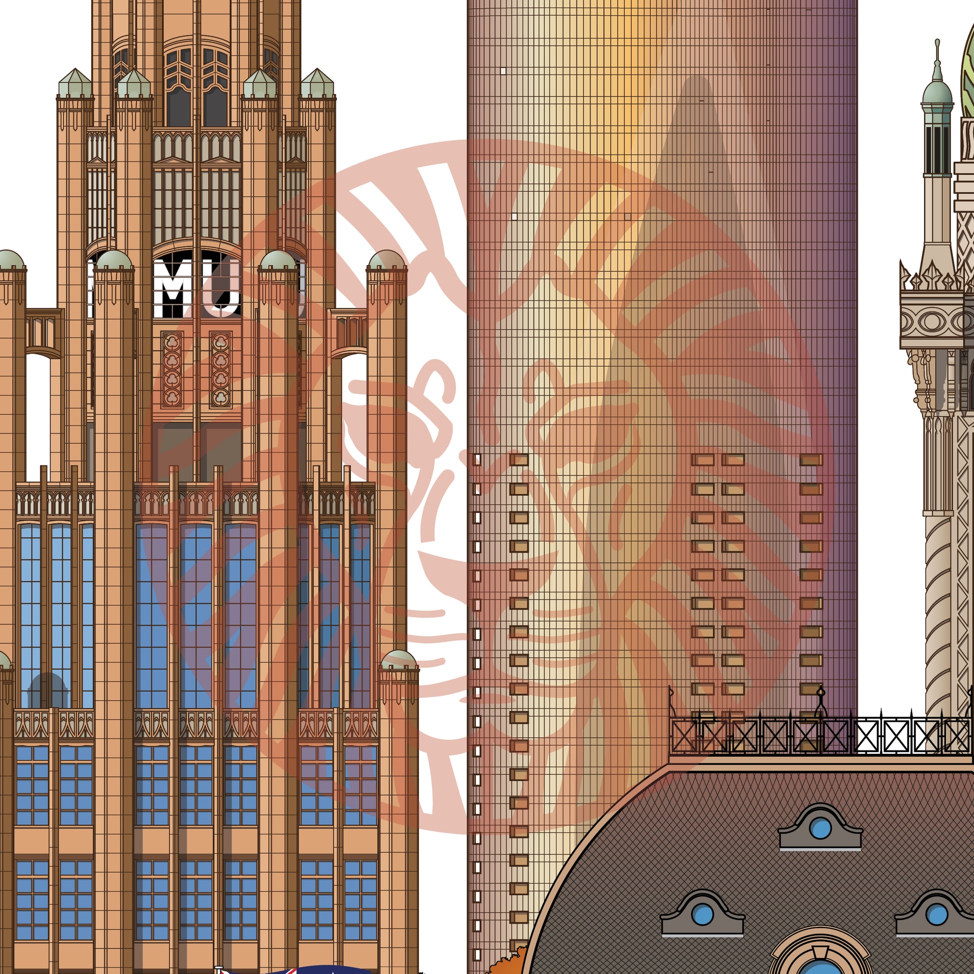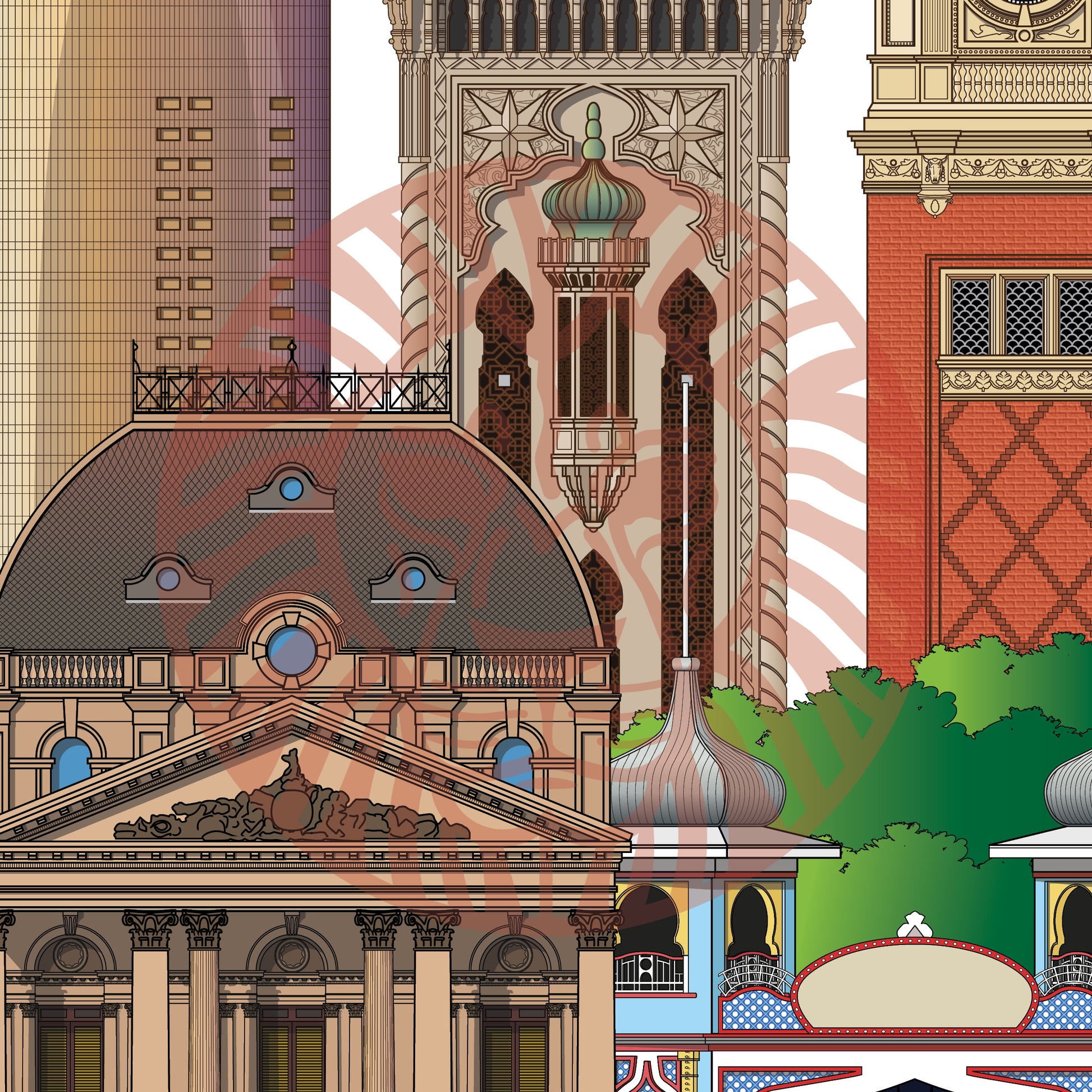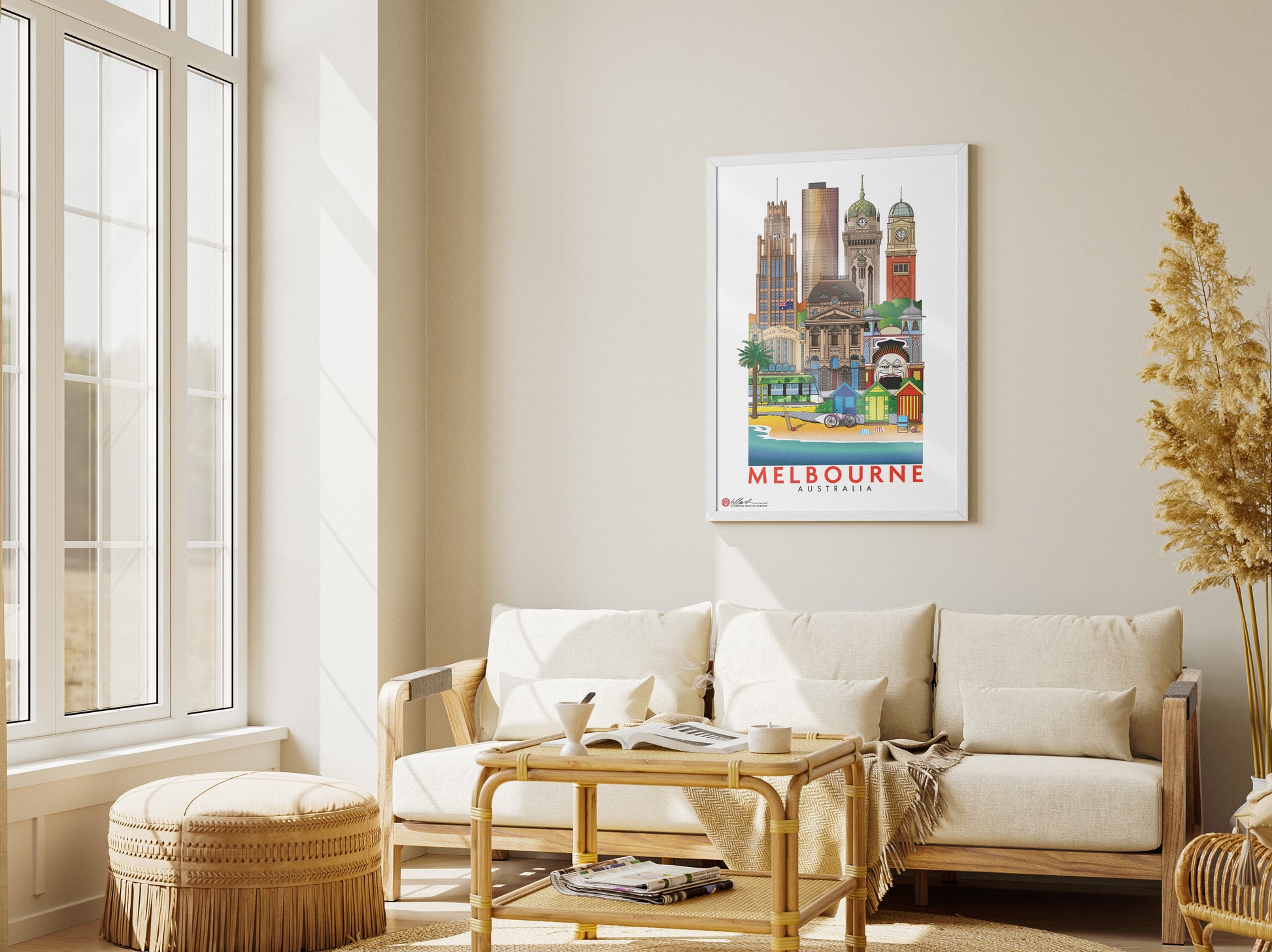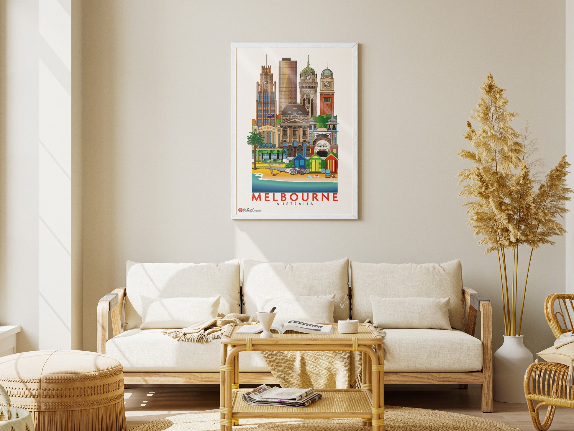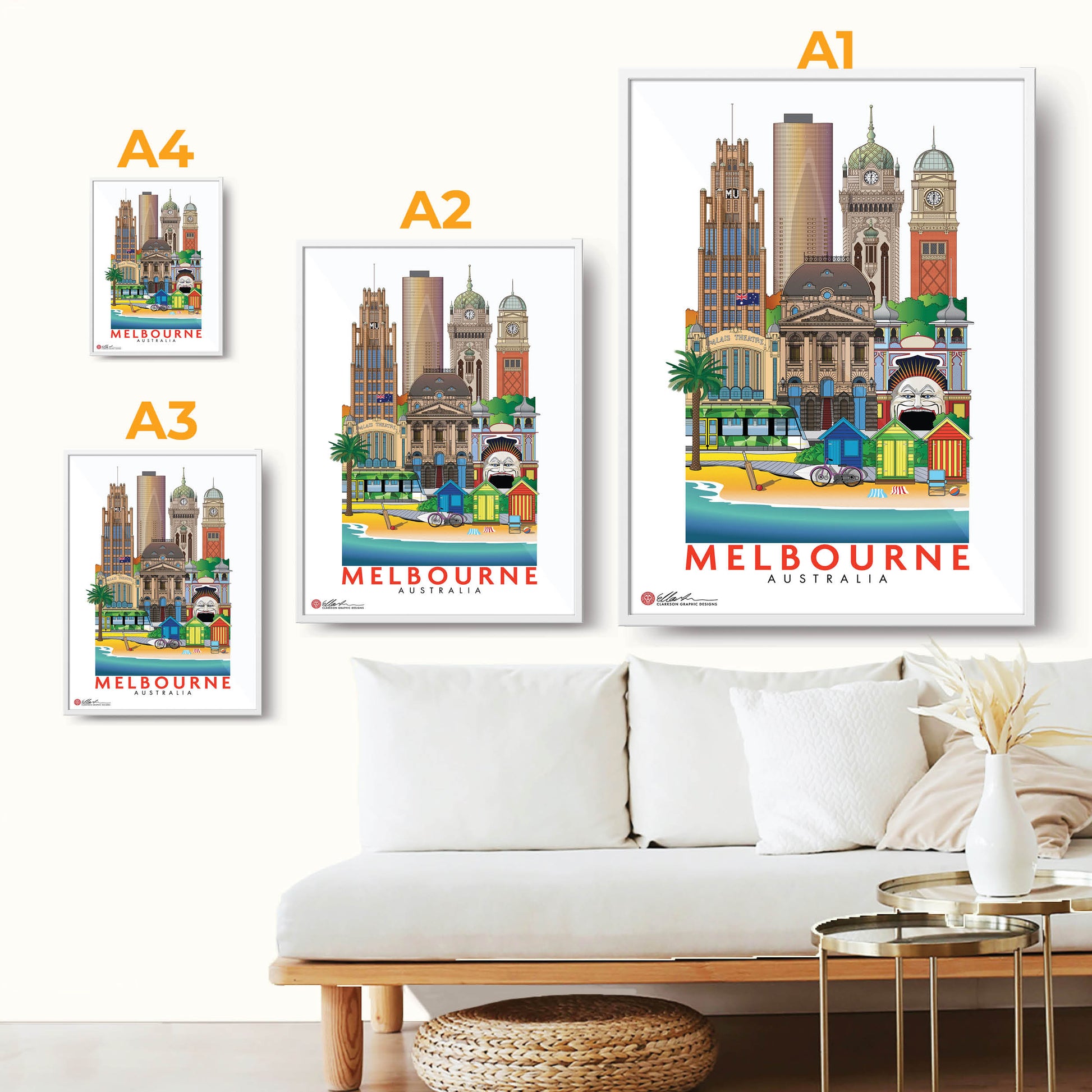 Manchester Unity Building, Prima Pearl Skyscraper, The Forum Clock Tower, Carlo Catani Memorial Clock Tower, Palais Theatre, Town Hall, Luna Park Melbourne, City Tram, Brighton Beach Huts, St Kilda Beach, Cricket Set.