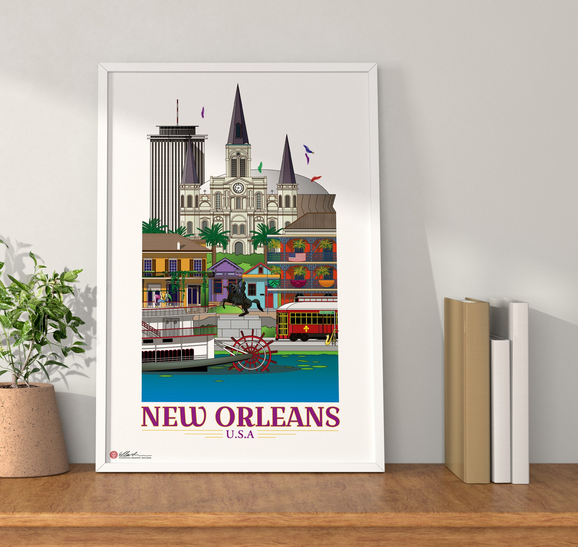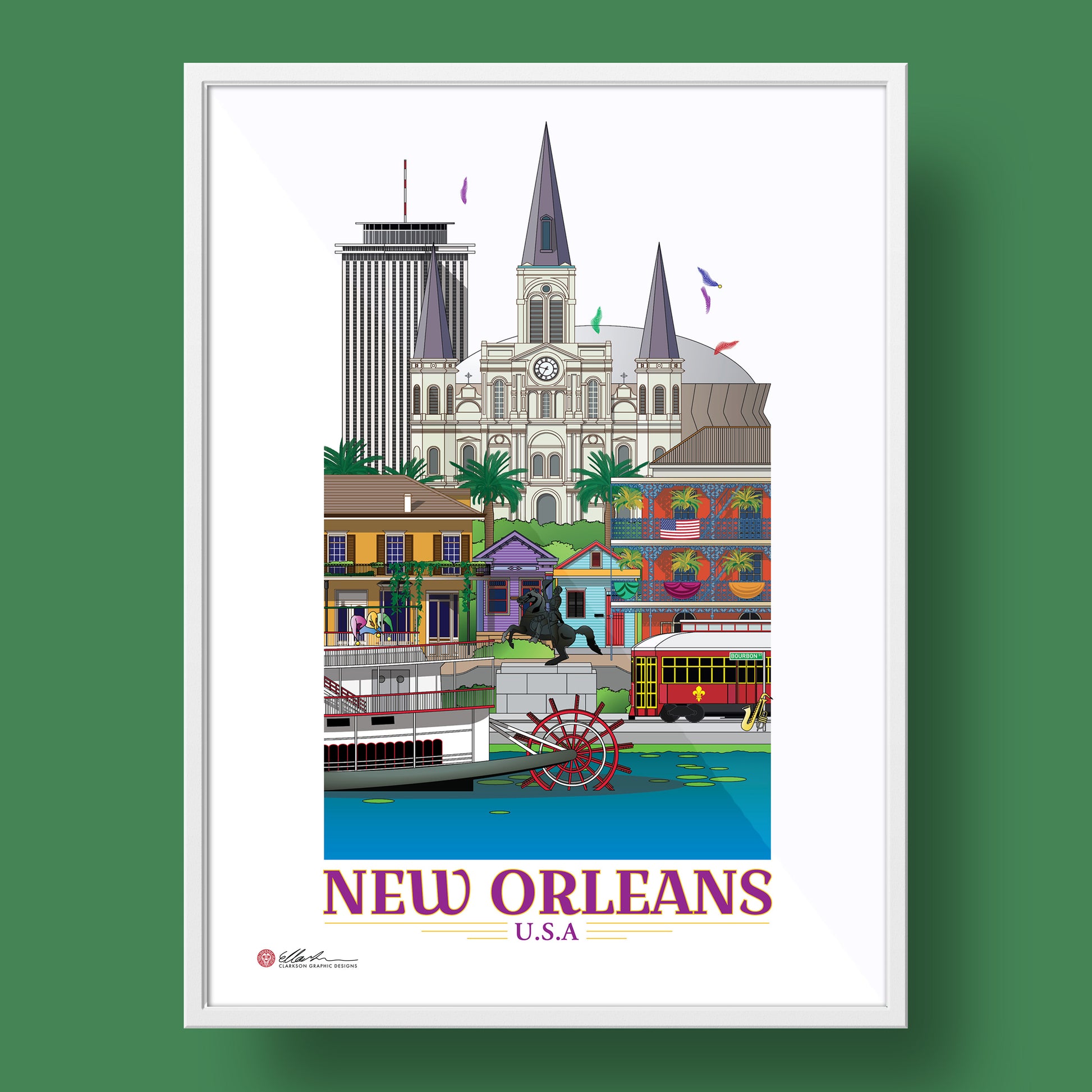 Four Seasons Hotel, St. Louis Cathedral, Caesars Superdome, French Quarter House, Shotgun Houses, Andrew Jackson Equestrian Statue, The LaBranche House, Tram, Jazz Instruments, Steamboat NATCHEZ, The Mississippi River.