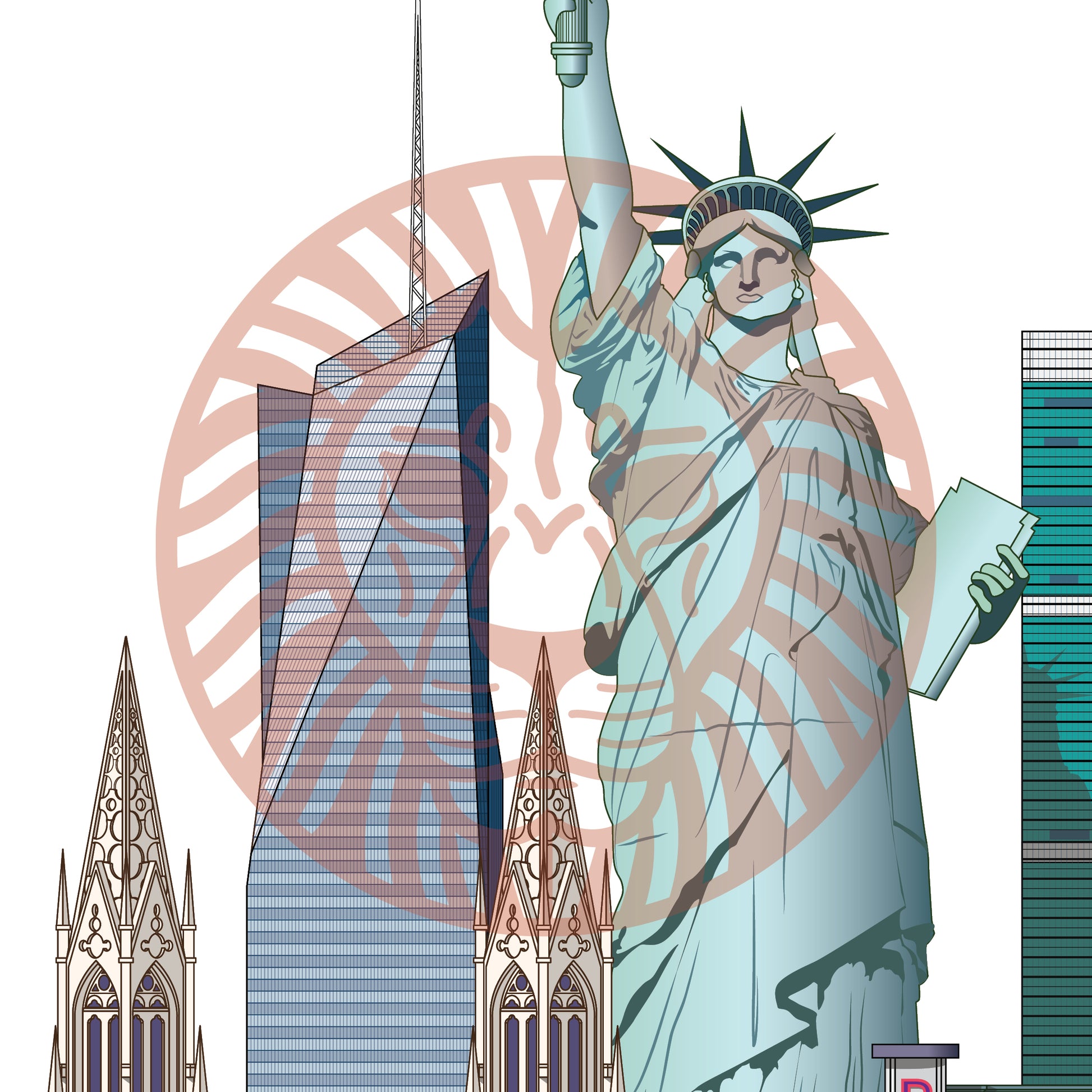 Bank of America Tower, The Statue of Liberty, 432 Park Avenue Condominiums, United Nations Headquarters, St Patrick's Cathedral, Radio City Music Hall, Manhattan Apartments, Subway, Hot Dog Stand, Staten Island Ferry, The Hudson River.
