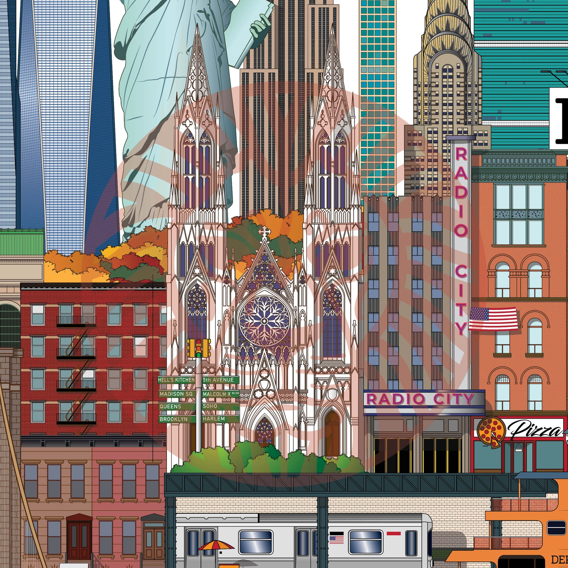 New York apartments, Subway, Brooklyn Bridge, Yellow Taxi, Bank of America Tower, The Statue of Liberty, 432 Park Avenue Condominiums, United Nations Headquarters, St Patrick's Cathedral, Radio City Music Hall, Manhattan Apartments, Subway, Hot Dog Stand, Staten Island Ferry, The Hudson River.