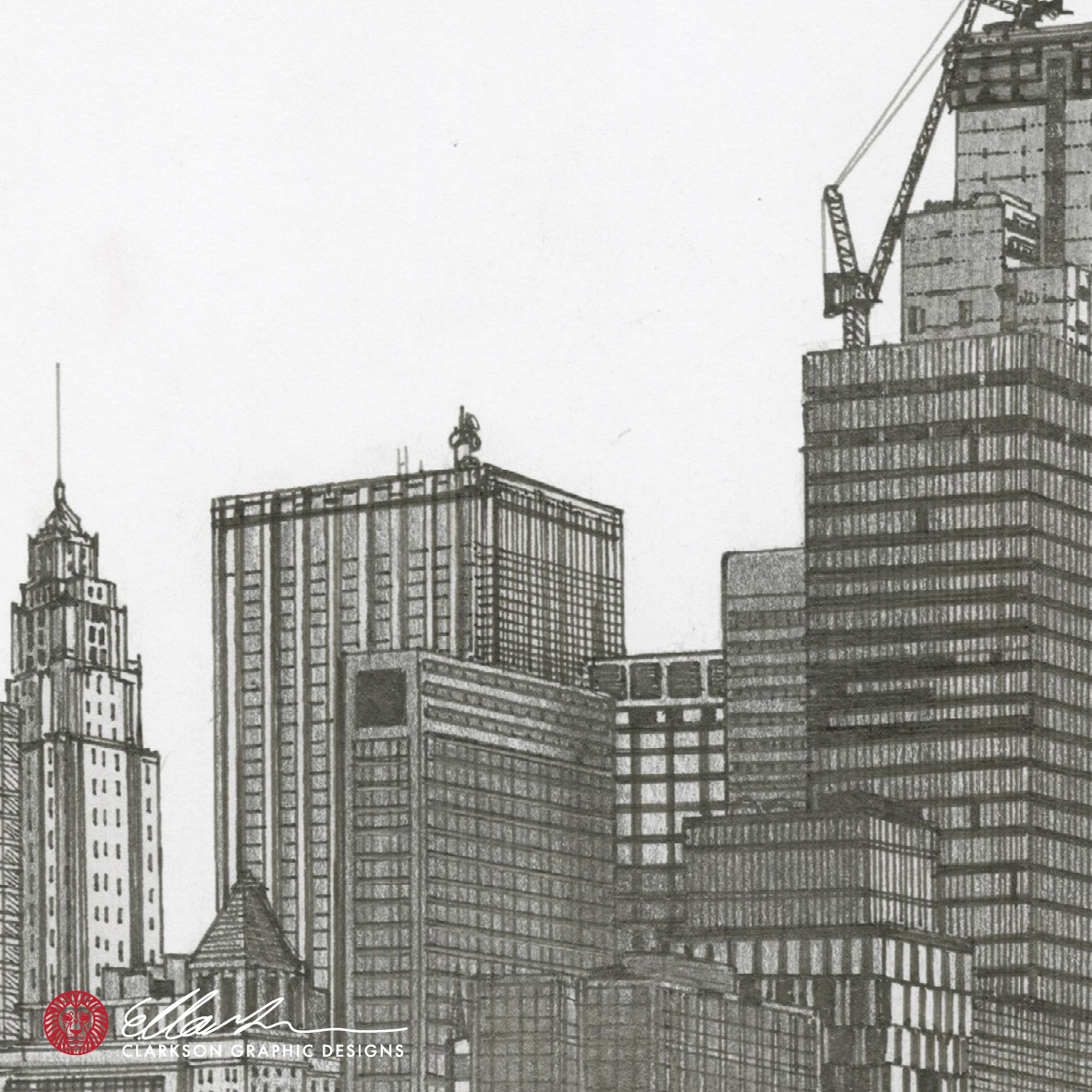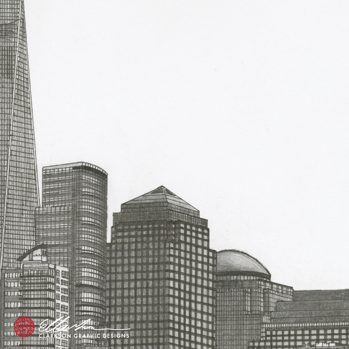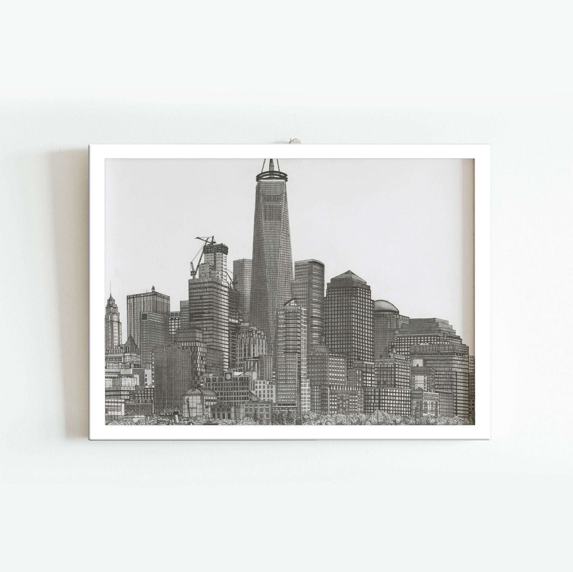This artwork is of Lower Manhattan and the Financial District from the Hudson River, looking towards One World Trade Center.
