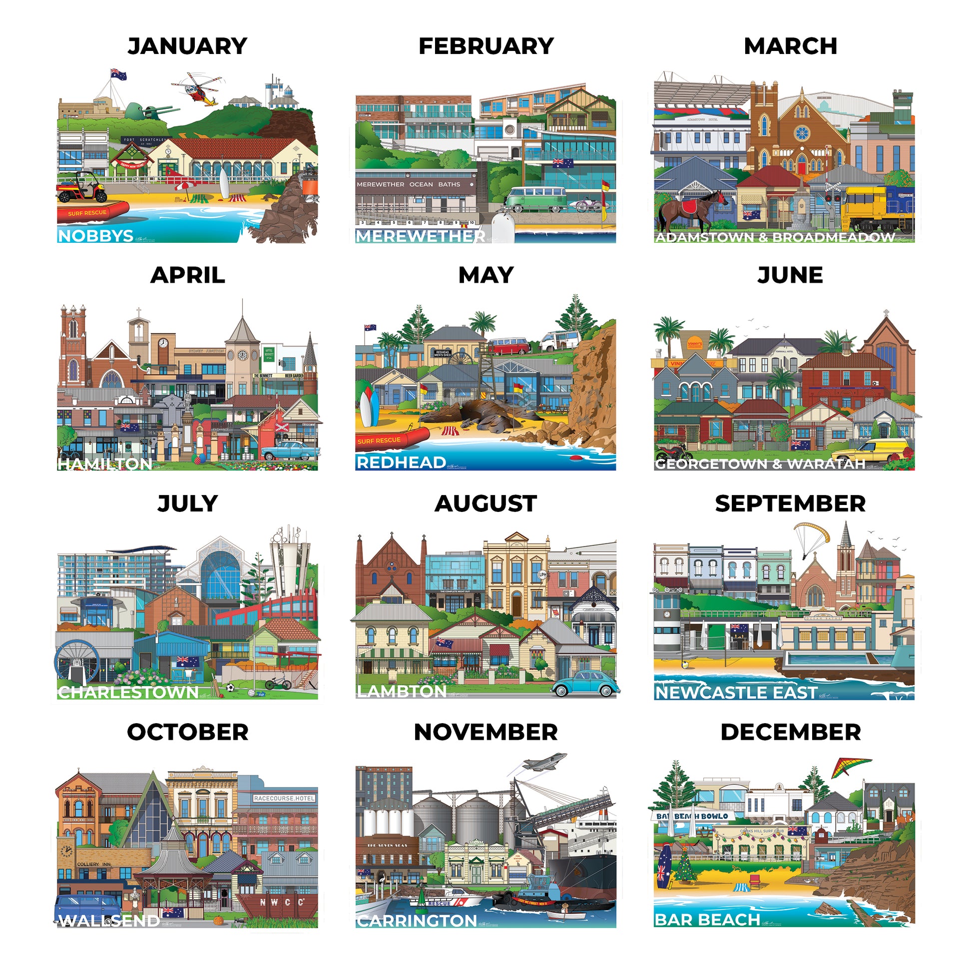Created in Newcastle, for Newcastle, this calendar will be a centerpiece of your home. Featuring one off works exclusive to this calendar, such as Bar Beach at Christmas, Charlestown, and Carrington, featuring new landmarks