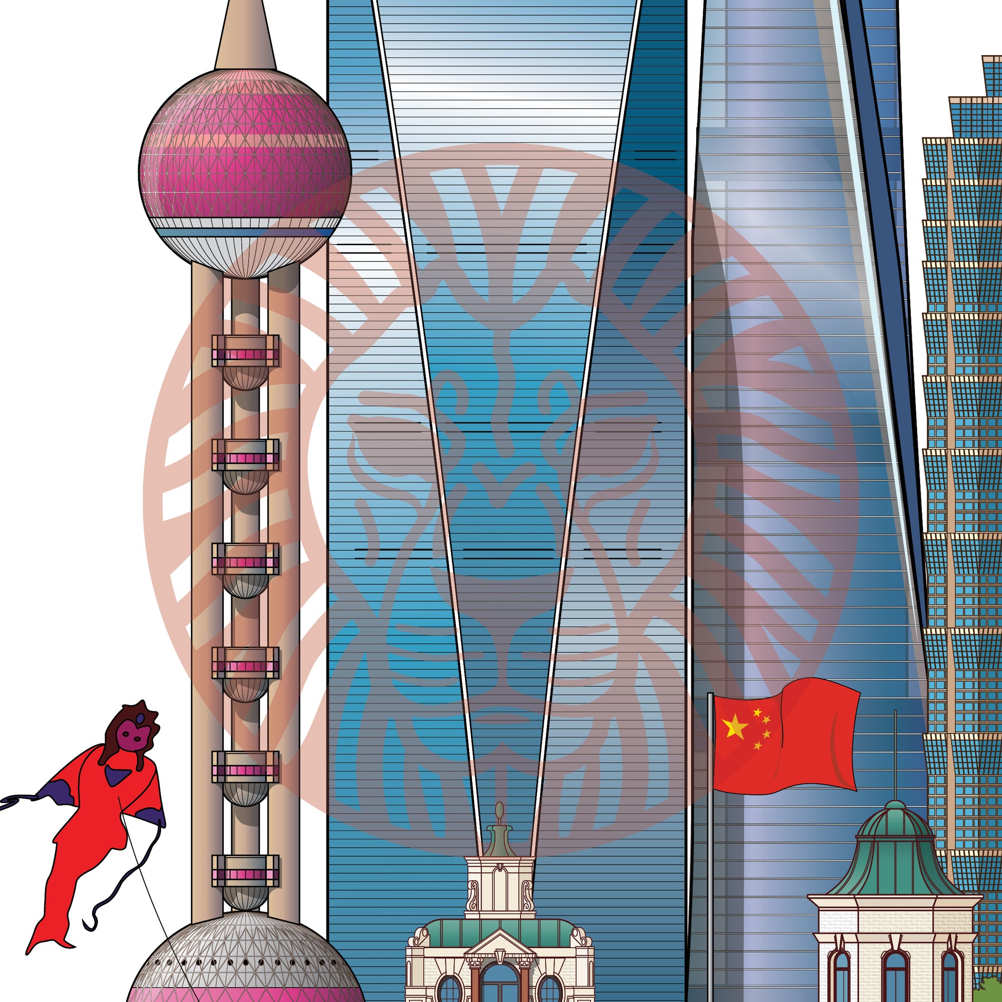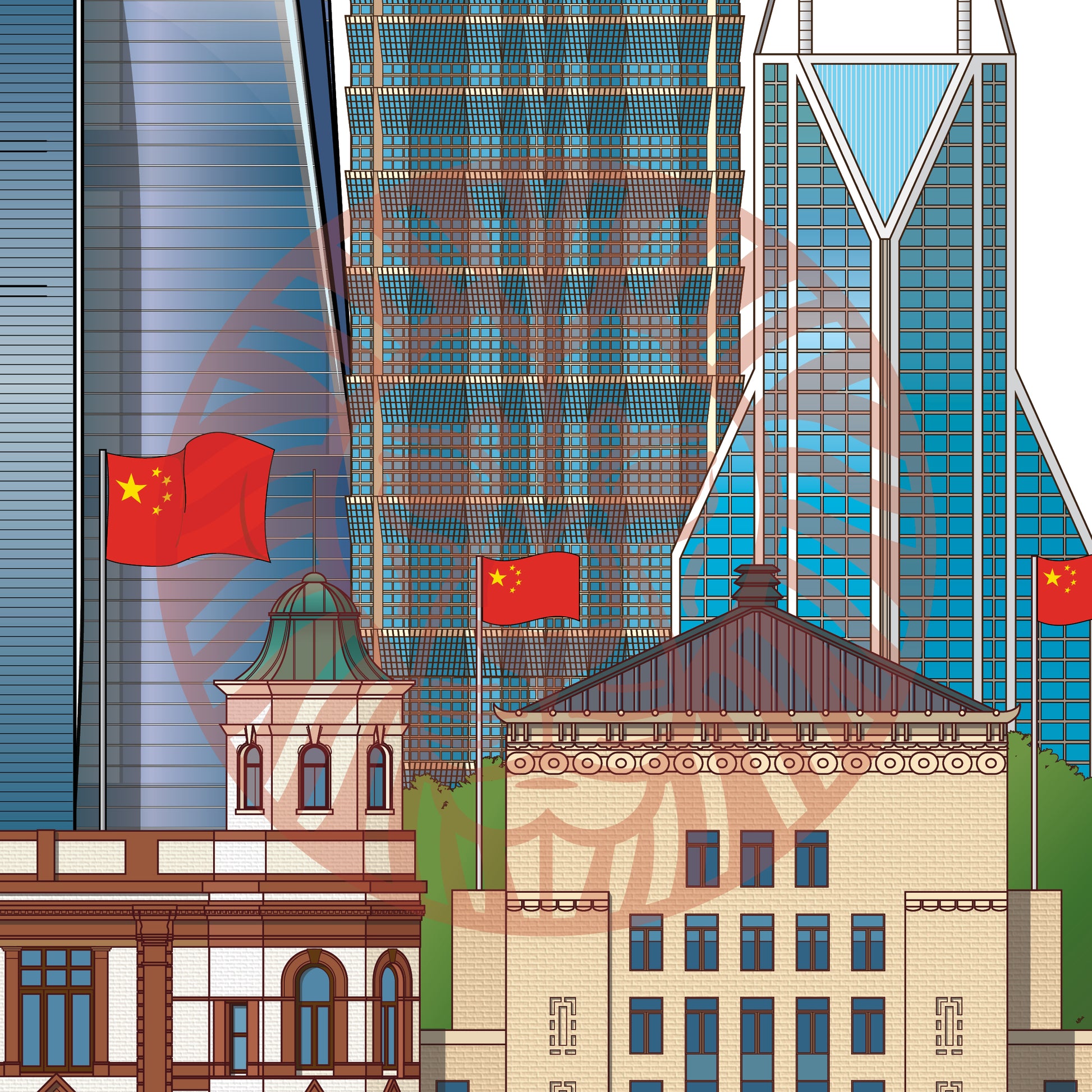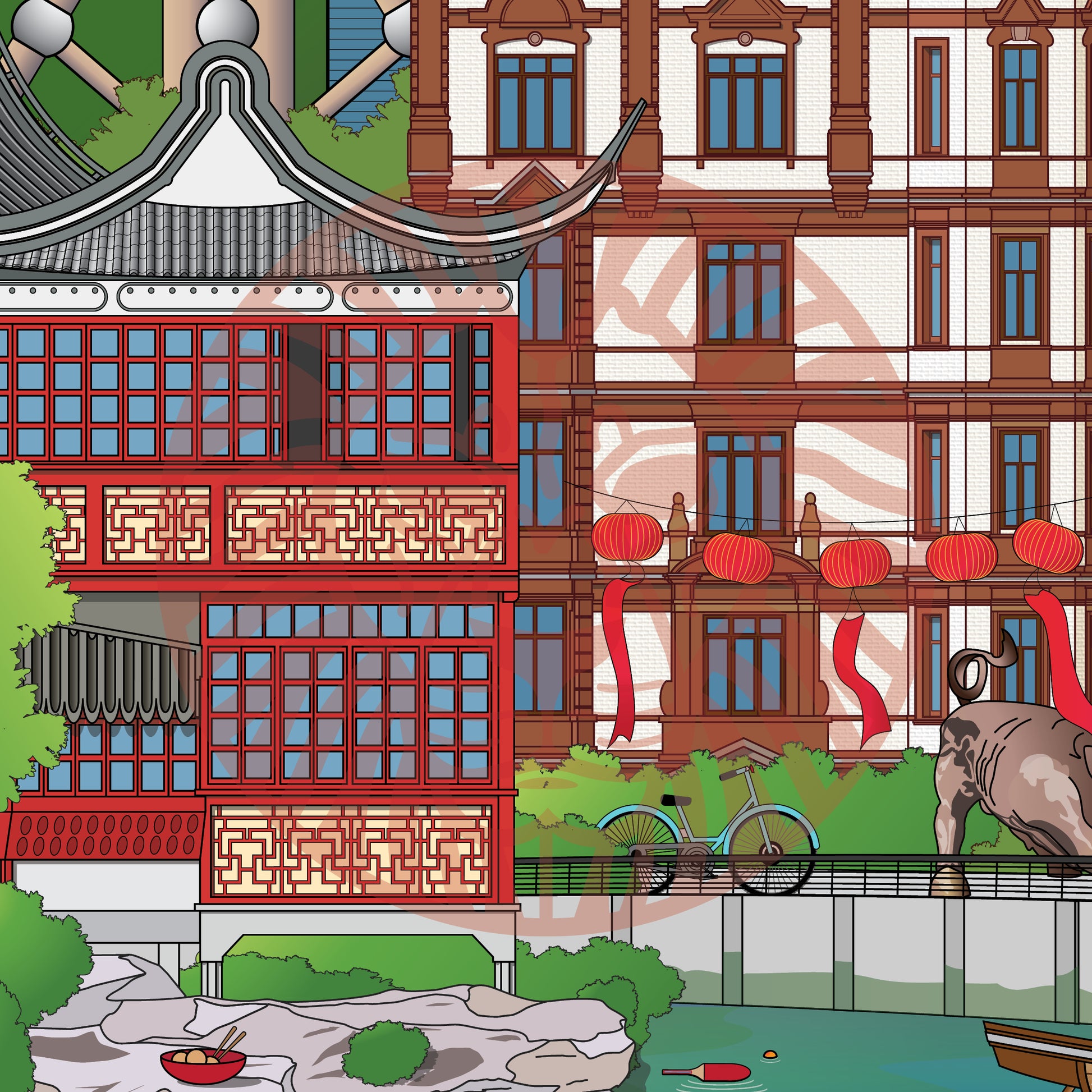 Shimao International Plaza, Chinese Kite, Bund Shorefront Buildings: The Swatch Art Peace Hotel and Bank of Shanghai Building, Yu Gardens, Huangpu River, Sampan Wooden Boat.