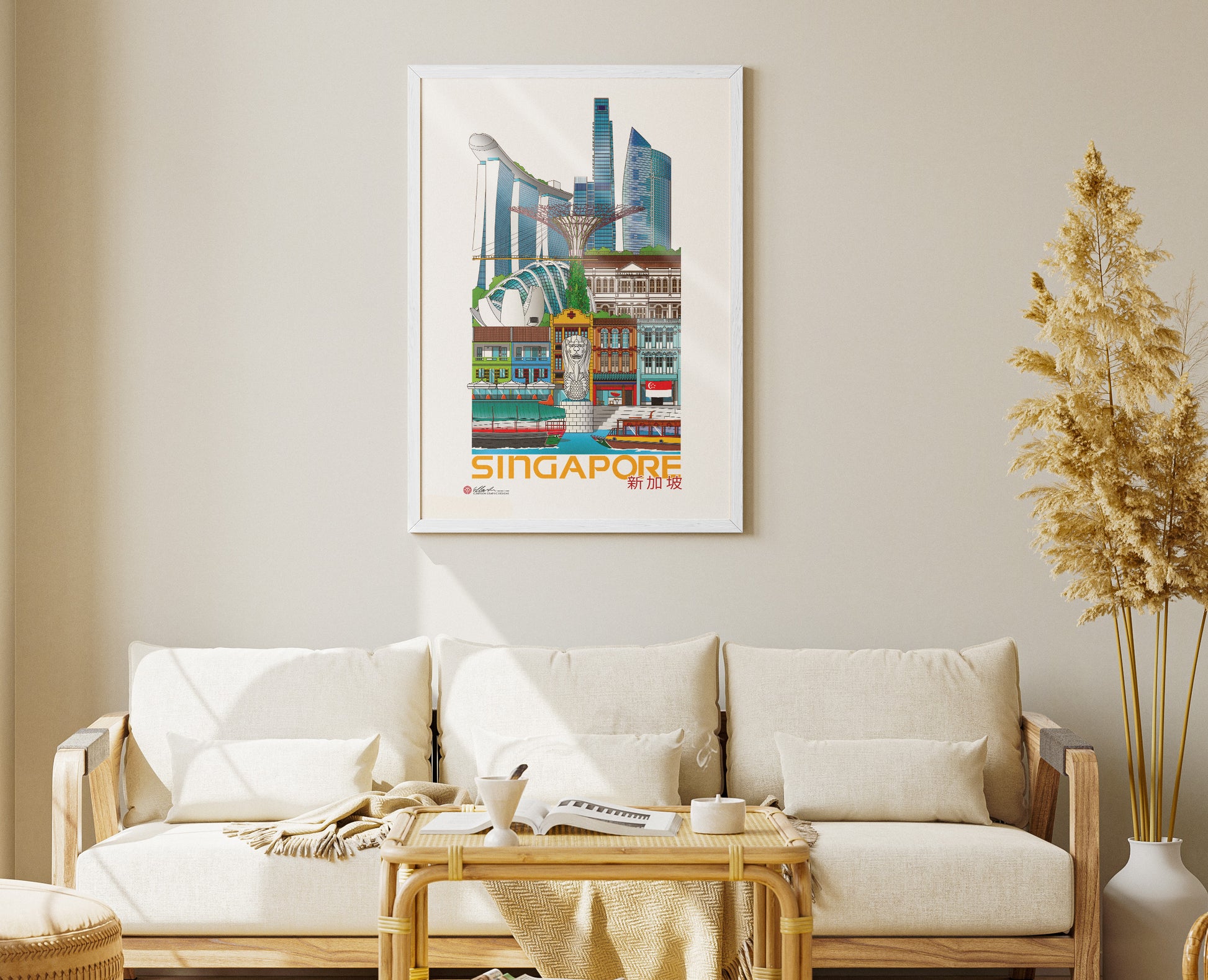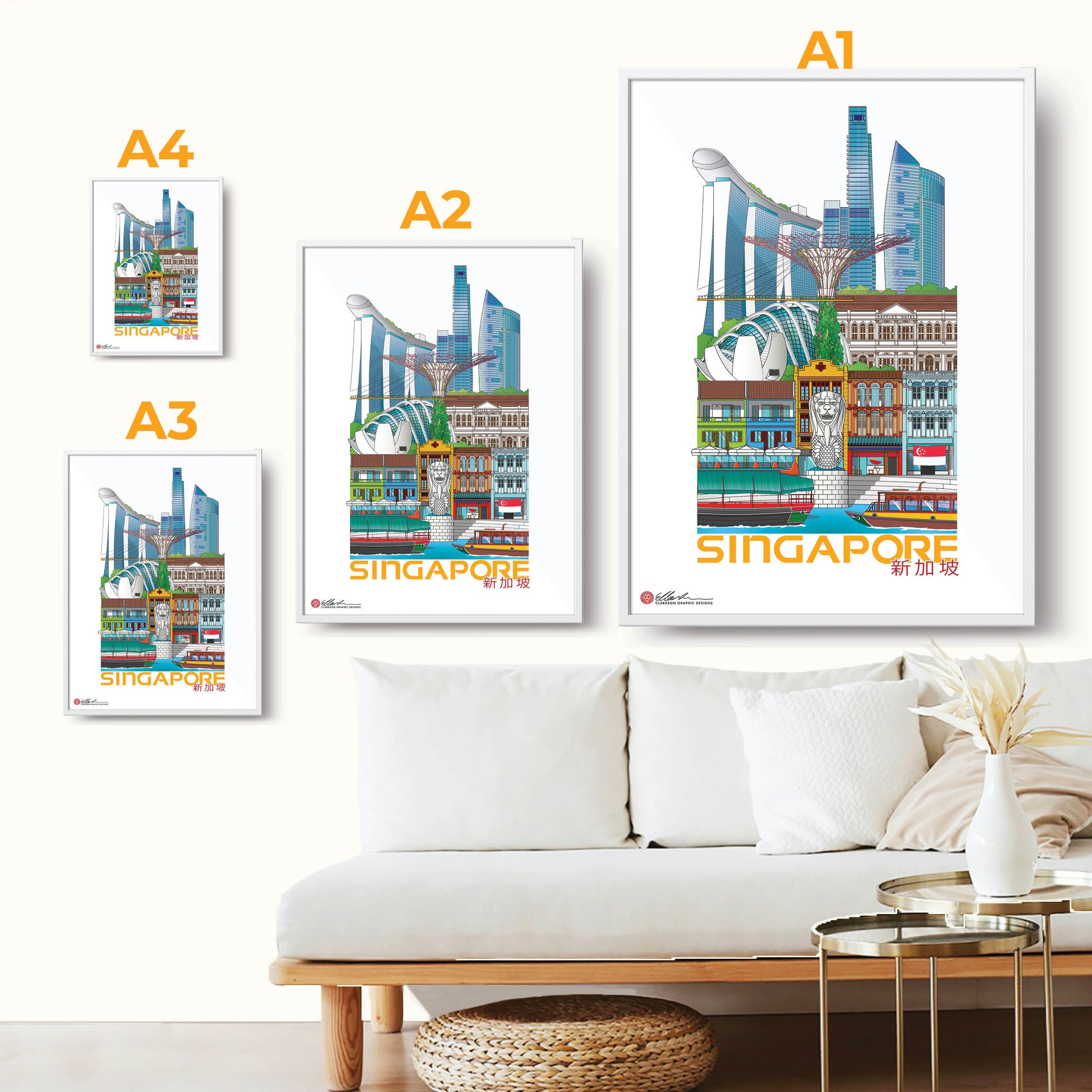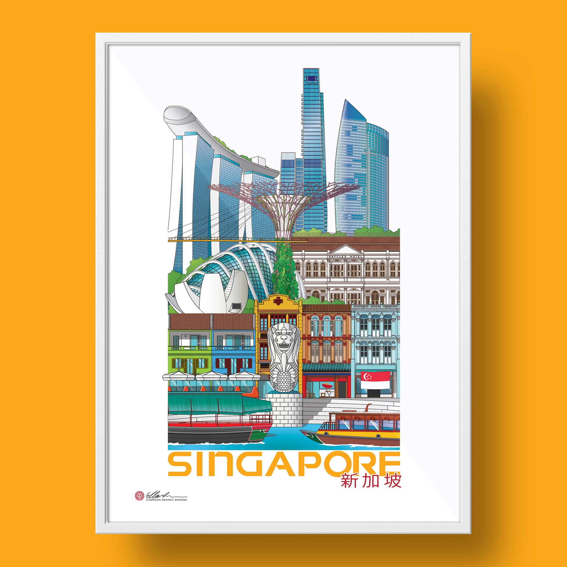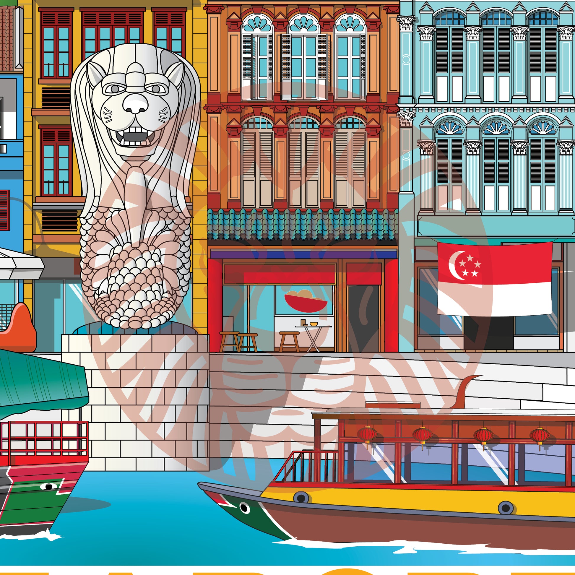 Marina Bay Sands, Guoco Tower, The Sail at Marina Bay, Flower Dome, Art Science Museum, Super Tree, Raffles Hotel, Clarke Quay, Colonial Apartments, Traditional Wooden Boats, Merlion Fountain.