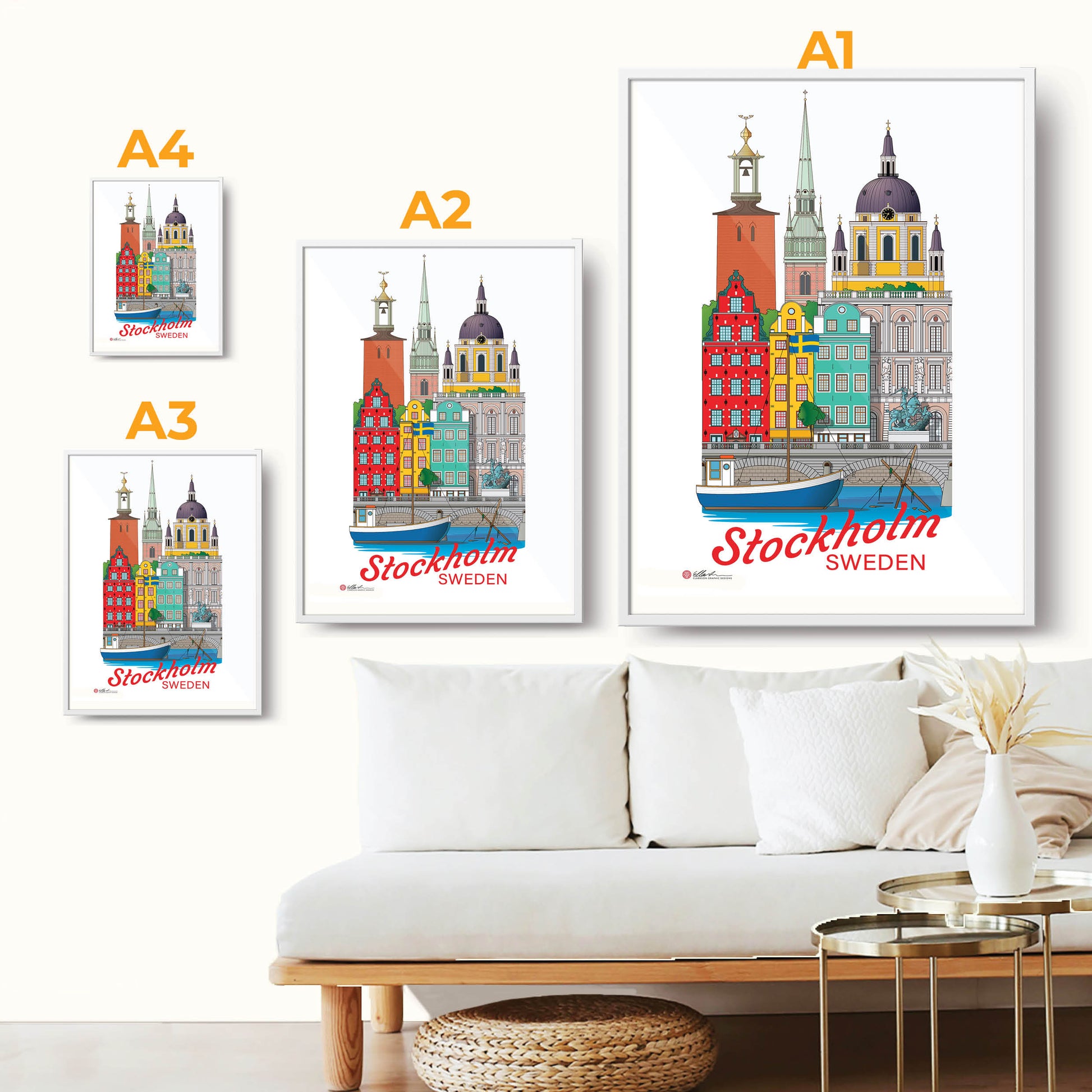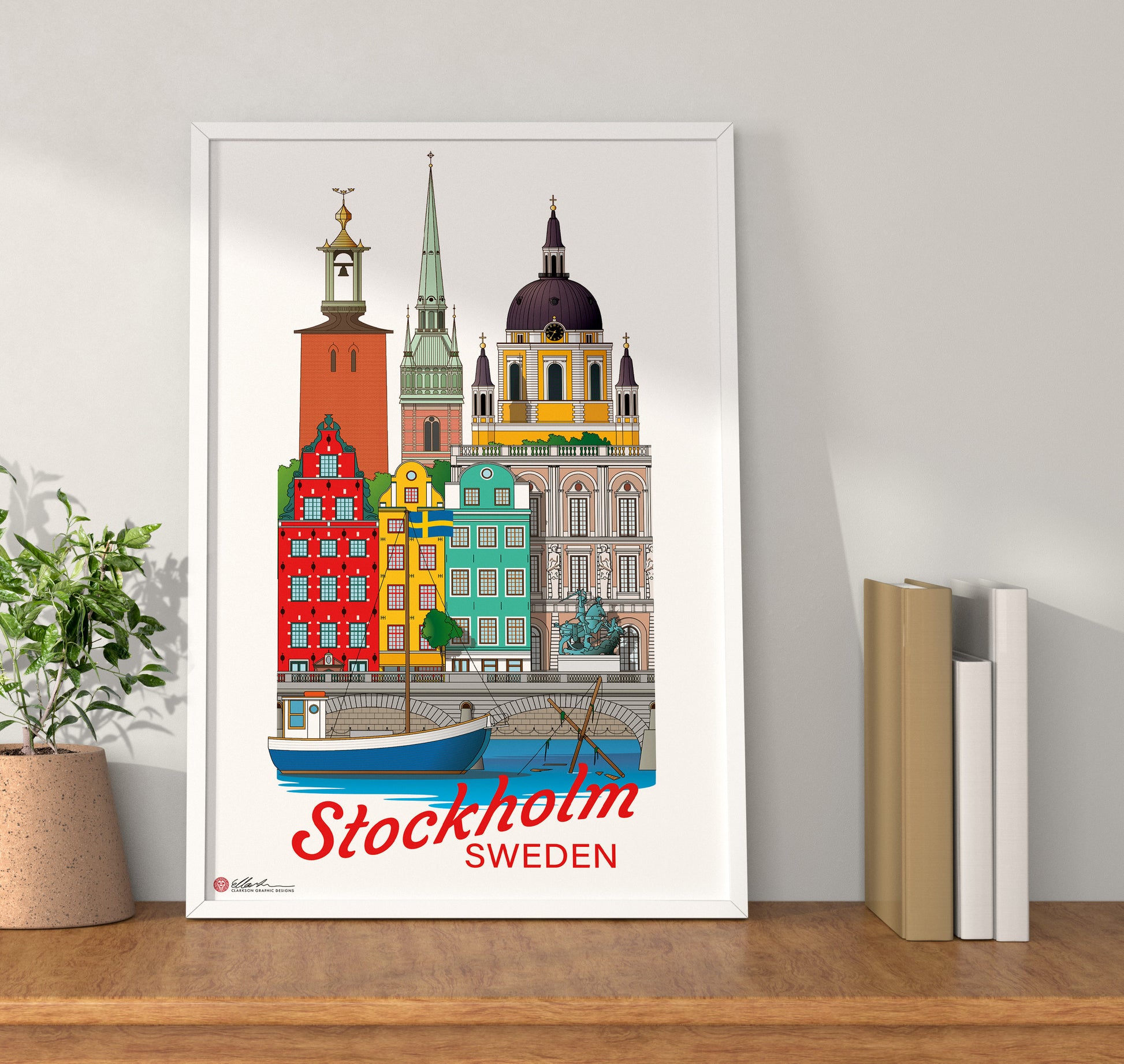 Stockholm City Hall, Iglesia Alemana, Katarina Kyrka (church), Old Town Apartments, The Royal Palace, Norrbro (bridge), Swedish fishing boat, The Vasa ship.