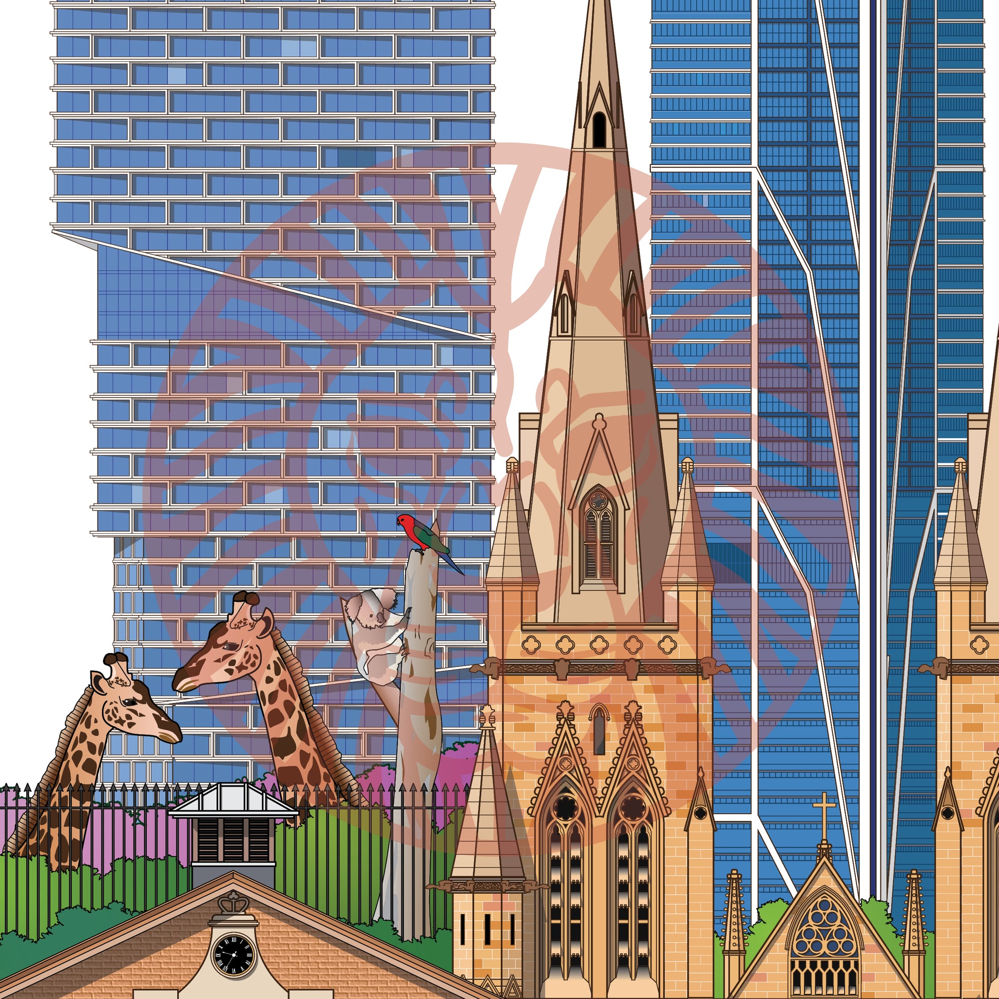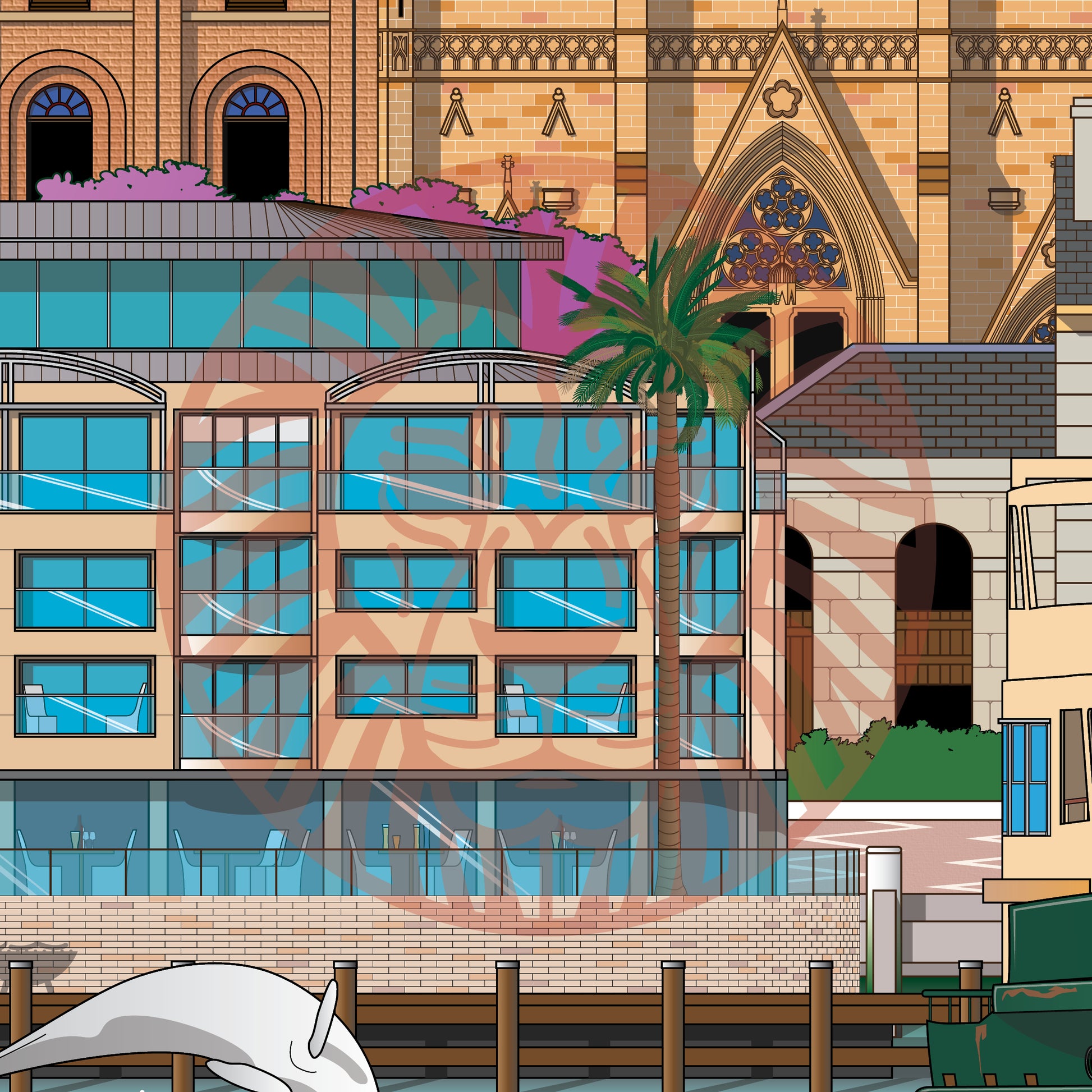 Quay Quarter Tower, Salesforce Tower, The General Post Office Clock Tower, Boomerang, Taronga Zoo, Hyde Park Barracks, St Mary's Cathedral, Registrar-General's Building, Park-Hyatt Sydney, Cadmans Cottage, Bottlenose Dolphin, Manly Ferry.