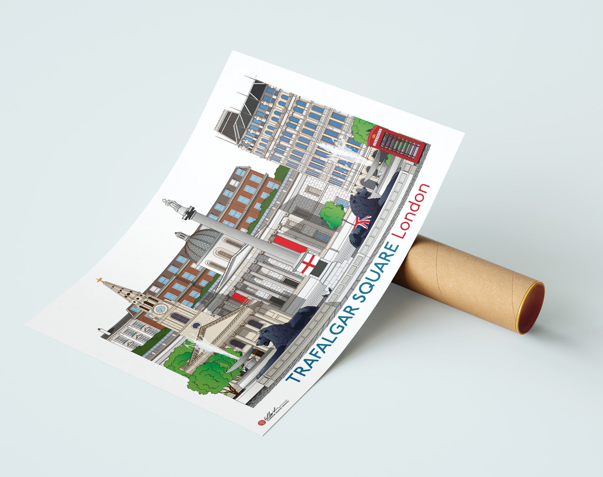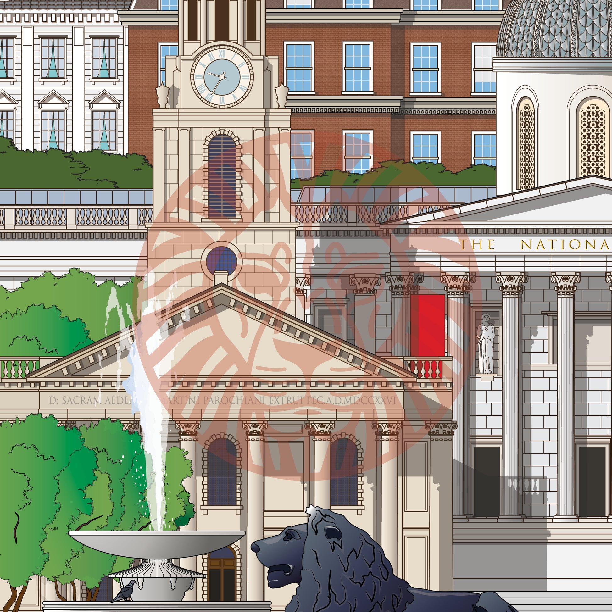 Whitehall buildings, Grand Buildings Trafalgar, St Martin in the fields Church, The National Gallery, Trafalgar Founts, Nelson's Column and the Landseer Lions, Telephone Box.