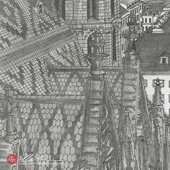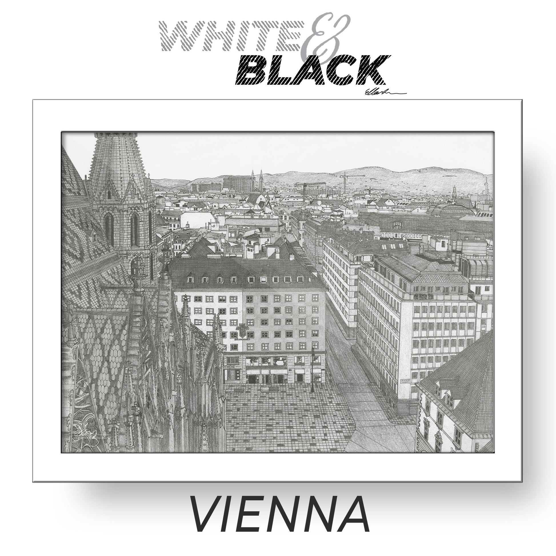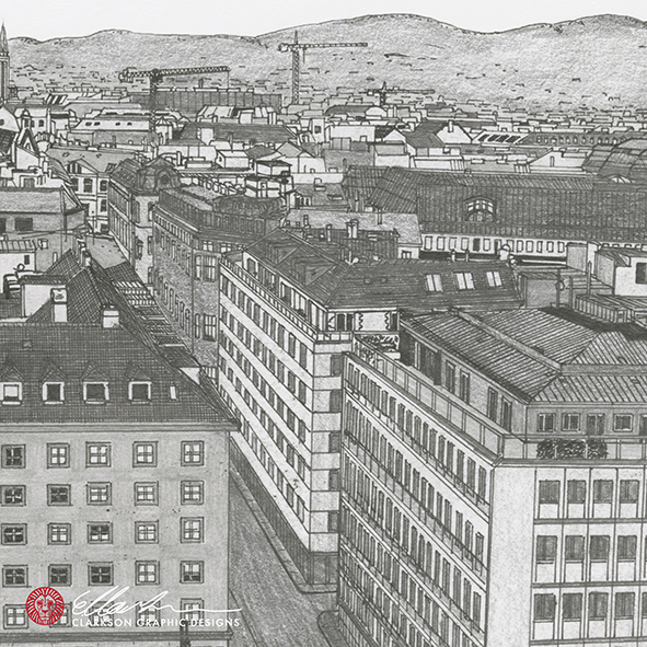This artwork is of the Innere Stadt, looking northeast from St. Stephen's Cathedral.