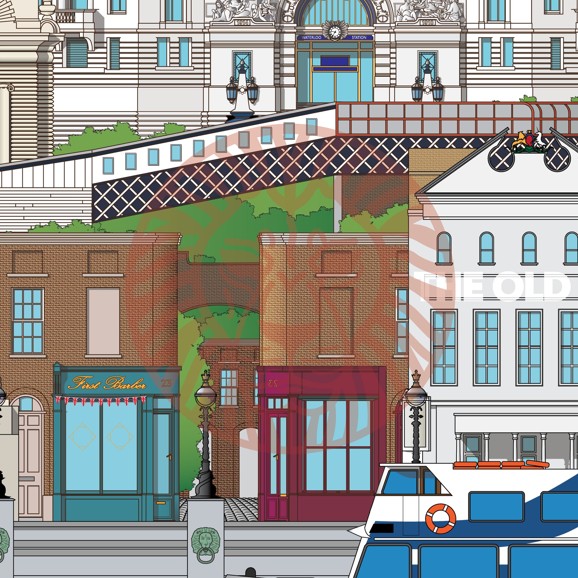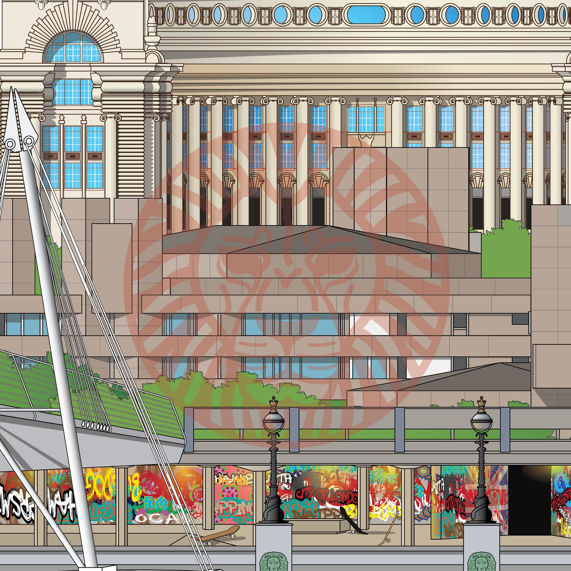 County Hall, Waterloo Station, National Theatre, 22-23 Cornwall Road and overpass, The Old Vic, Golden Jubilee Bridge, Southbank Skate Space, South Bank Lion, London River Cruise.